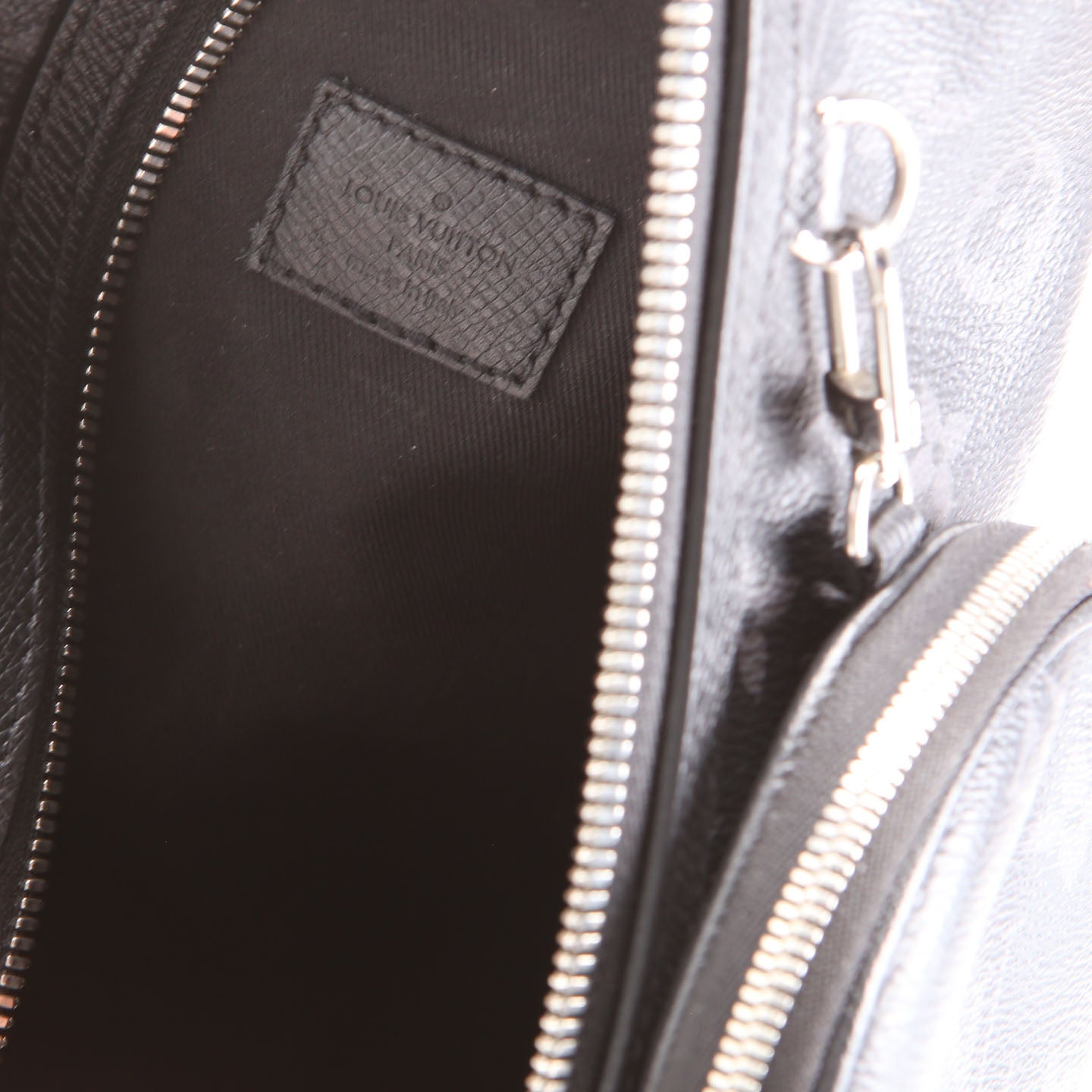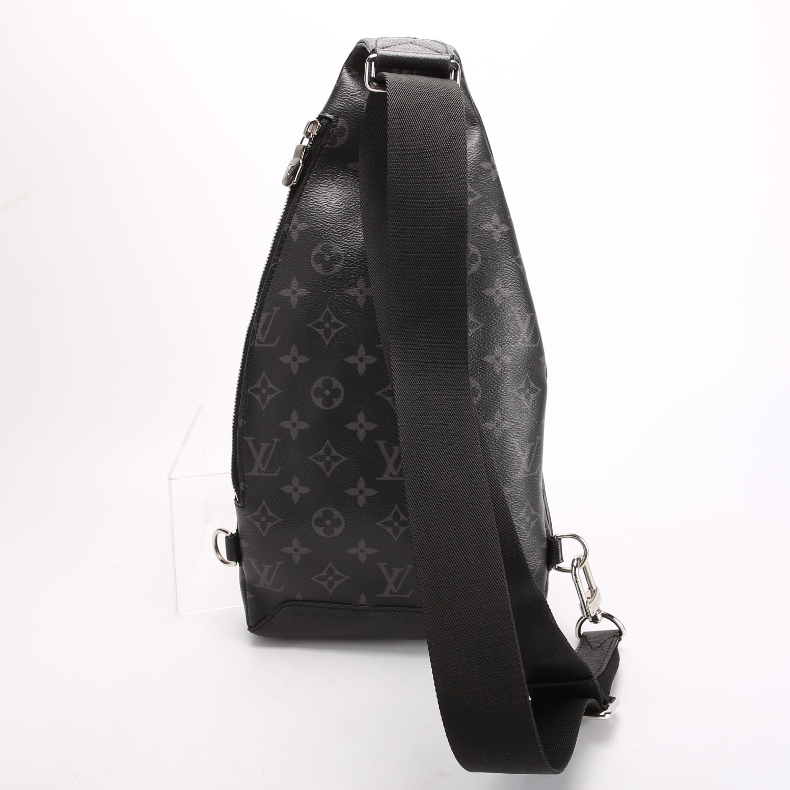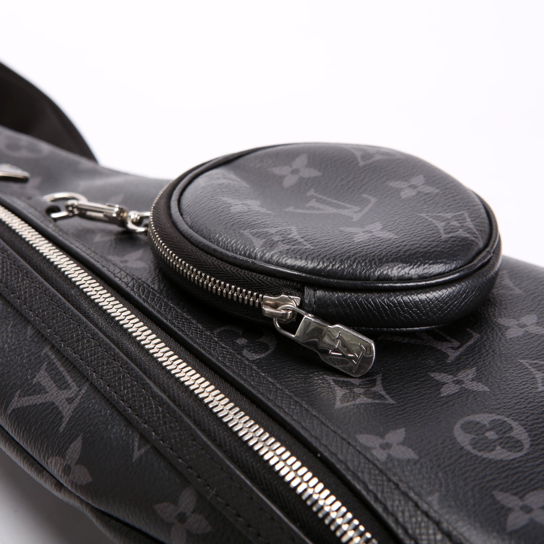 This pre-owned Louis Vuitton Duo Slingbag Monogram Eclipse is guaranteed 100% authentic. The exterior is in the classic Louis Vuitton Monogram coated canvas.