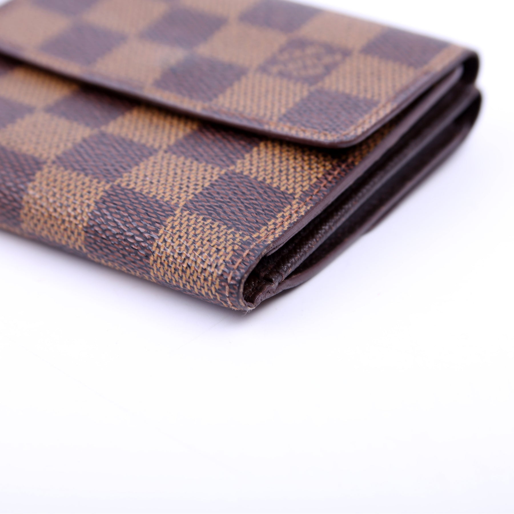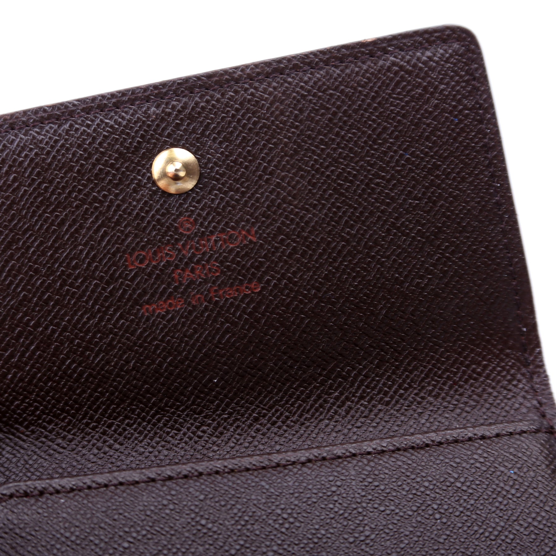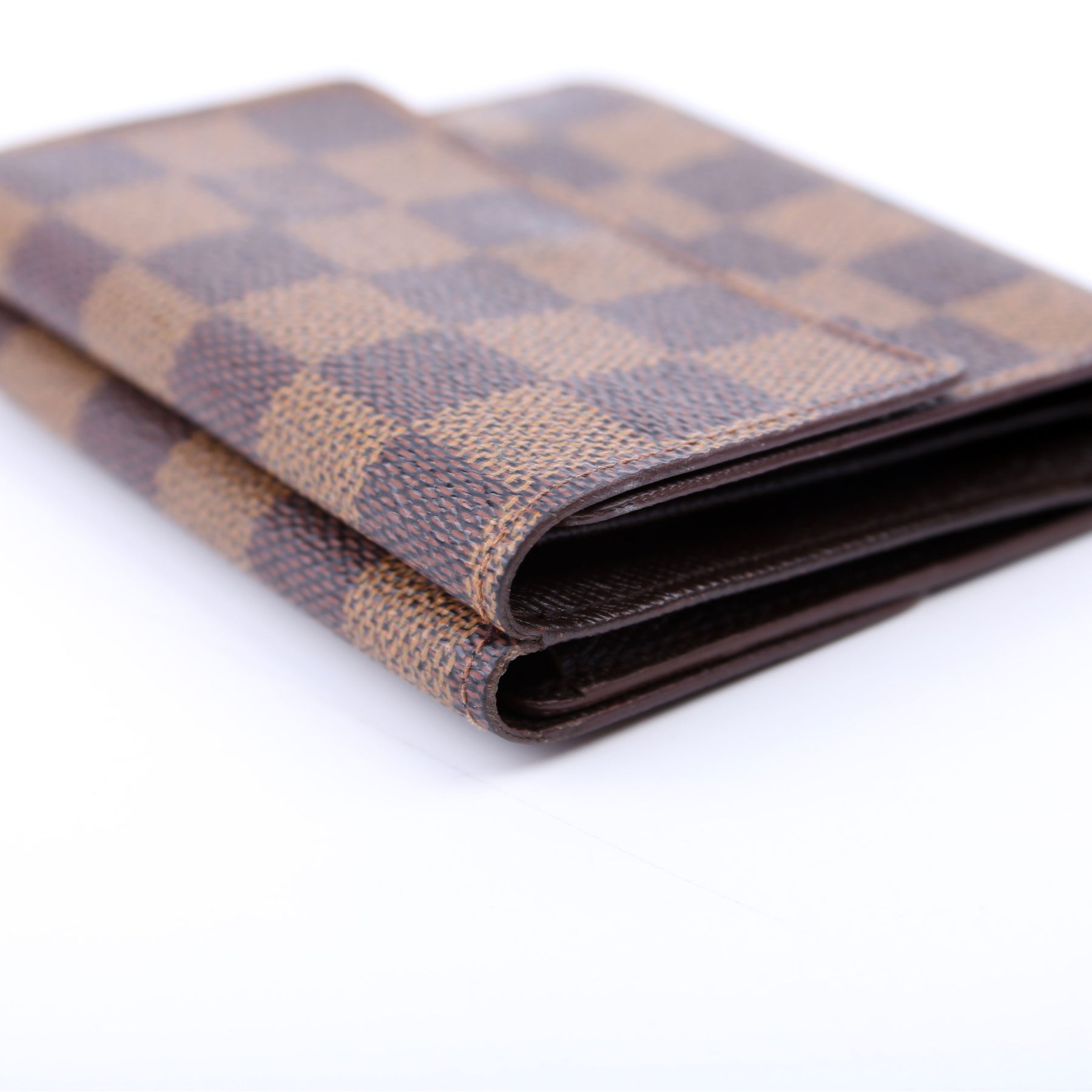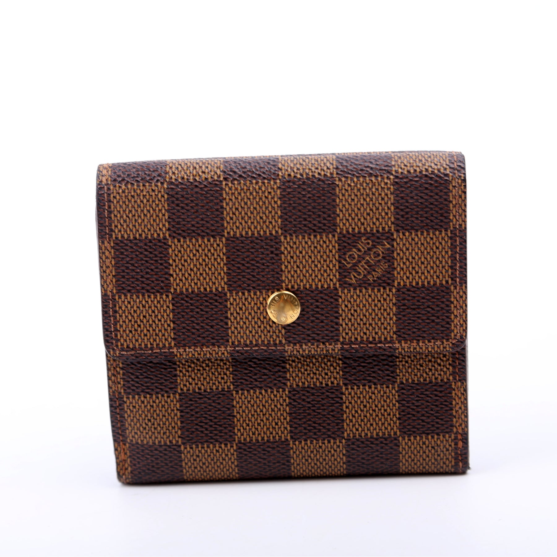 This pre-owned Louis Vuitton Elise Wallet is guaranteed 100% authentic. The exterior is in the classic Louis Vuitton Damier Ebene coated canvas.