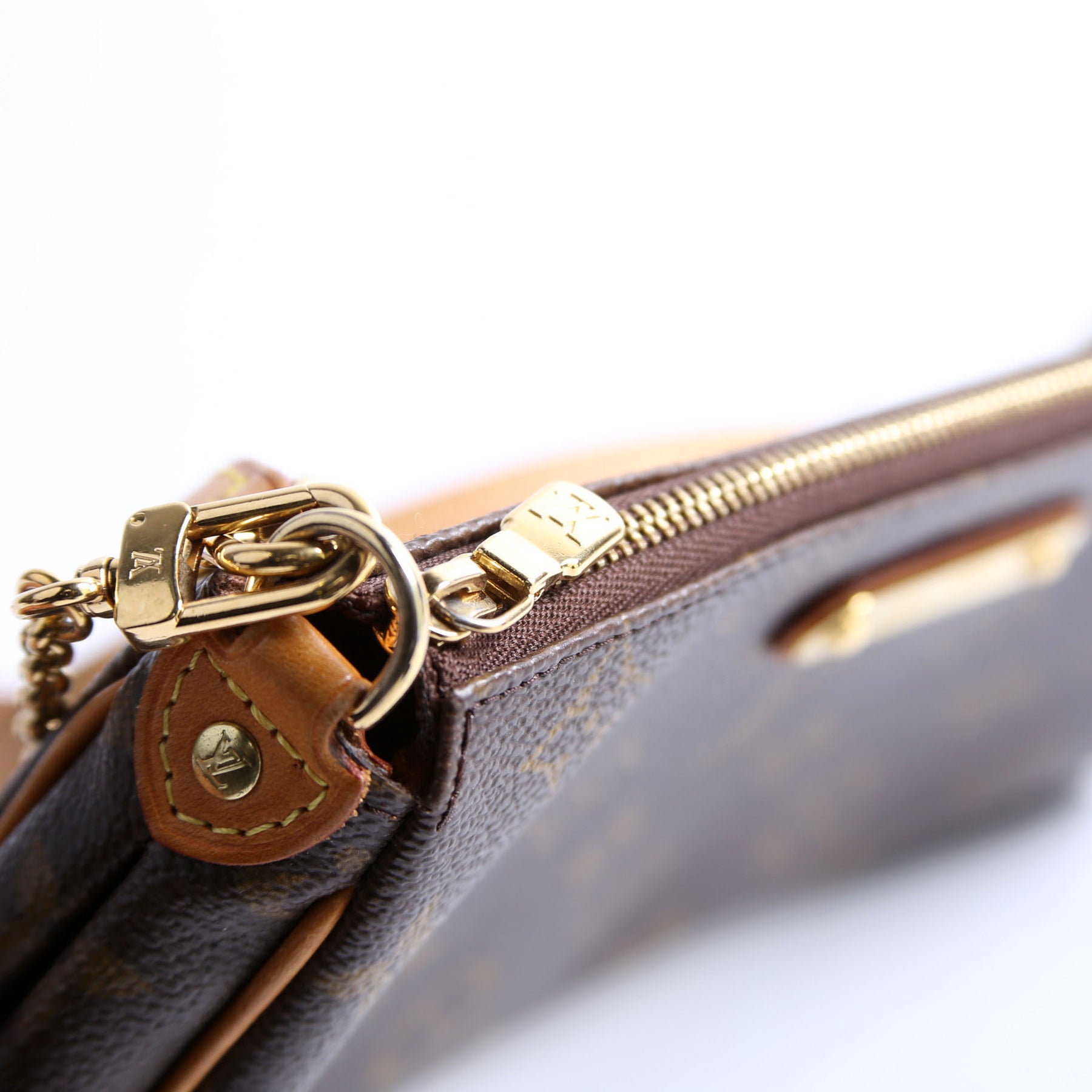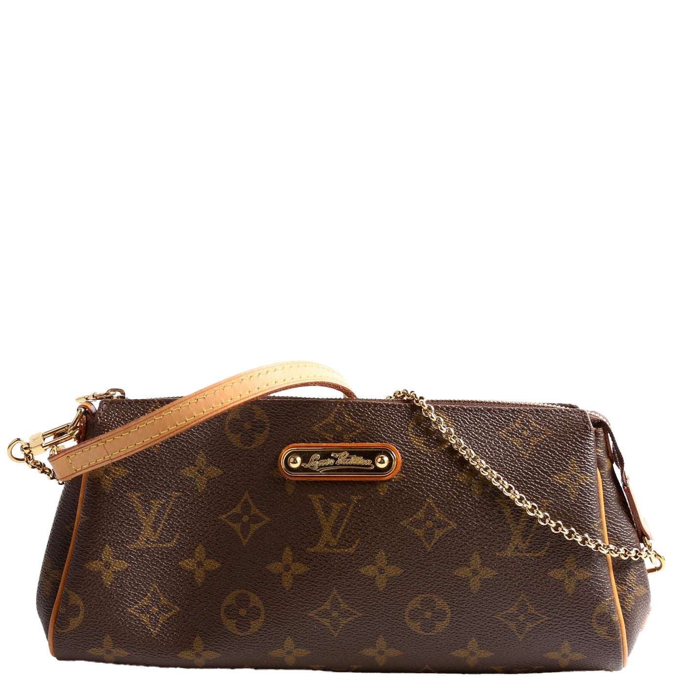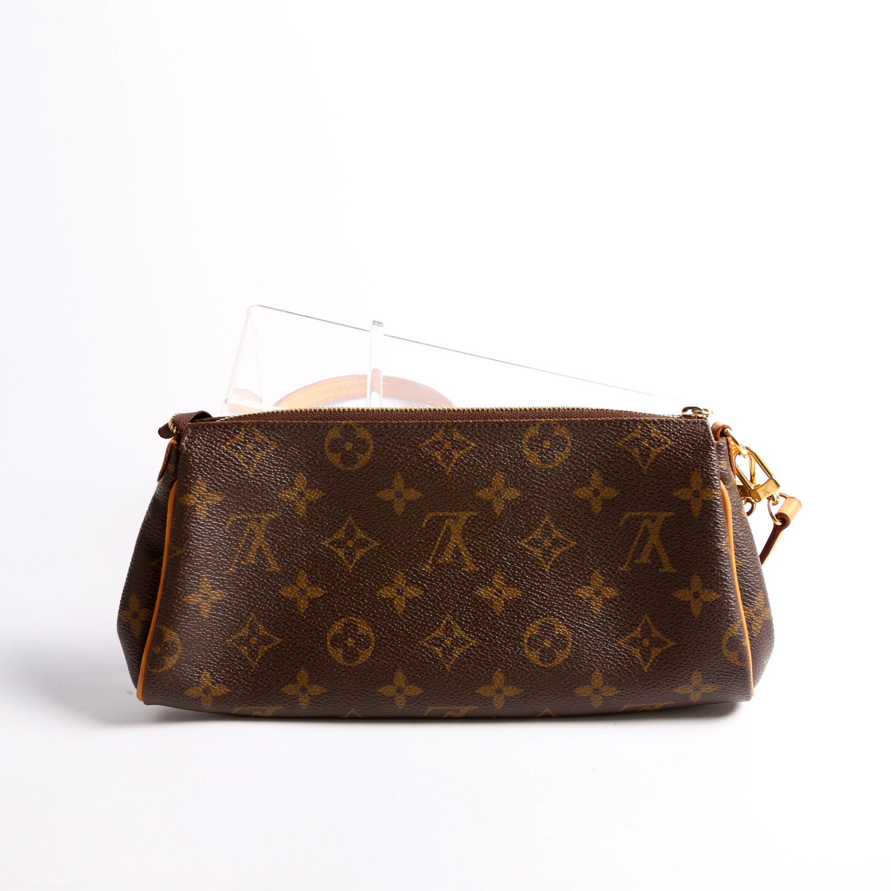 This pre-owned Louis Vuitton Eva Clutch is guaranteed 100% authentic. The exterior is in the classic monogram coated canvas.