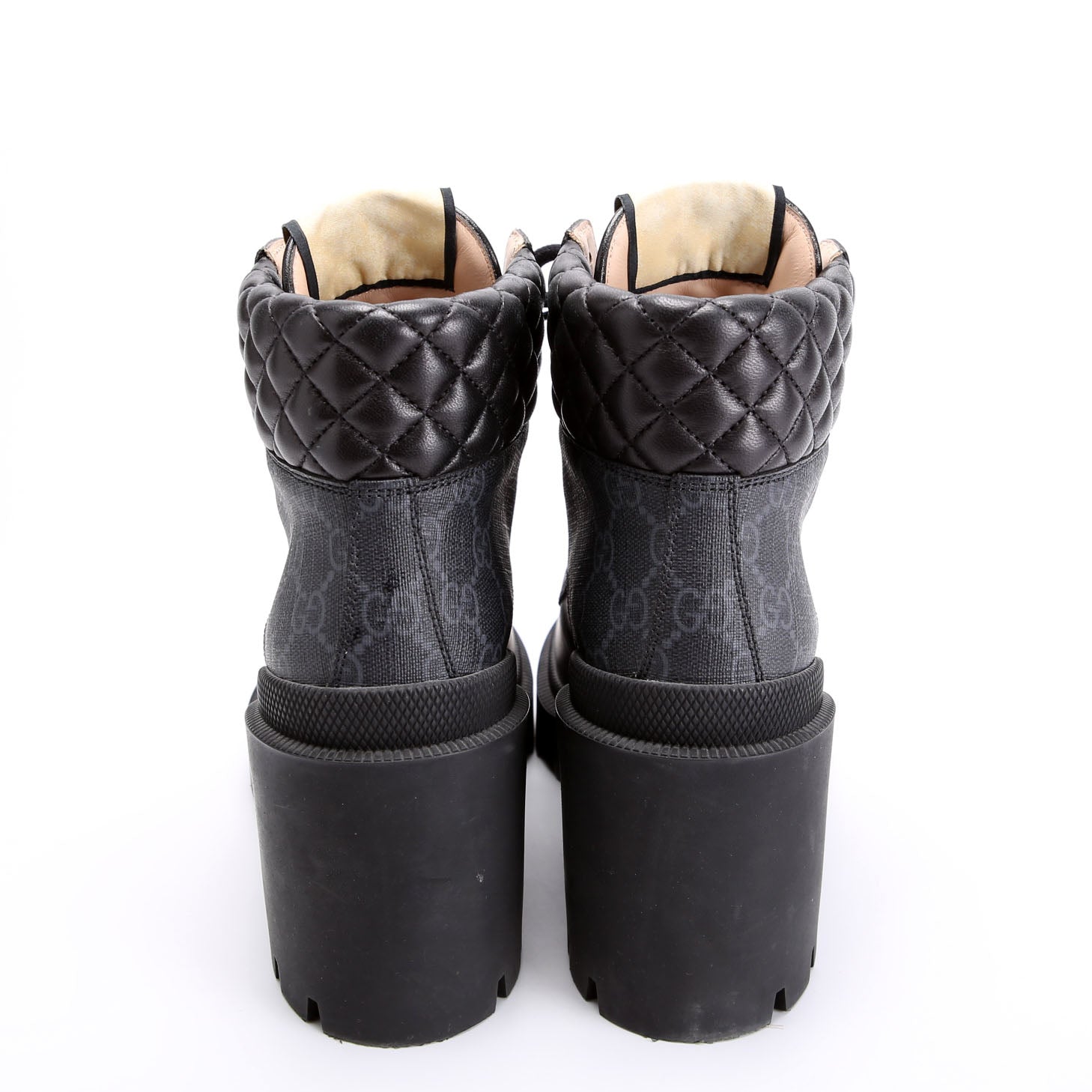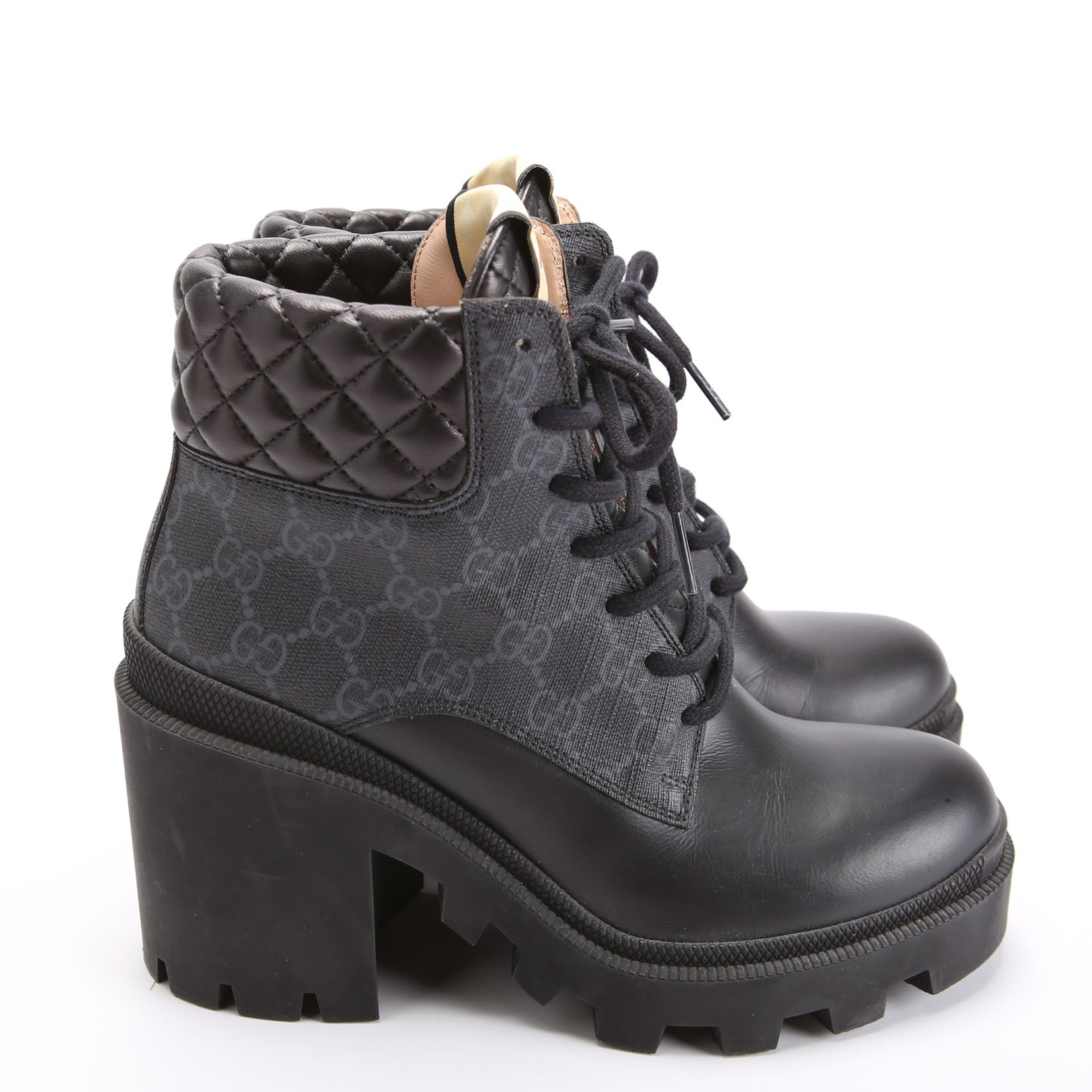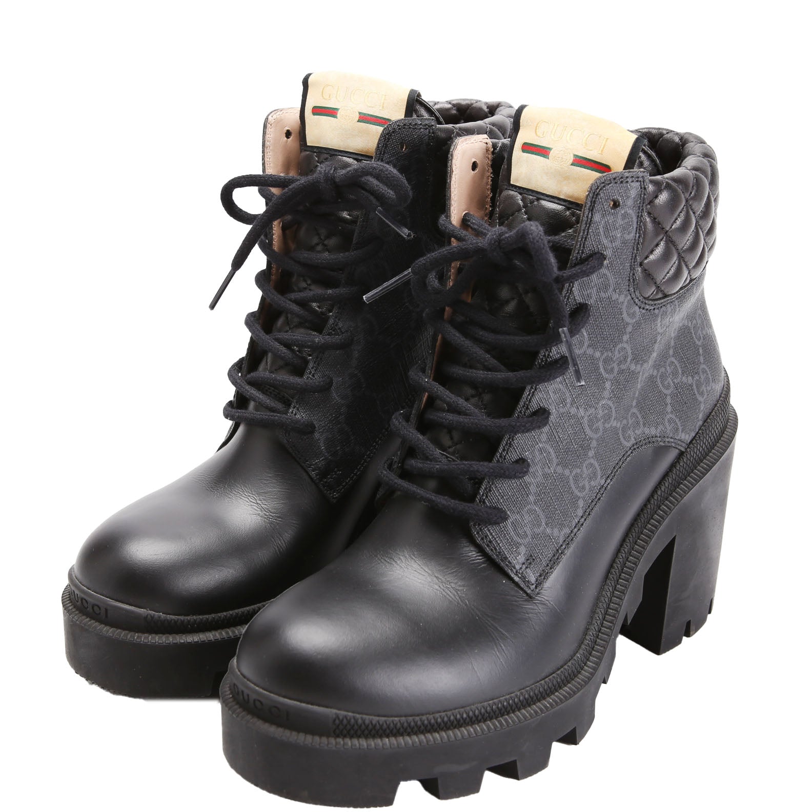 These pre-owned Gucci GG Supreme/Quilted Leather Lace Up Ankle Boots are guaranteed 100% authentic.