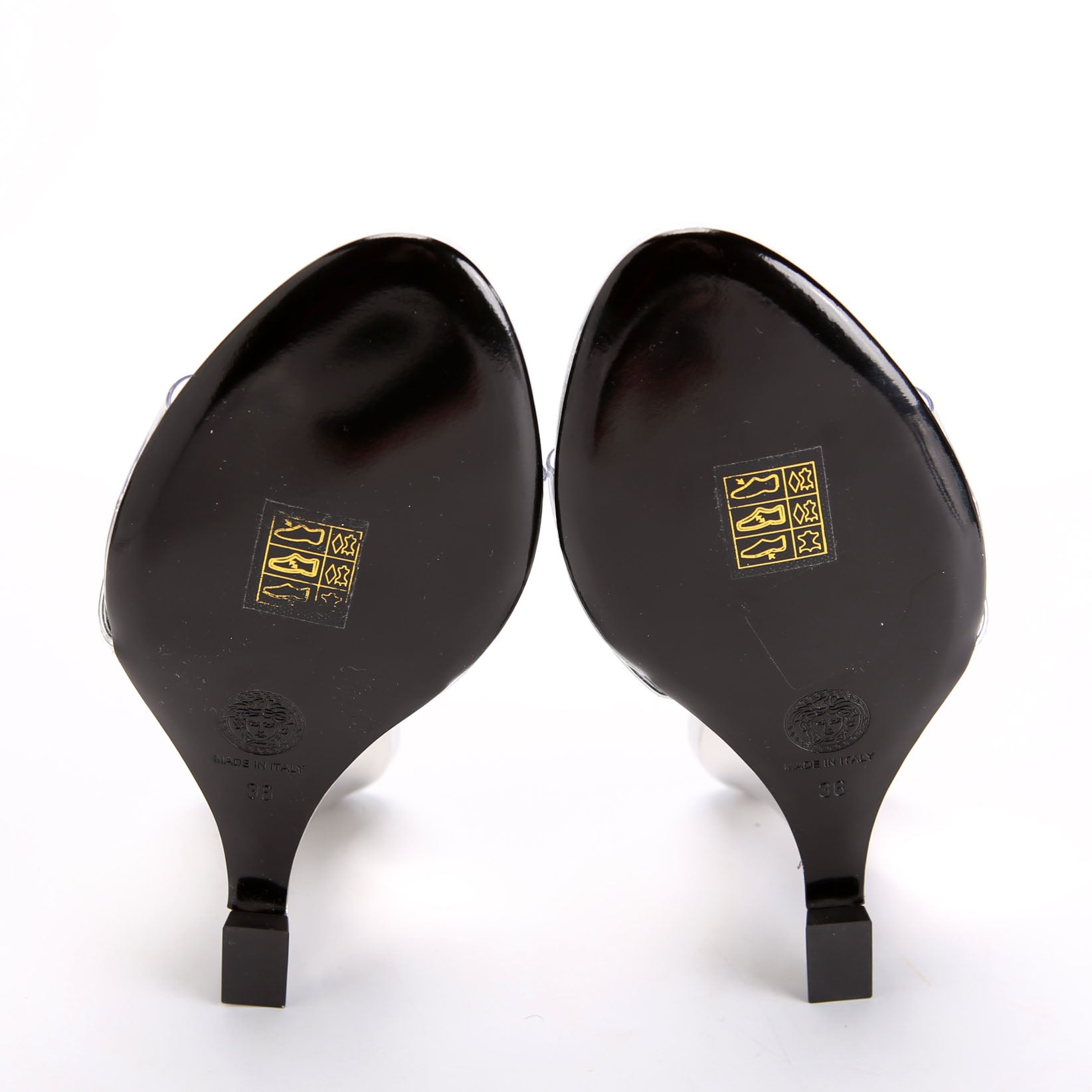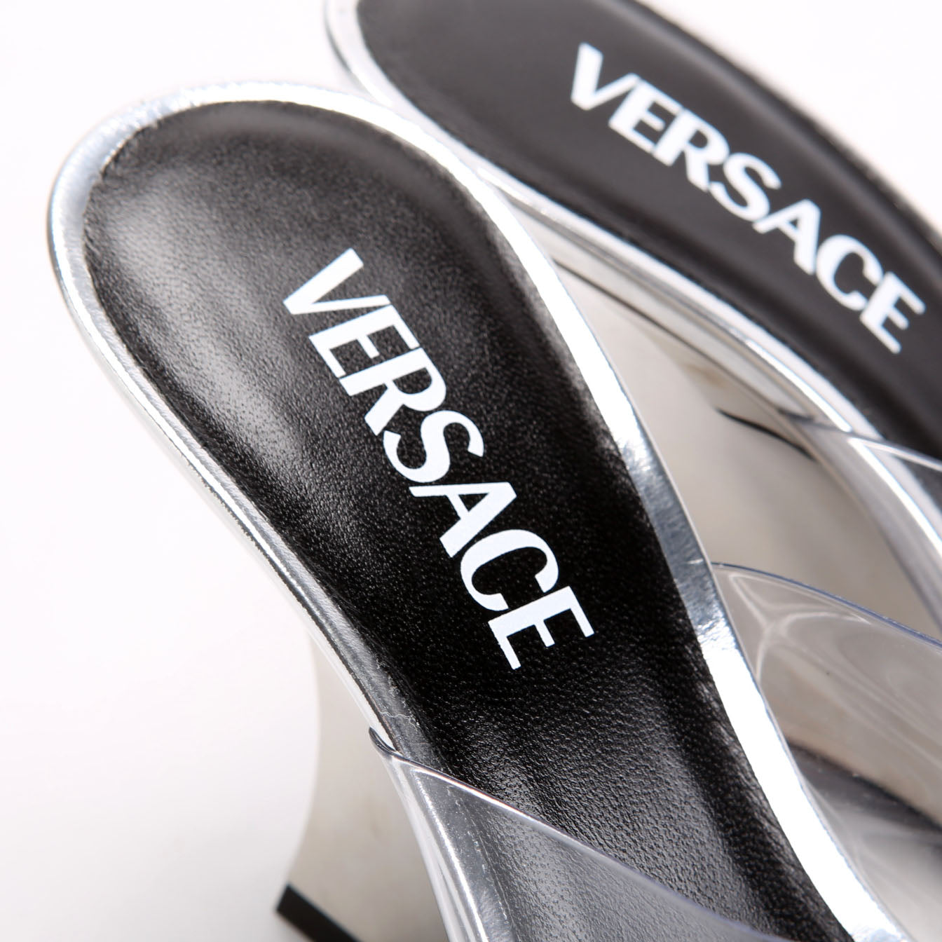 These pre-owned Versace Gianni Ribbon 95MM Wedge Mule are guaranteed 100% authentic.