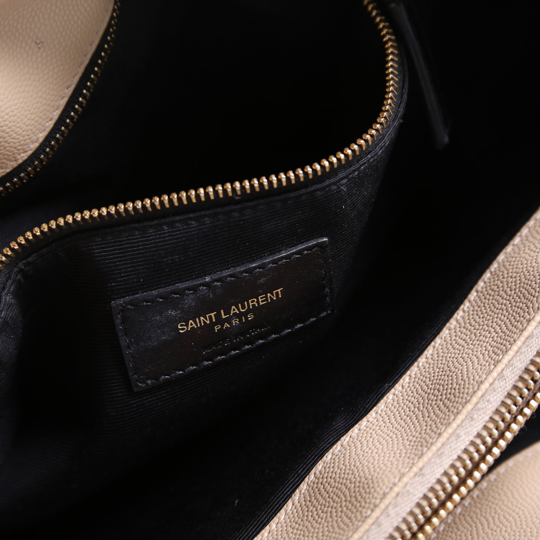Interior: The interior shows staining throughout. It features two open sections, one zip closure section, and one zip closure pocket.