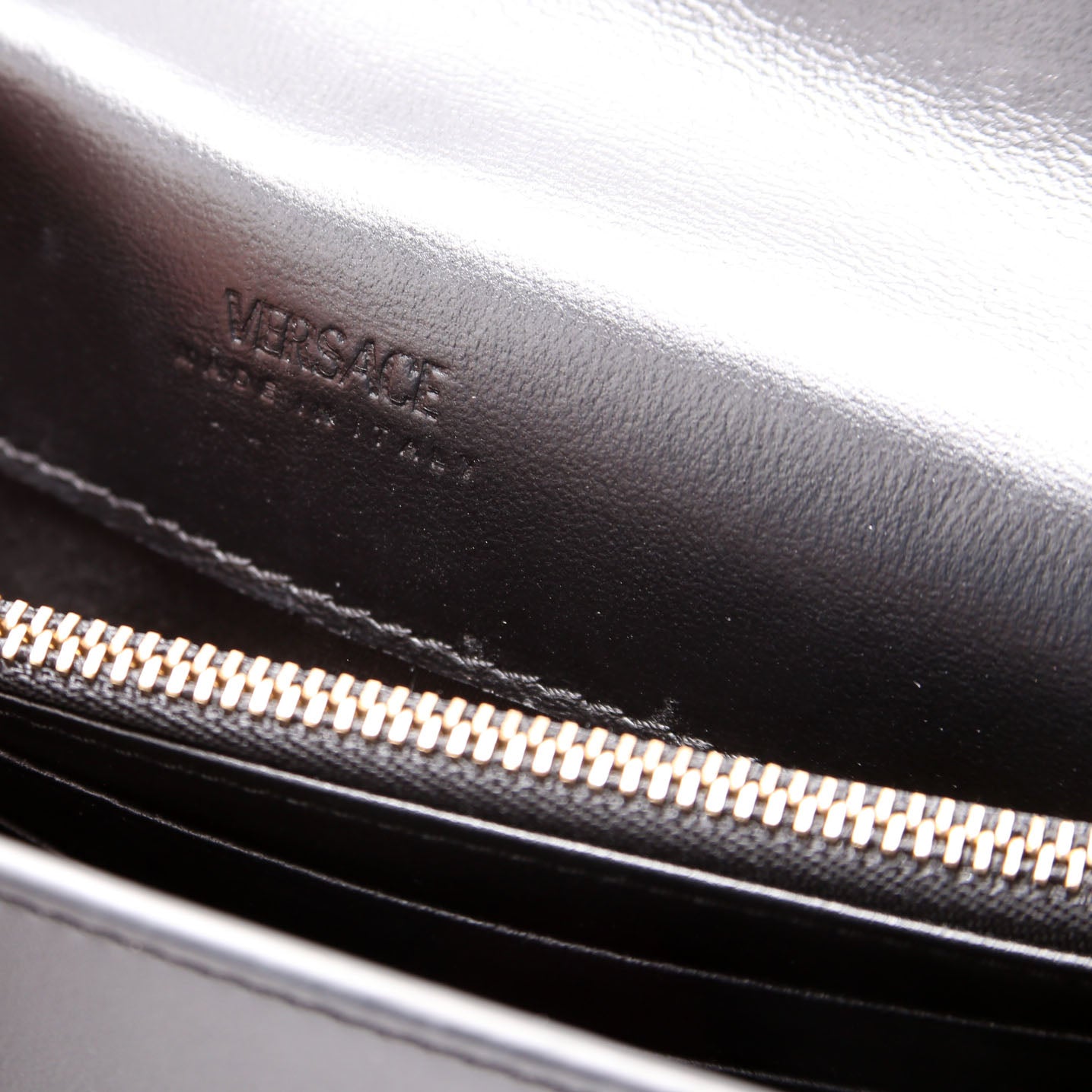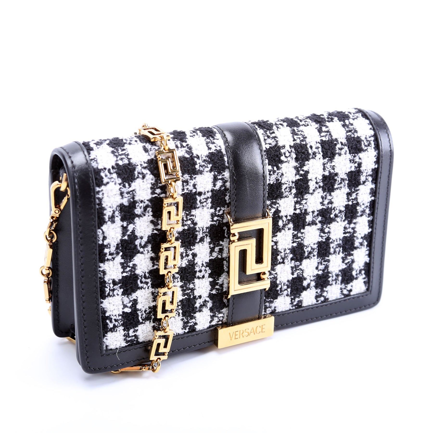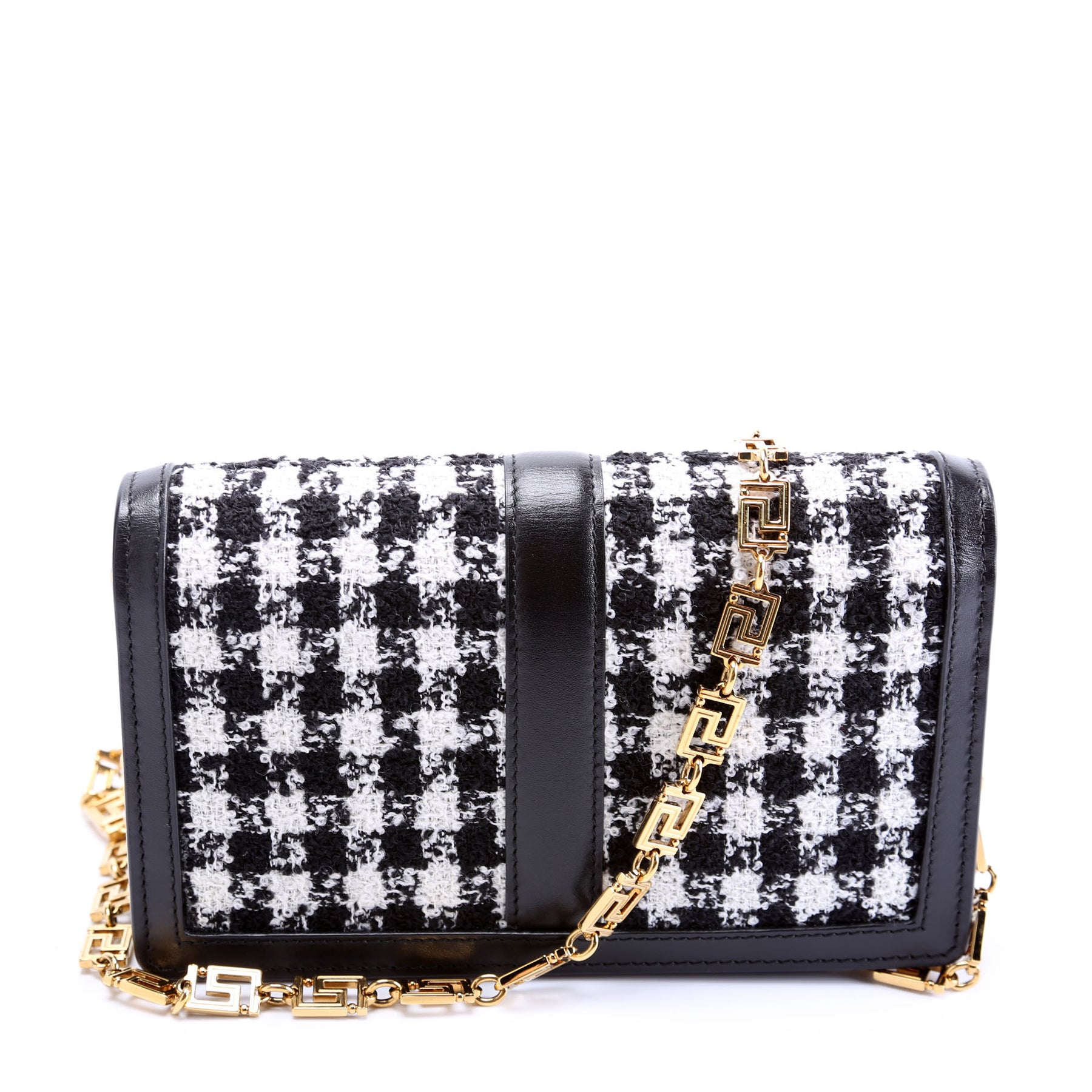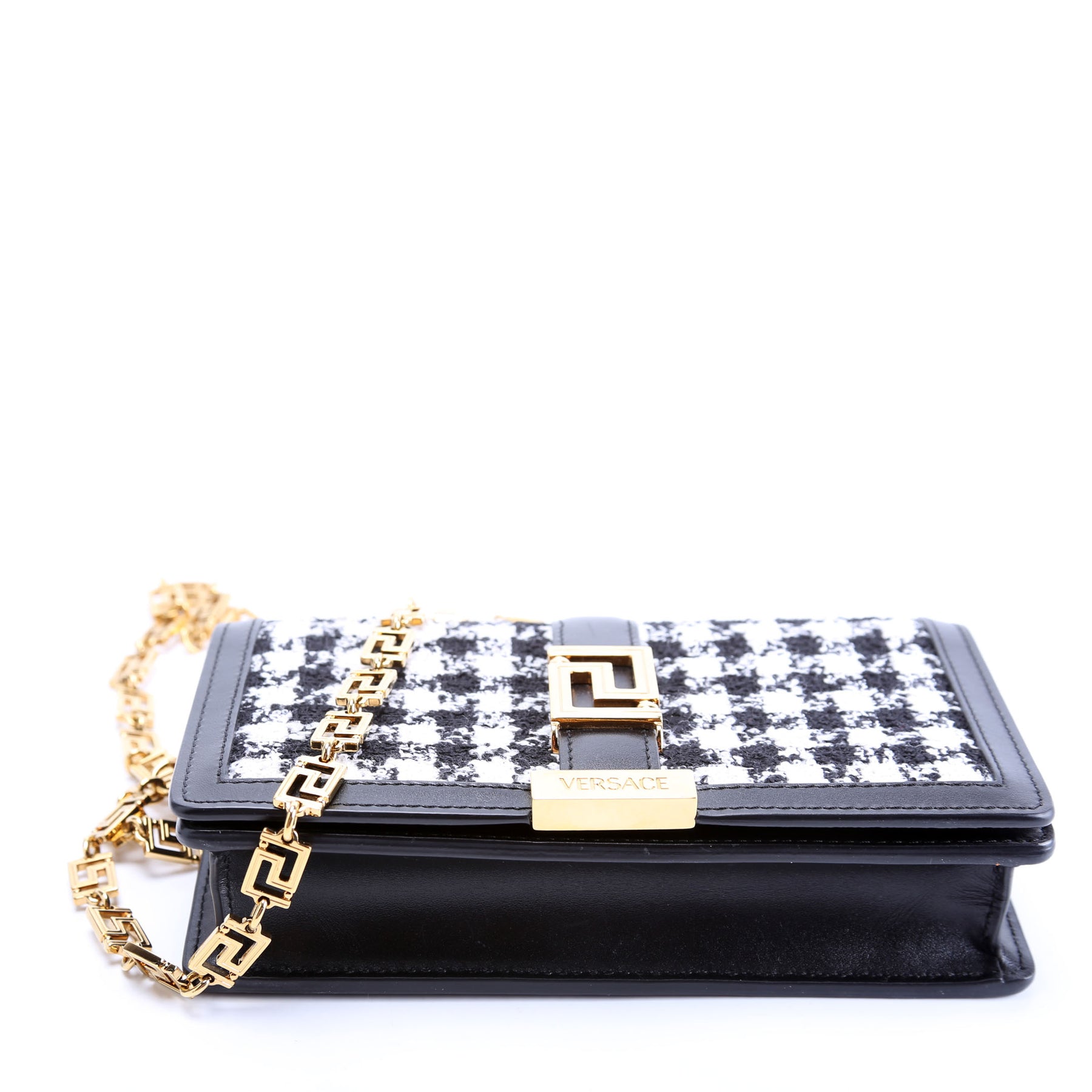 This pre-owned Versace Greca Goddess Wallet On Chain is guaranteed 100% authentic. The exterior is in the classic Versace Houndstooth.