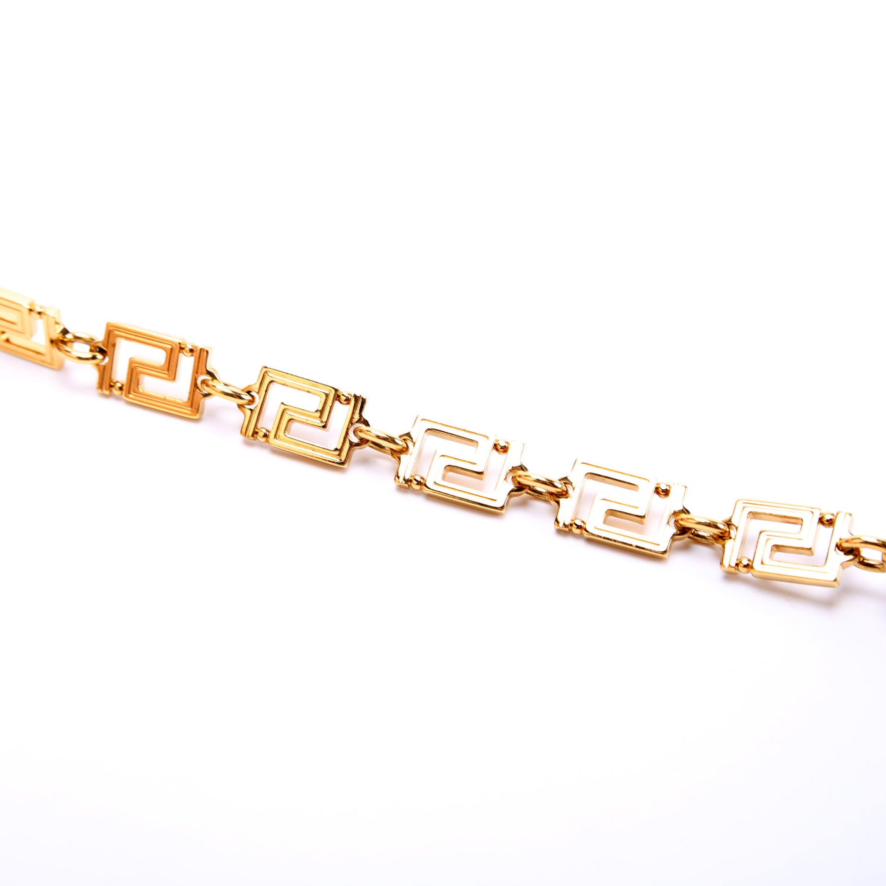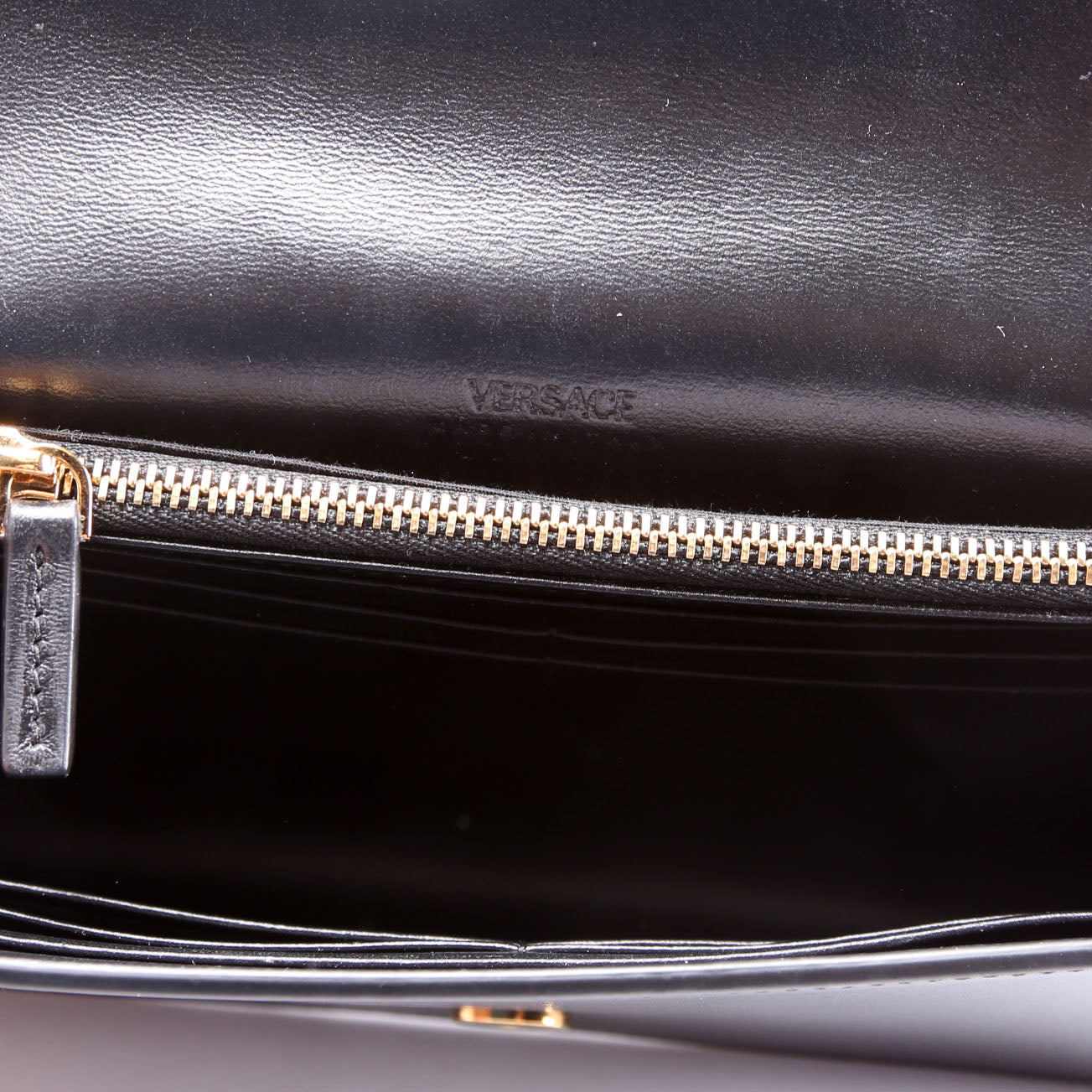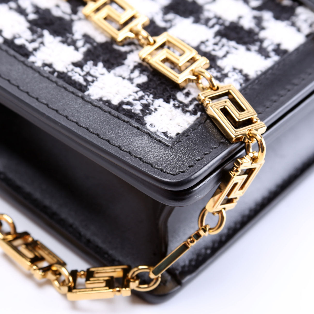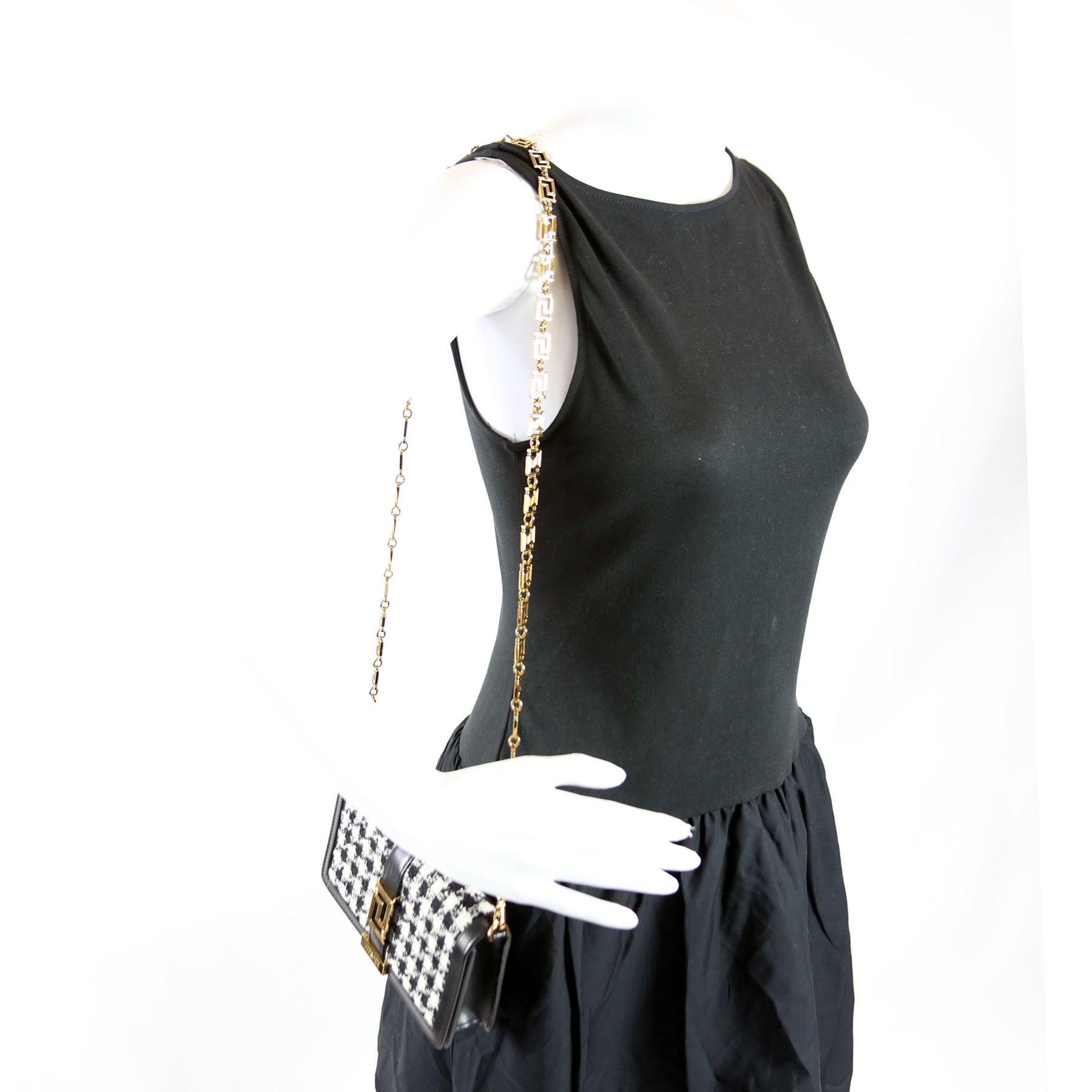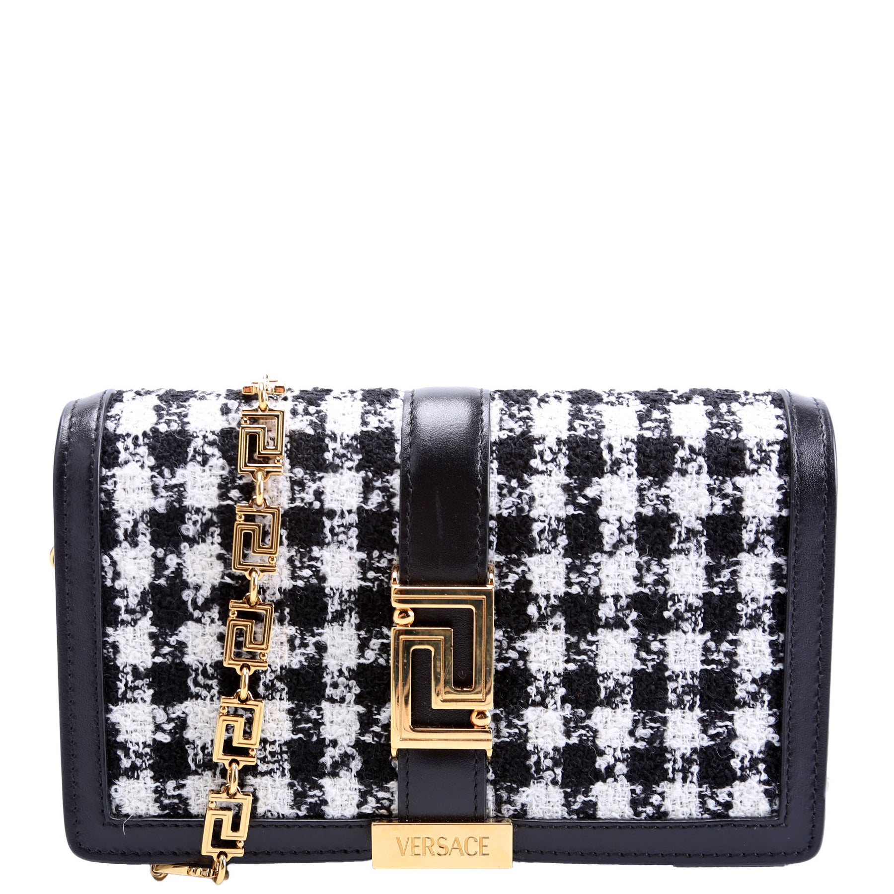 This pre-owned Versace Greca Goddess Wallet On Chain is guaranteed 100% authentic. The exterior is in the classic Versace Houndstooth.