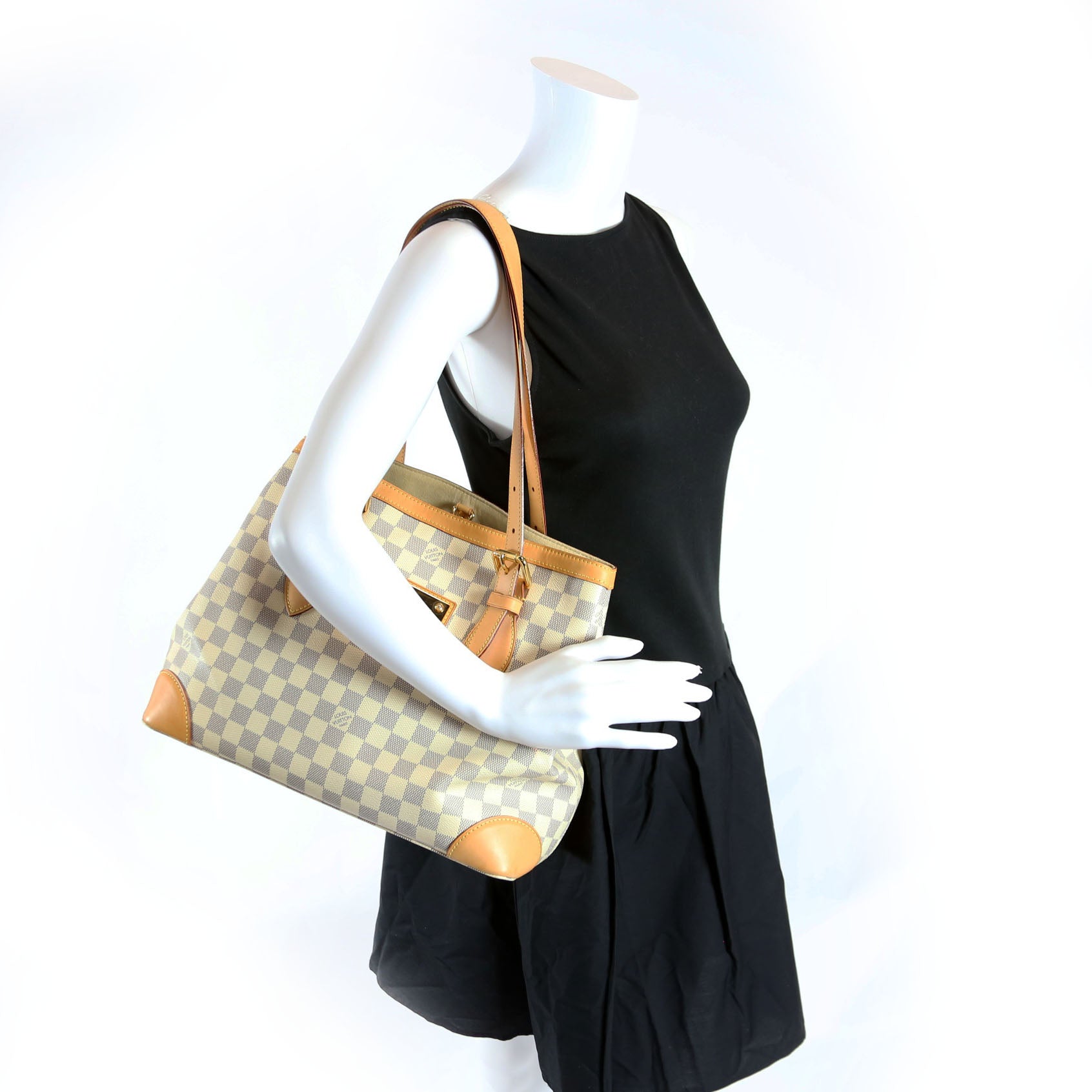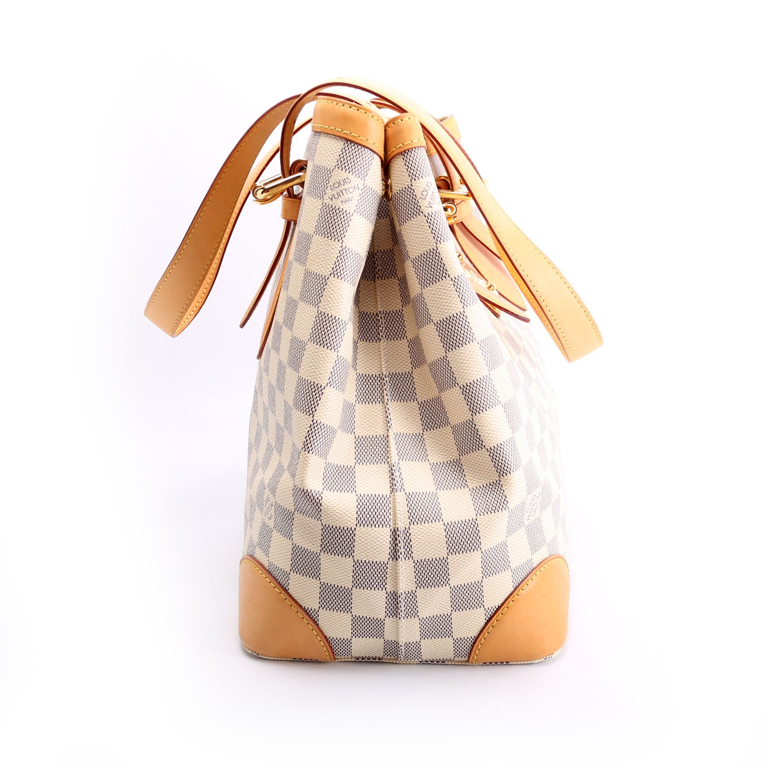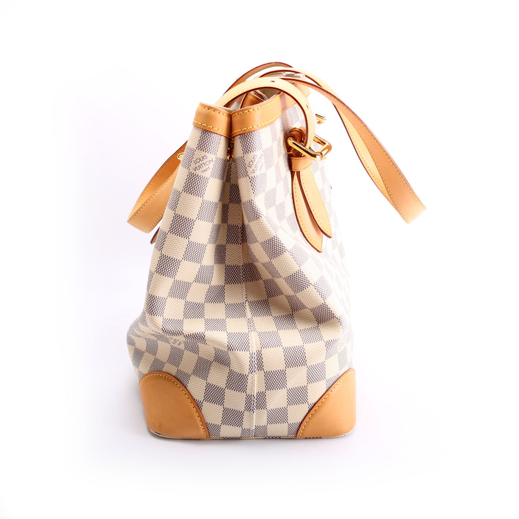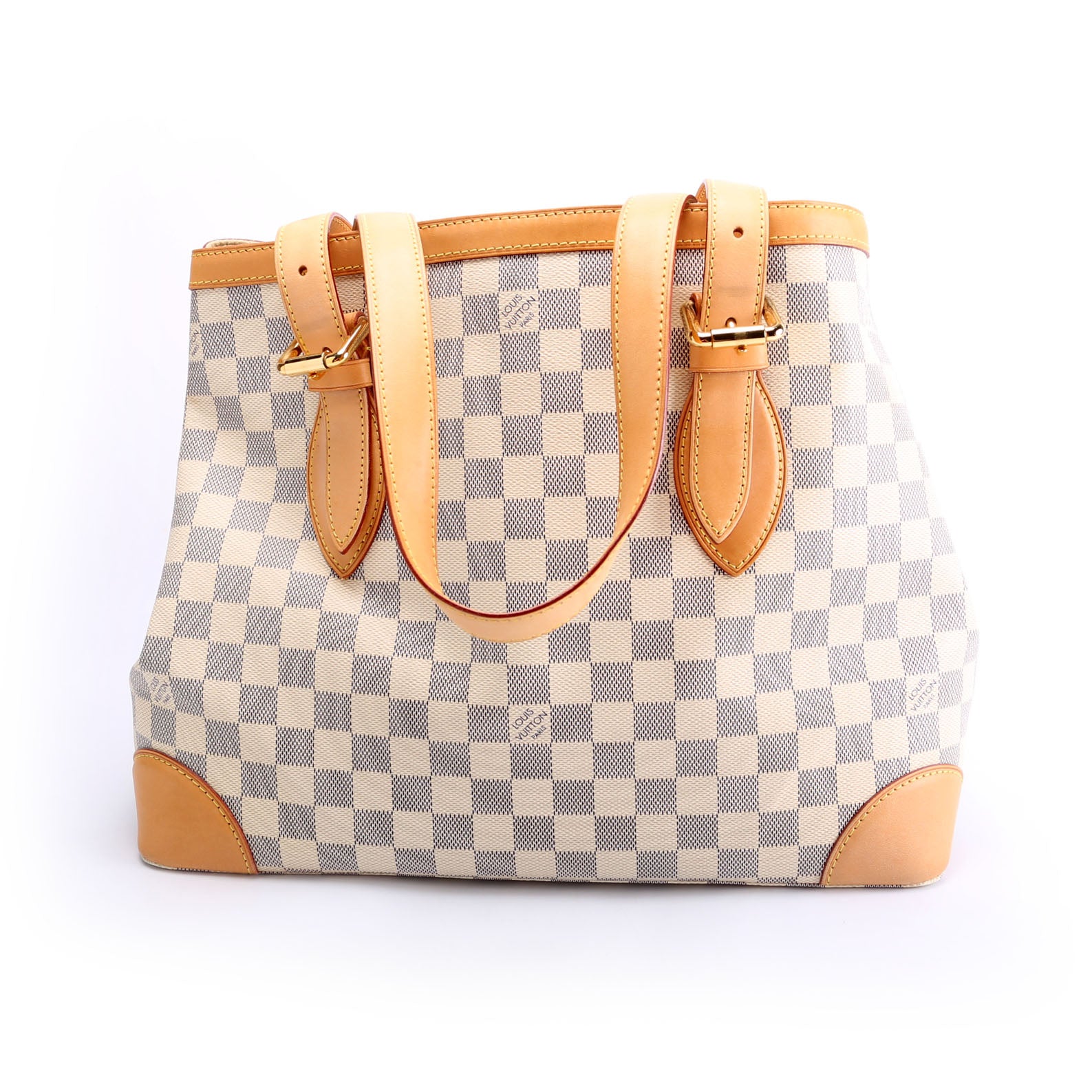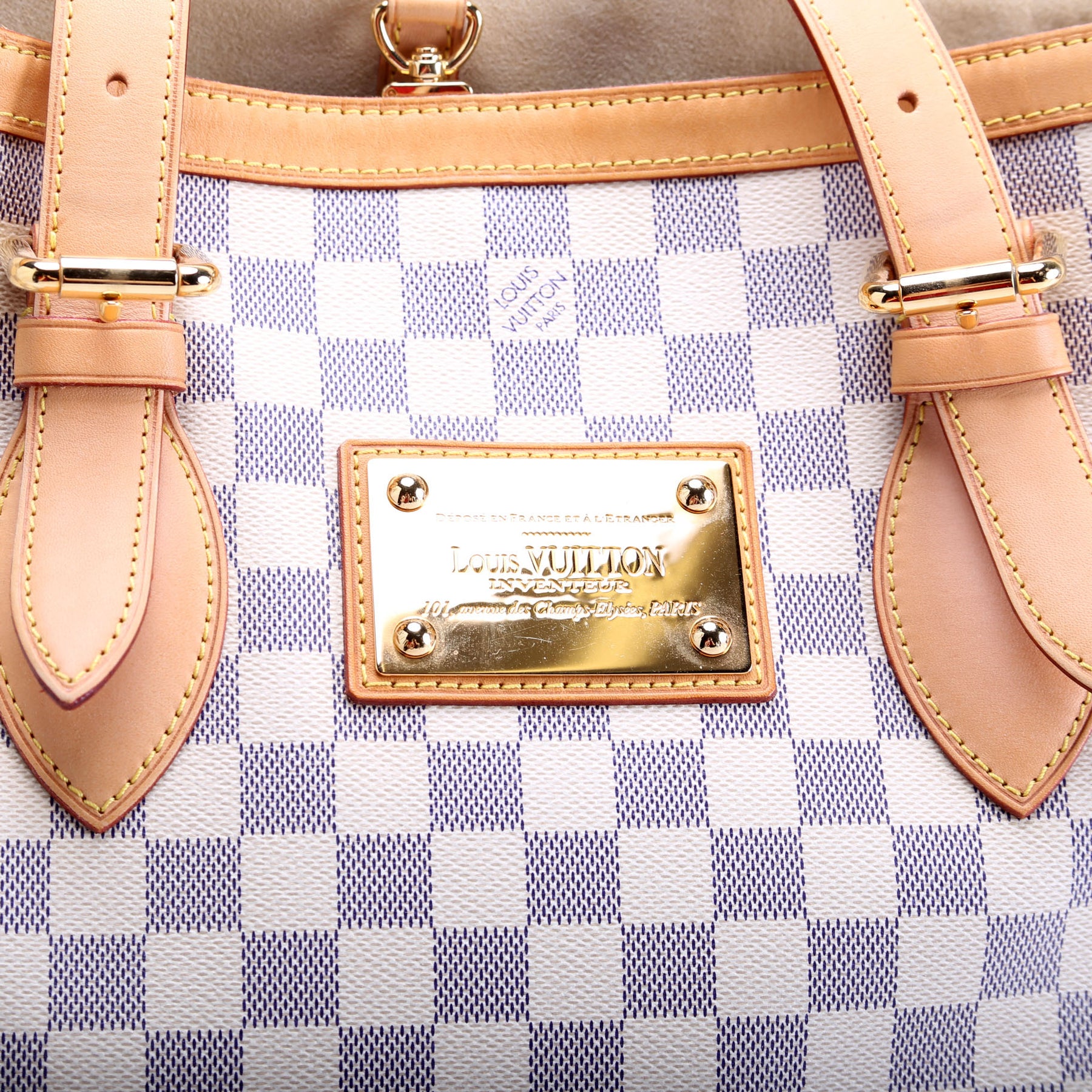 This pre-owned Louis Vuitton Hampstead MM is guaranteed 100% authentic. The exterior is in the classic Louis Vuitton Damier Azur coated canvas.