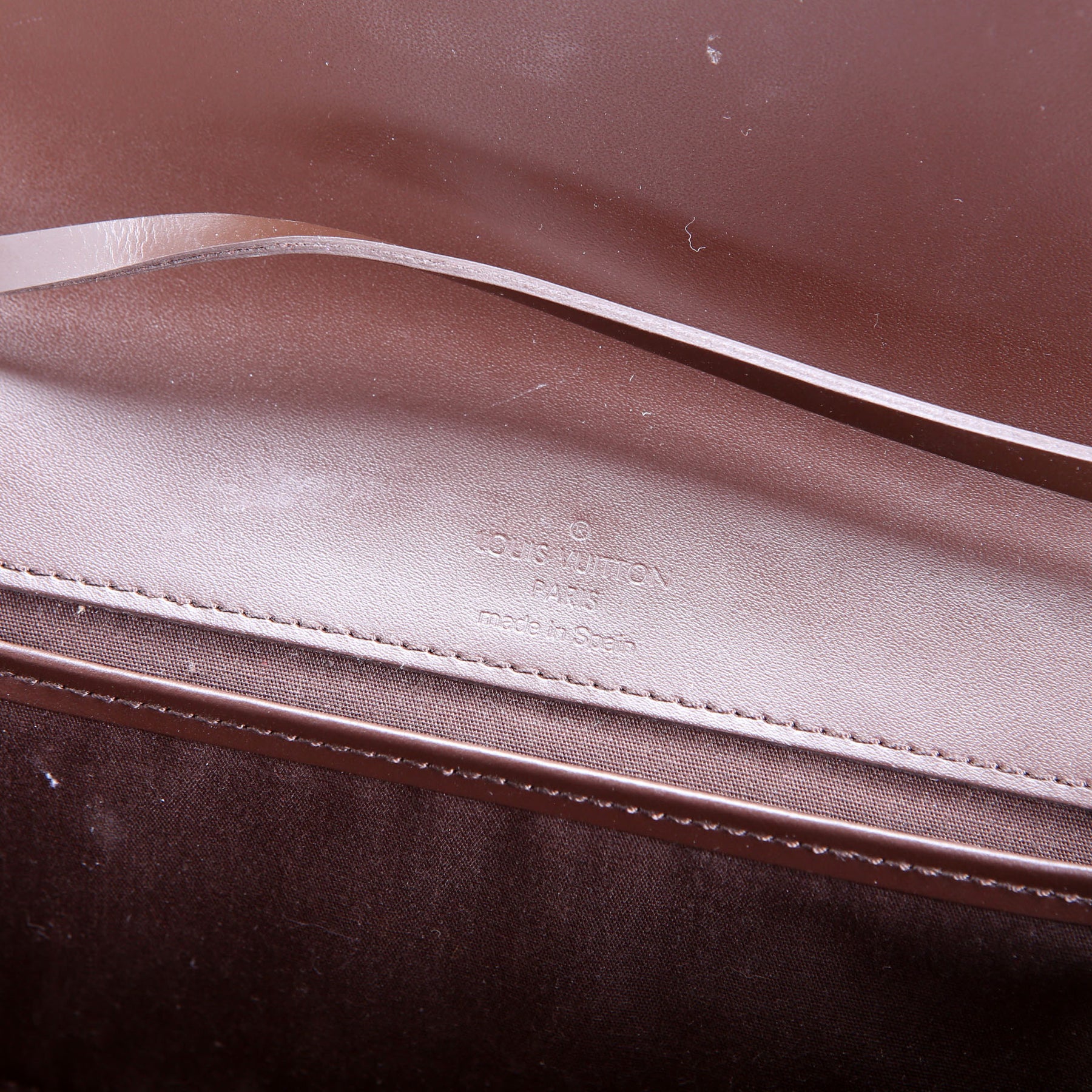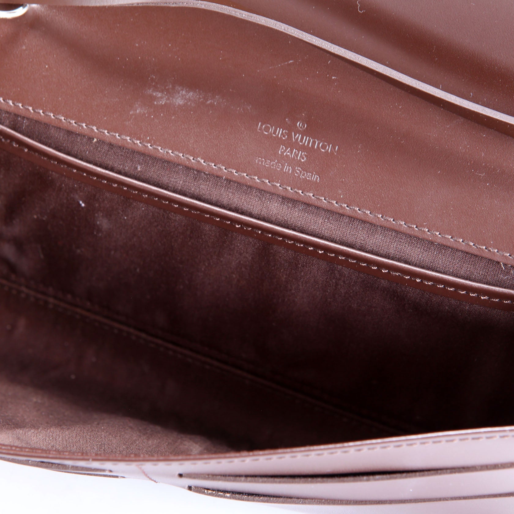 Interior: The interior shows indentions to the leather from the hardware. The fabric shows light staining. It features four card slots, and one open pocket.