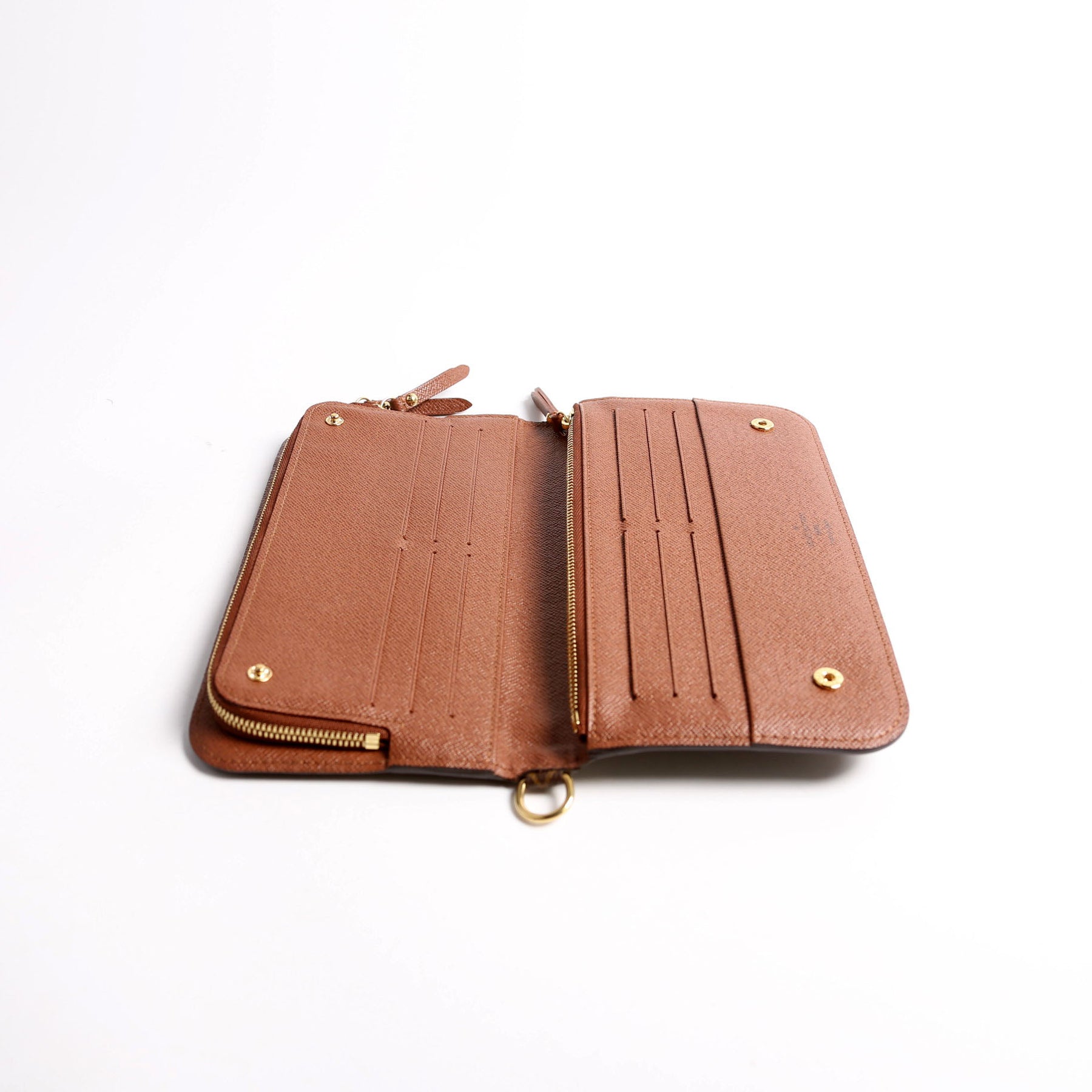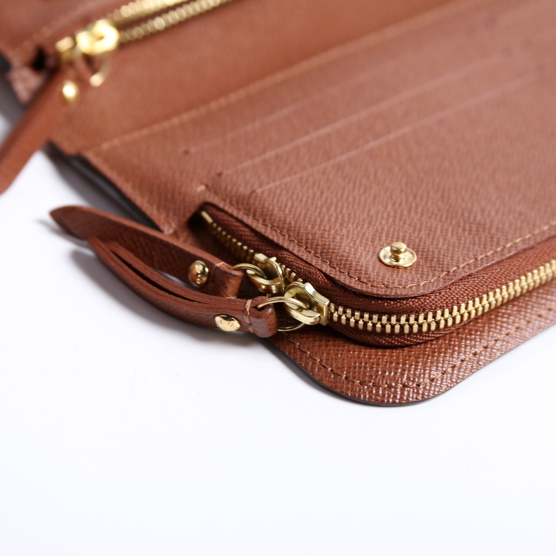 Interior: Free of wear. The interior features twelve card slots, two zip closure coin pouches, two bill slots, and one additional open pocket.