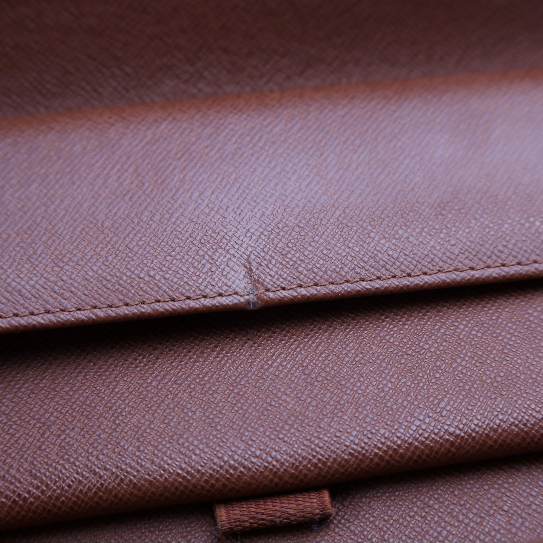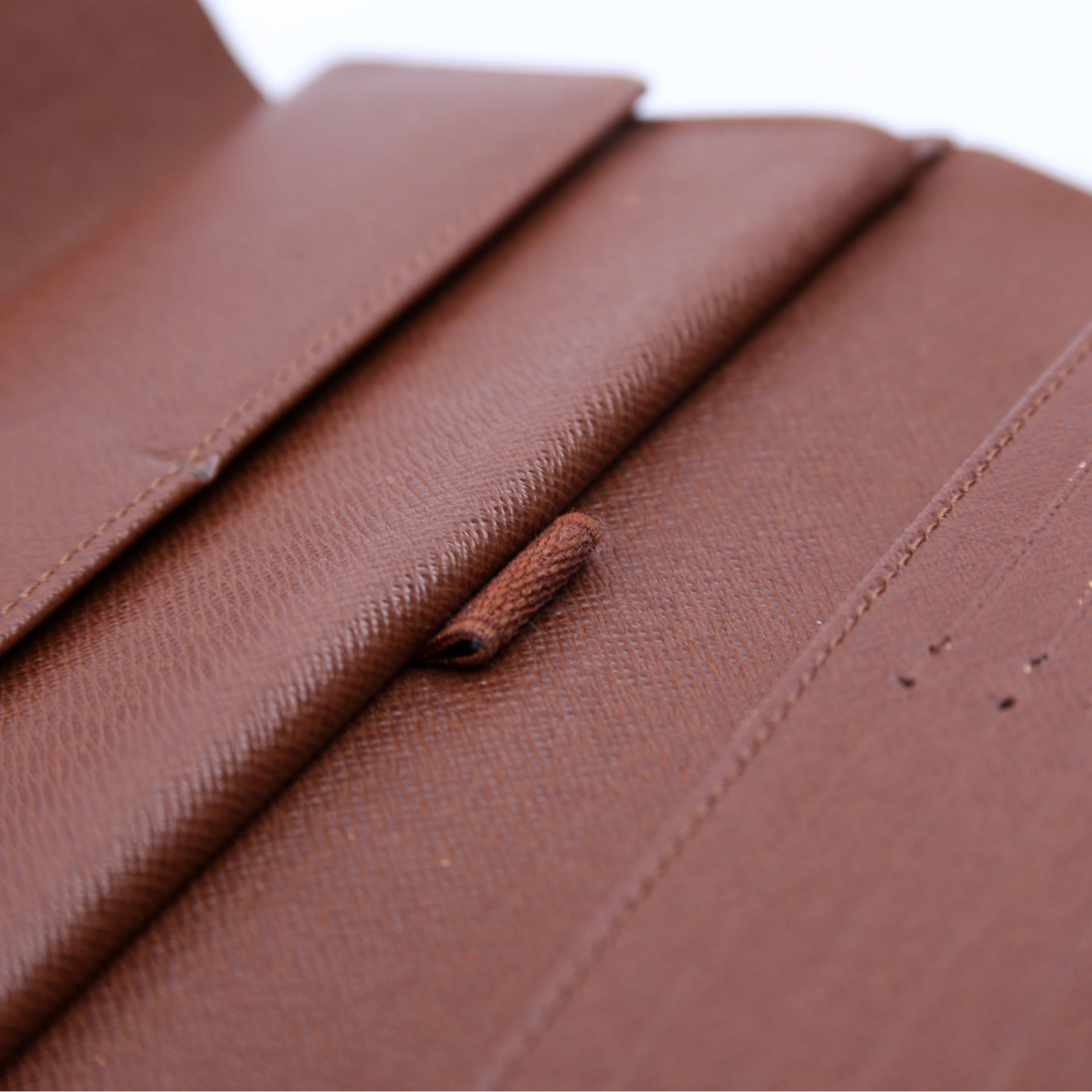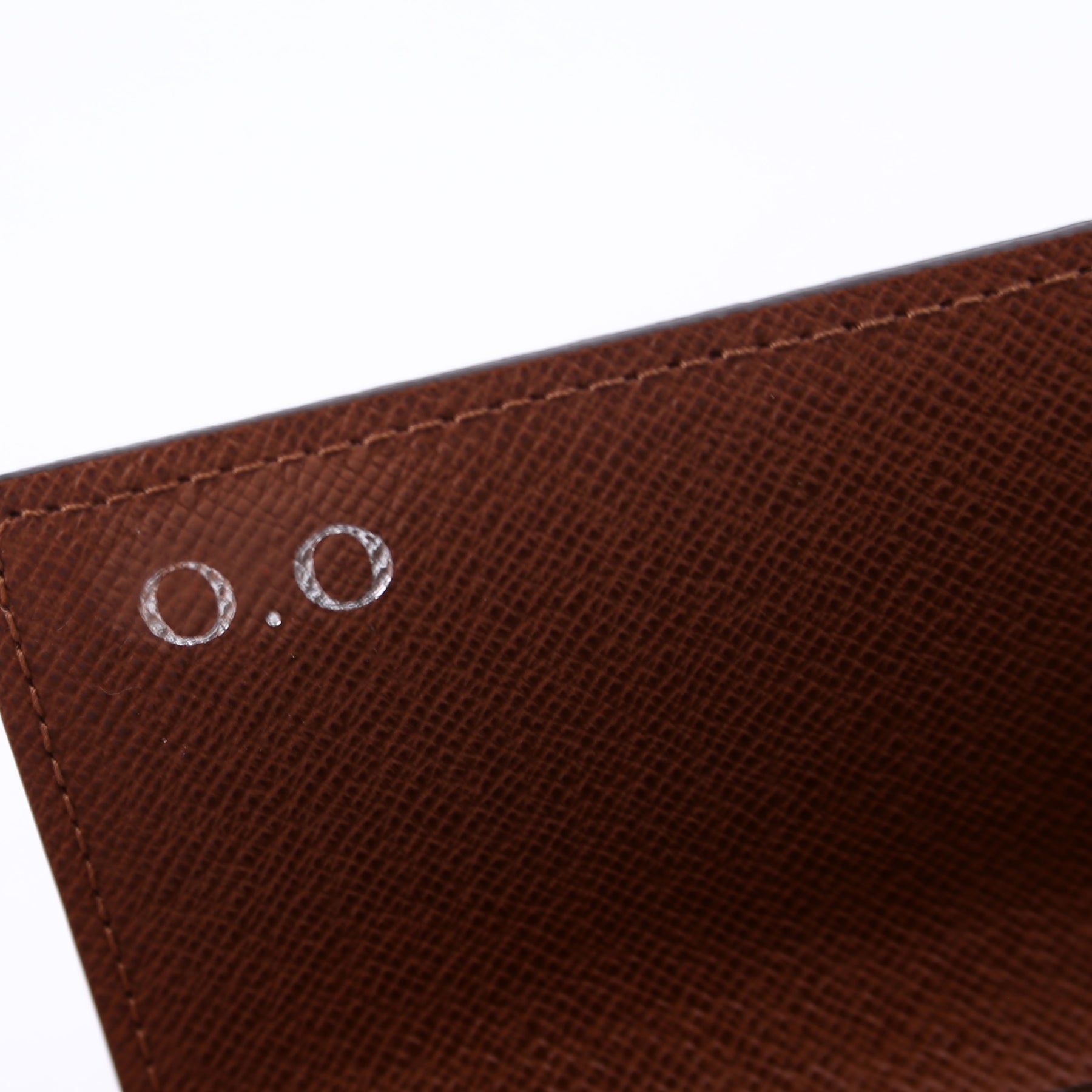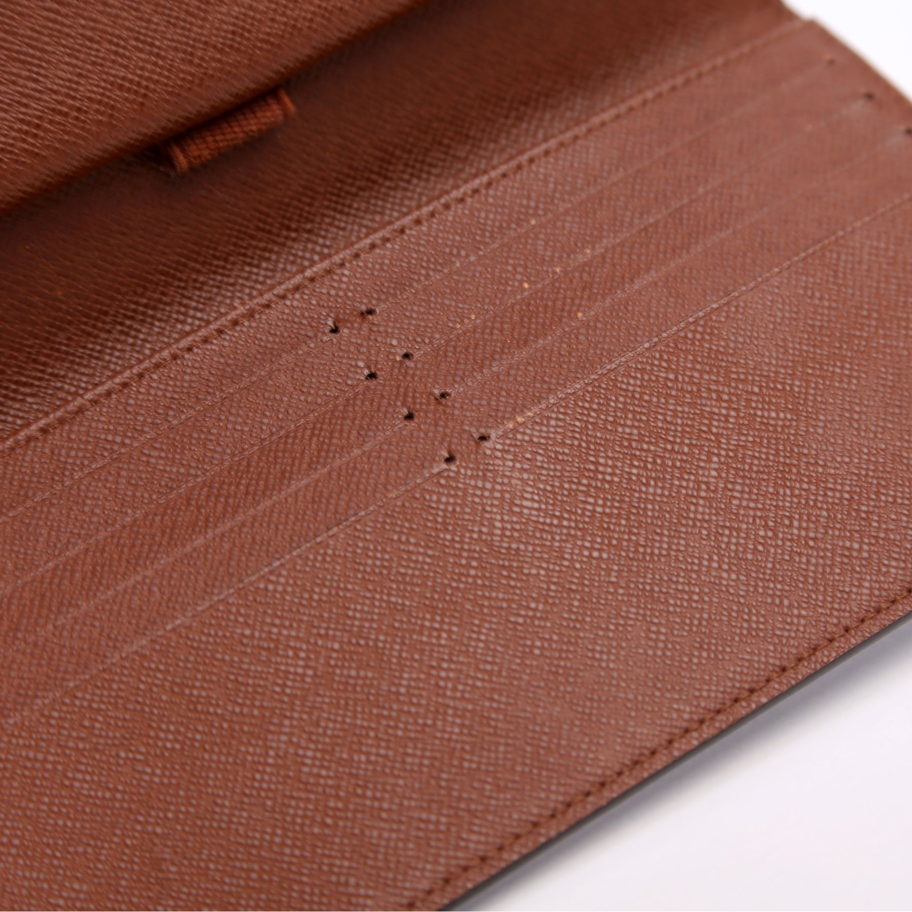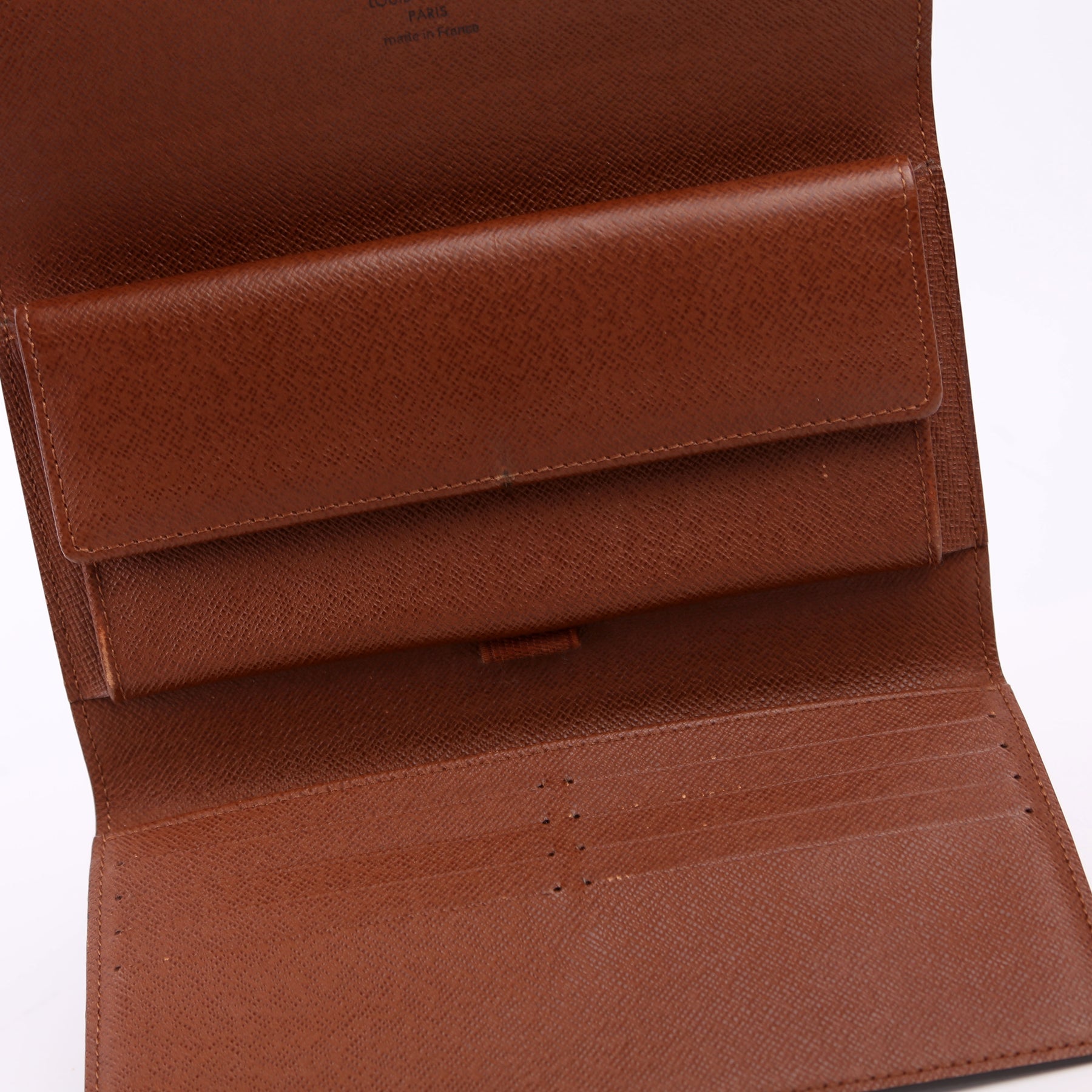 Interior: The interior features two bill slots, one pen holder, six card slots, and one snap closure coin pouch. The leather has heat stamped initials.