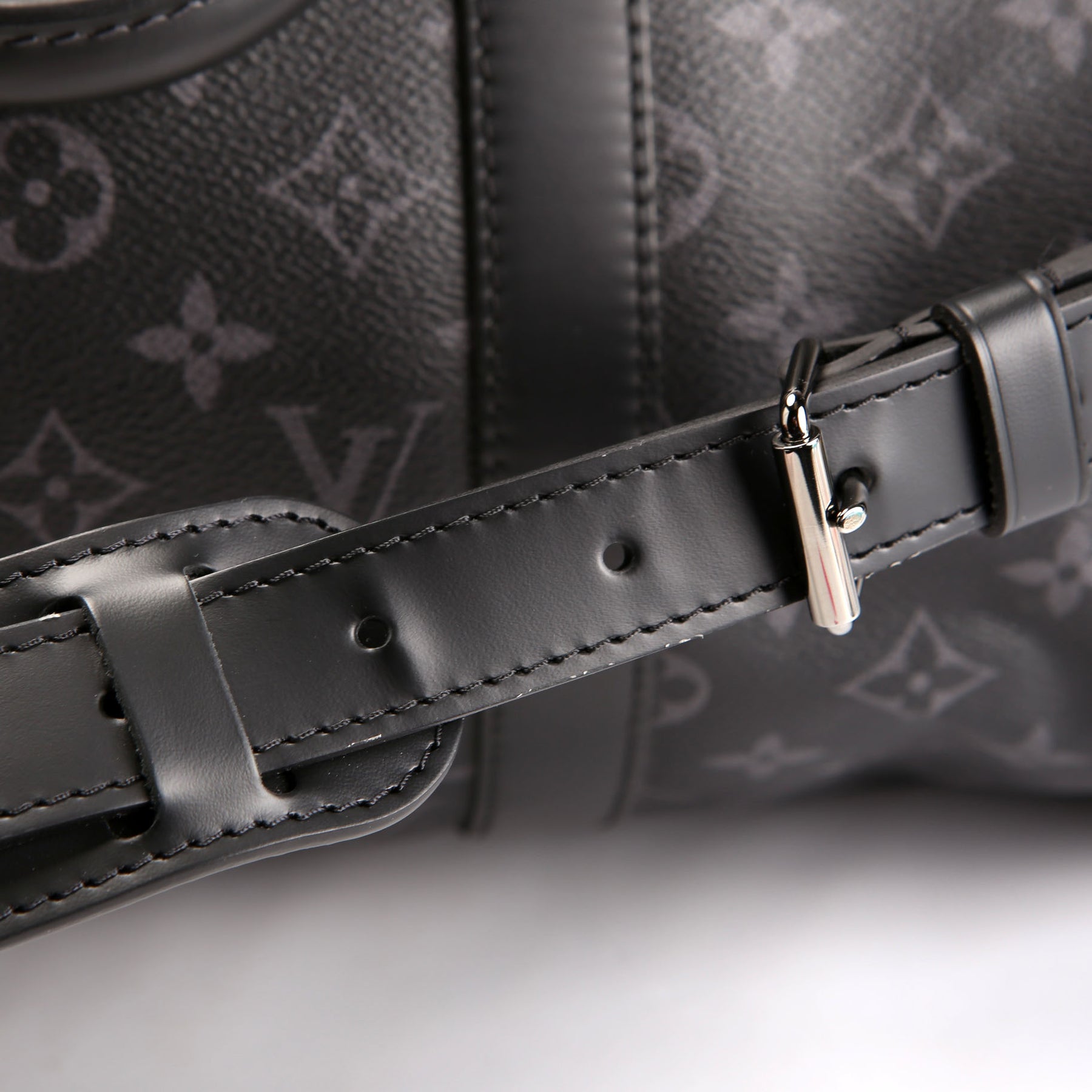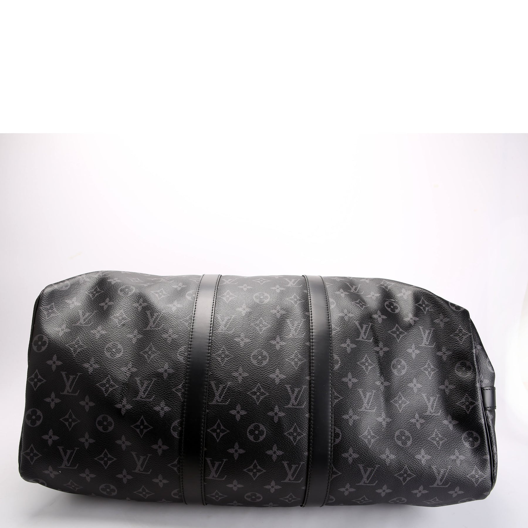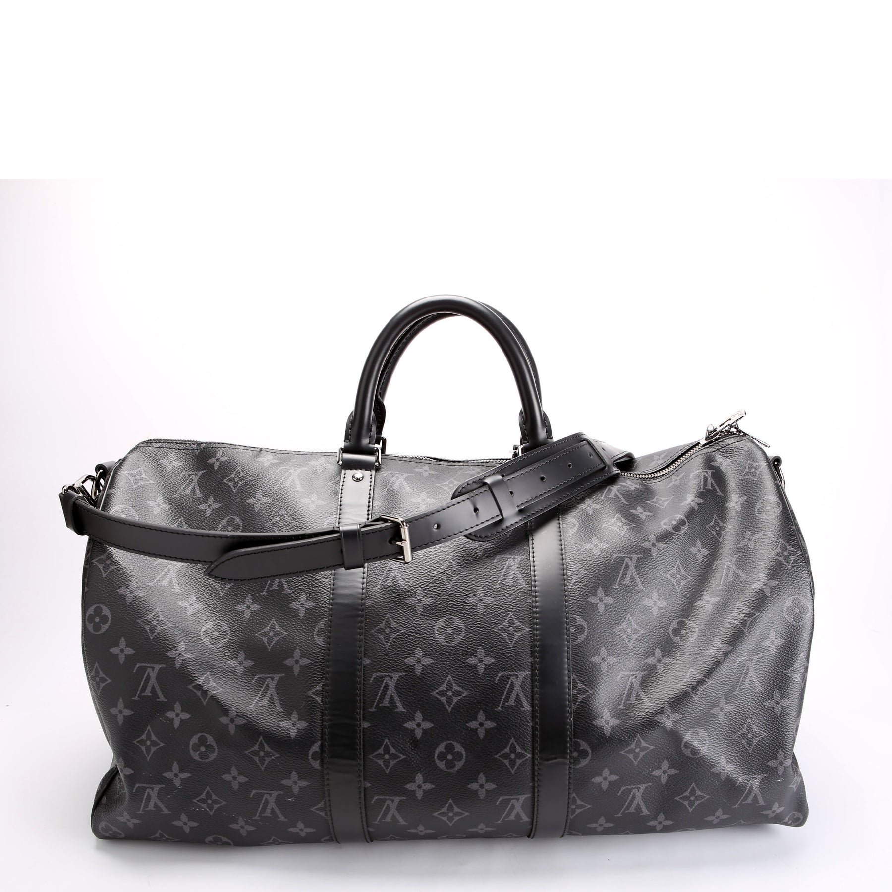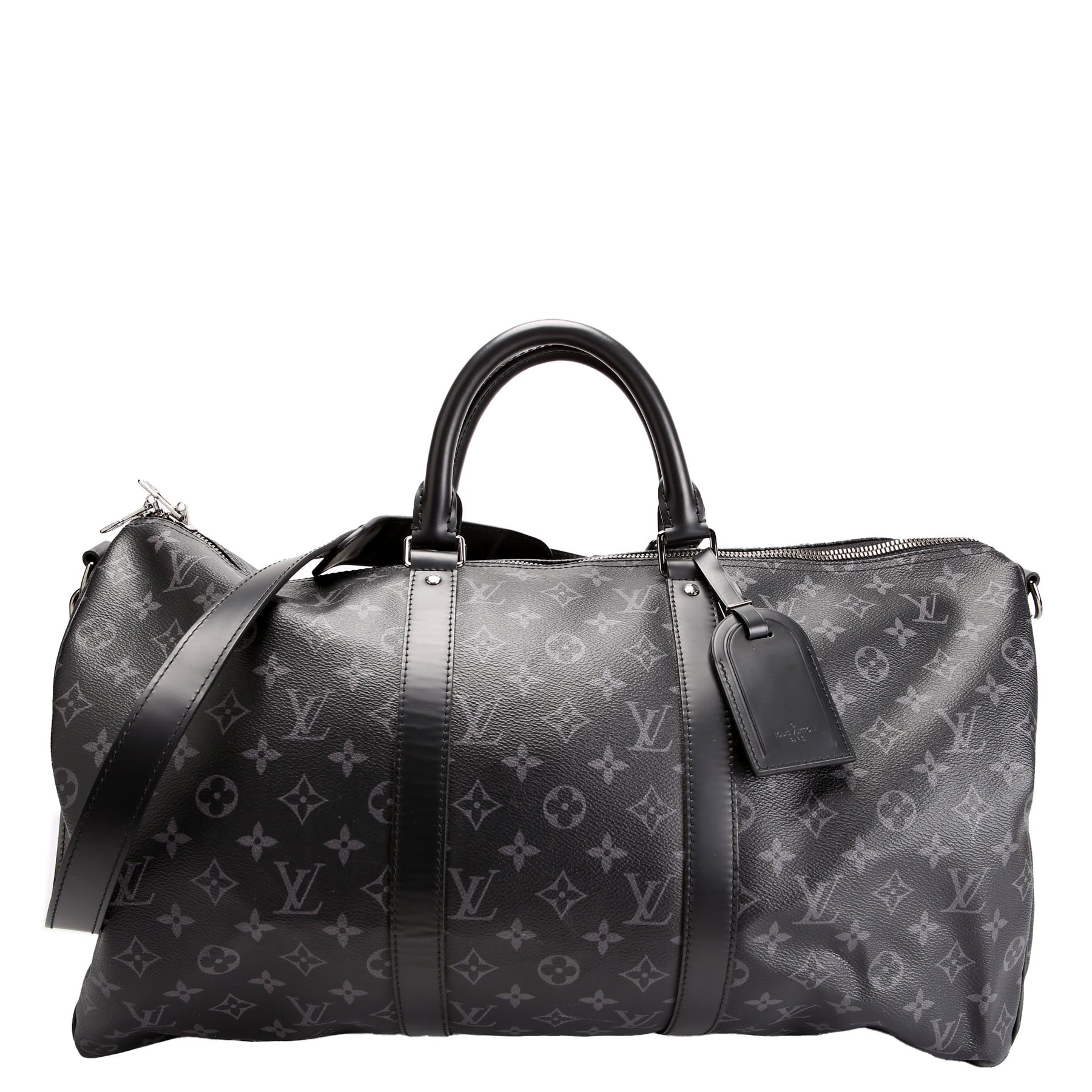 This pre-owned Keepall 50 Bandouliere is guaranteed 100% authentic. The exterior is in the classic Louisv Vuitton Monogram Eclipse Coated Canvas.