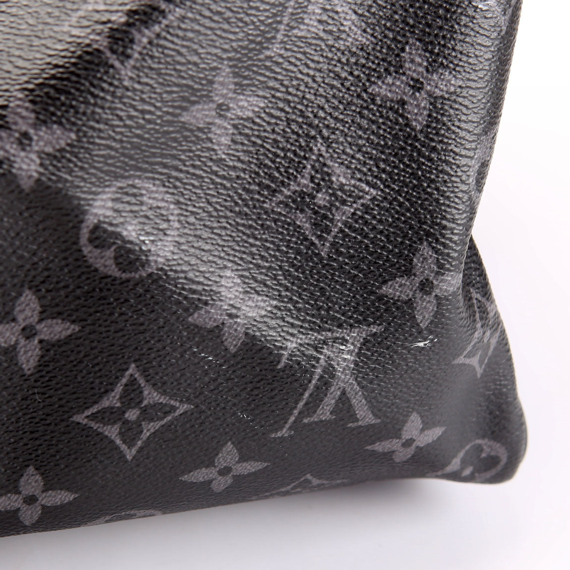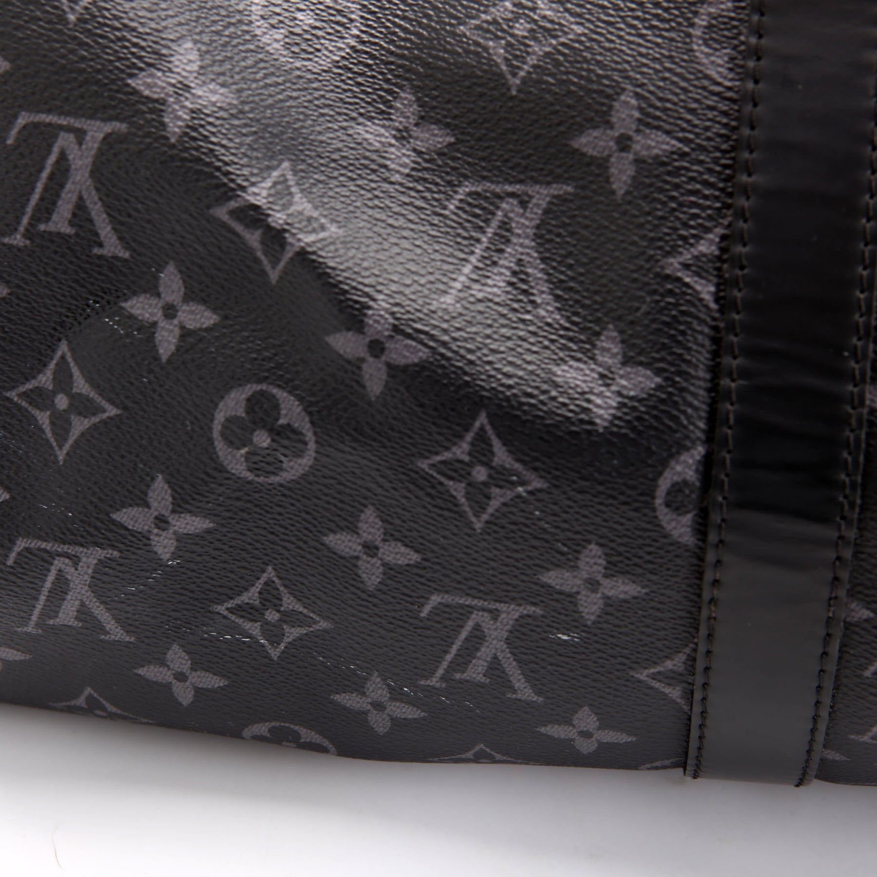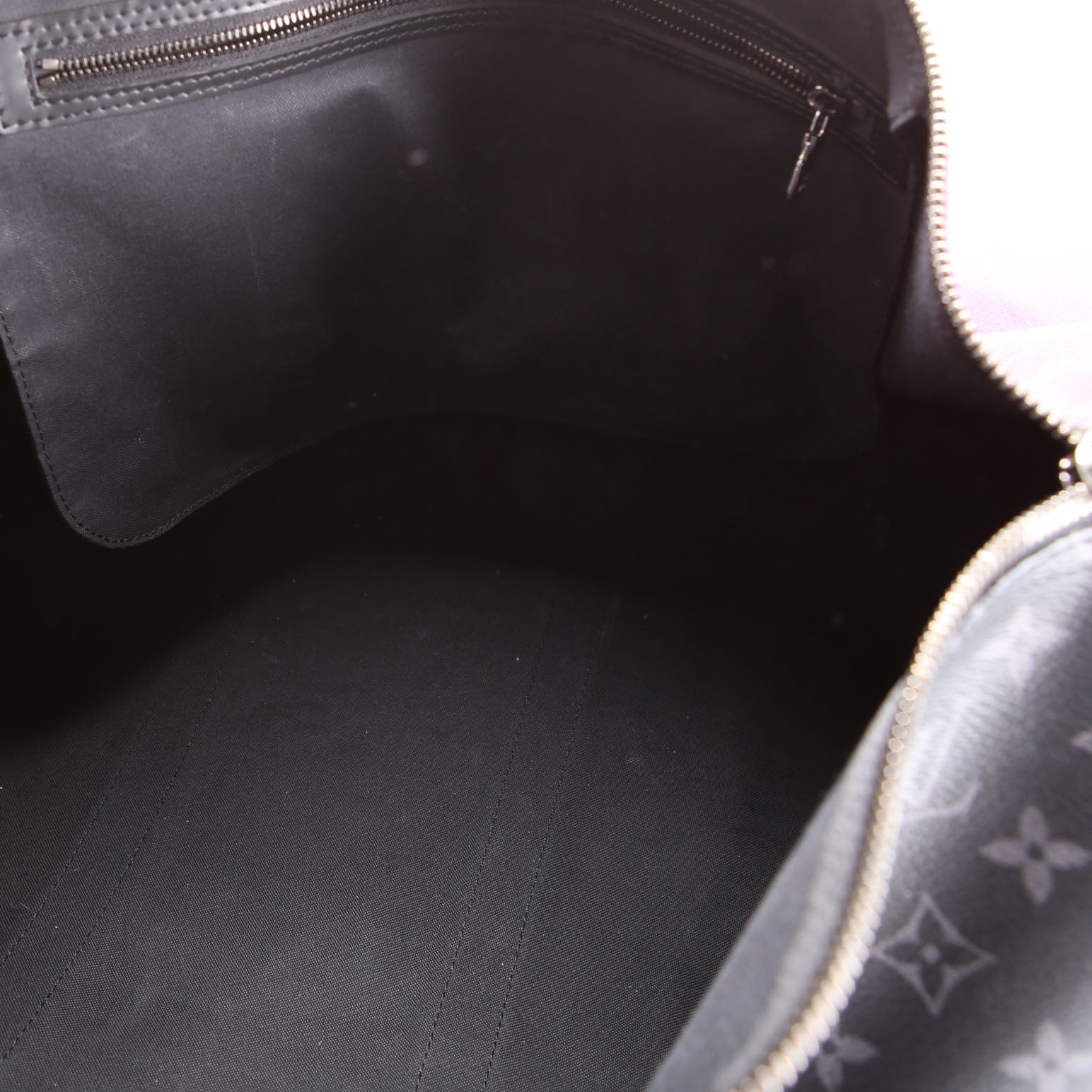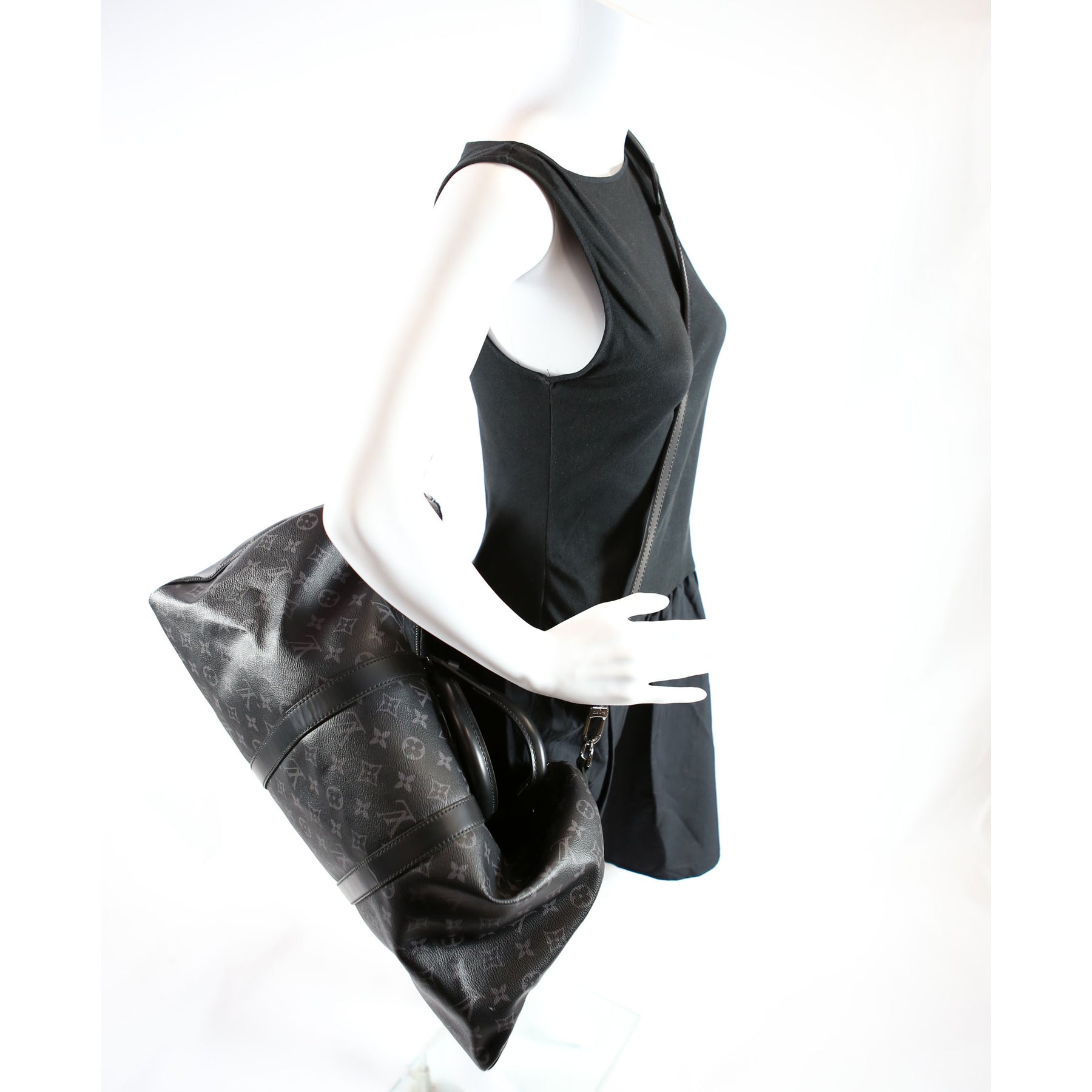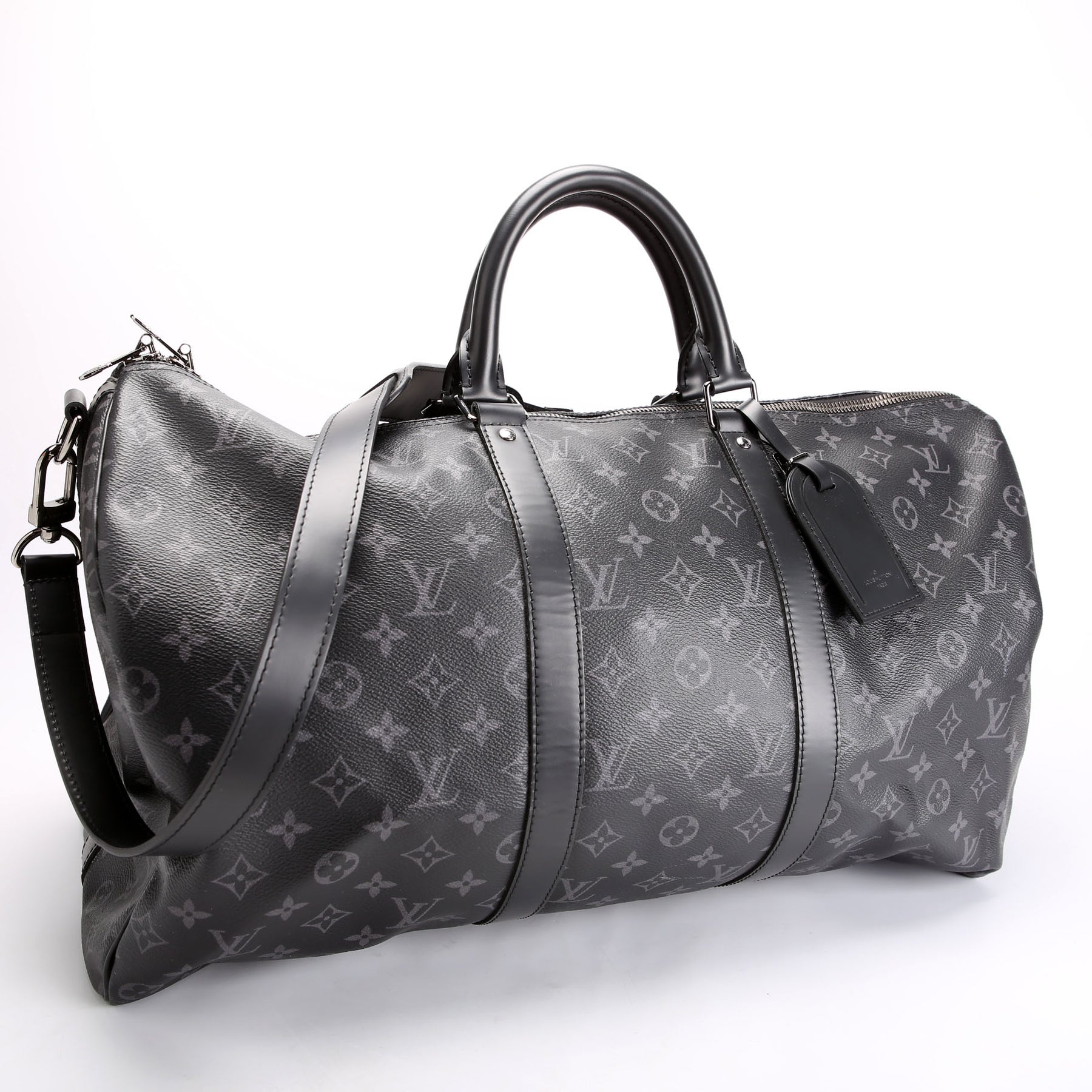 This pre-owned Keepall 50 Bandouliere is guaranteed 100% authentic. The exterior is in the classic Louisv Vuitton Monogram Eclipse Coated Canvas.