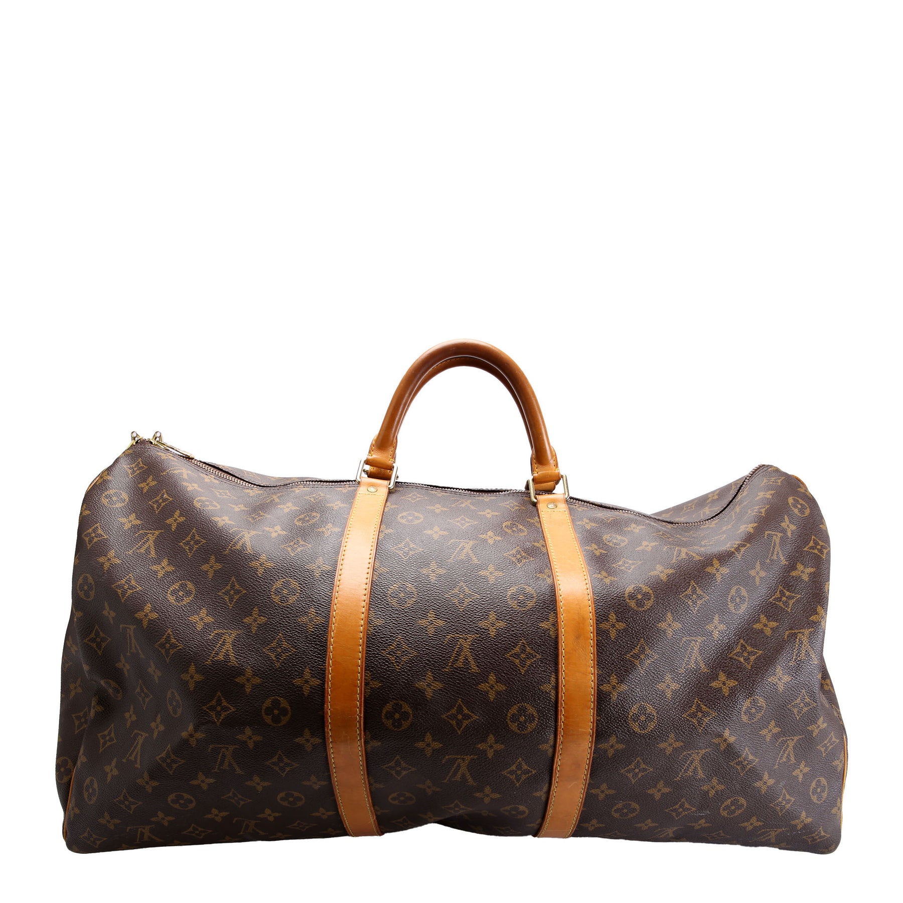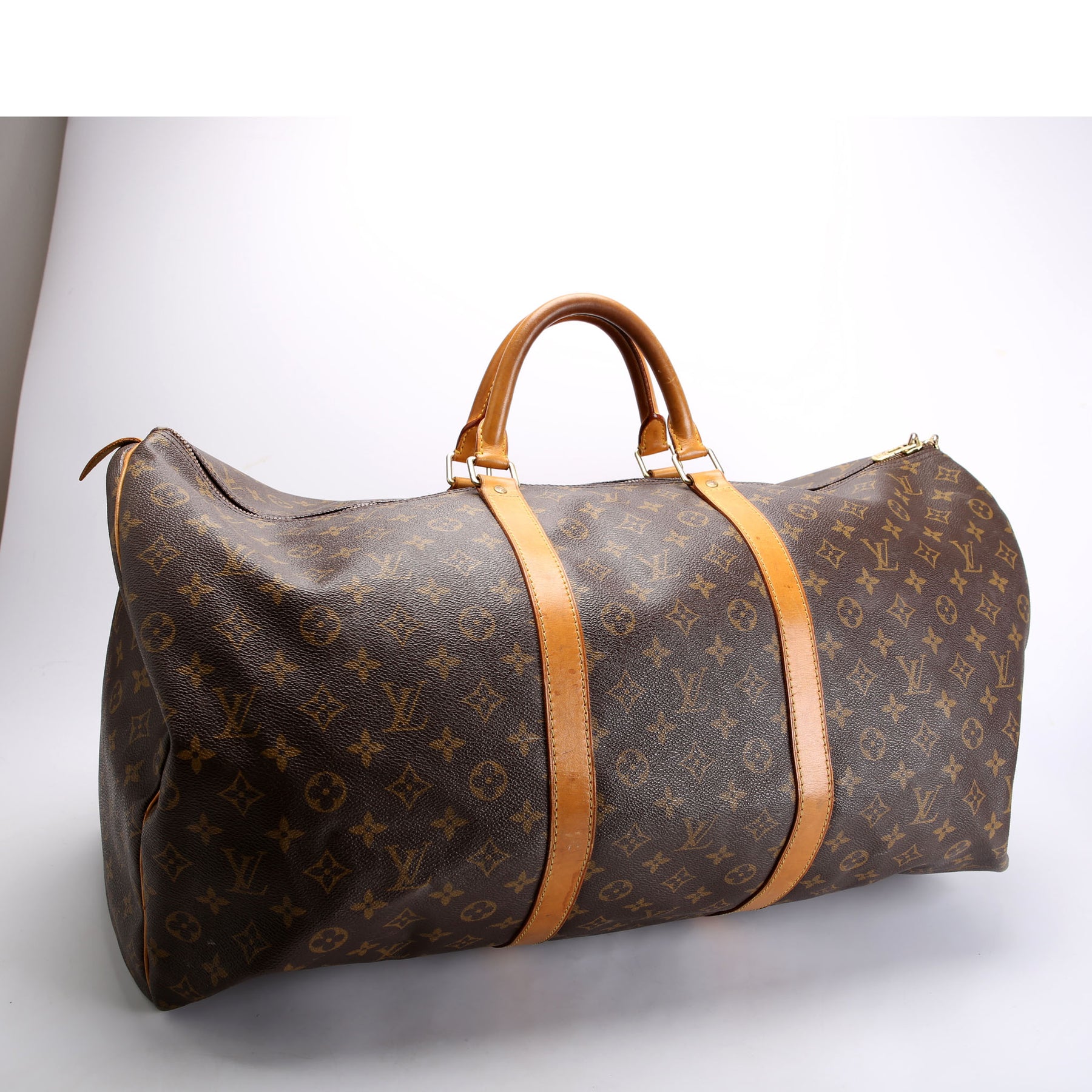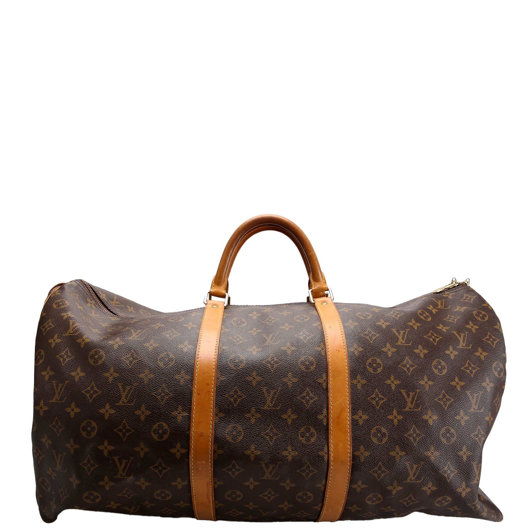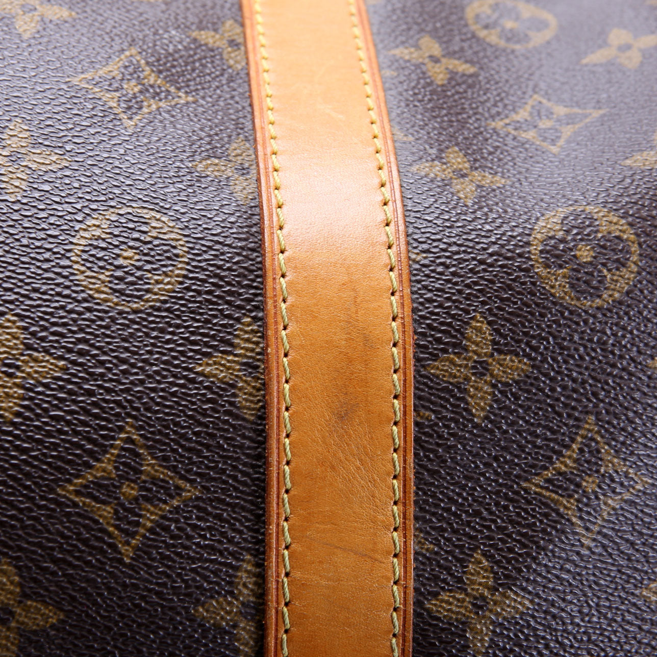 This pre-owned Louis Vuitton Keepall 60 is guaranteed 100% authentic. The exterior is in the classic Louis Vuitton Monogram coated canvas.
