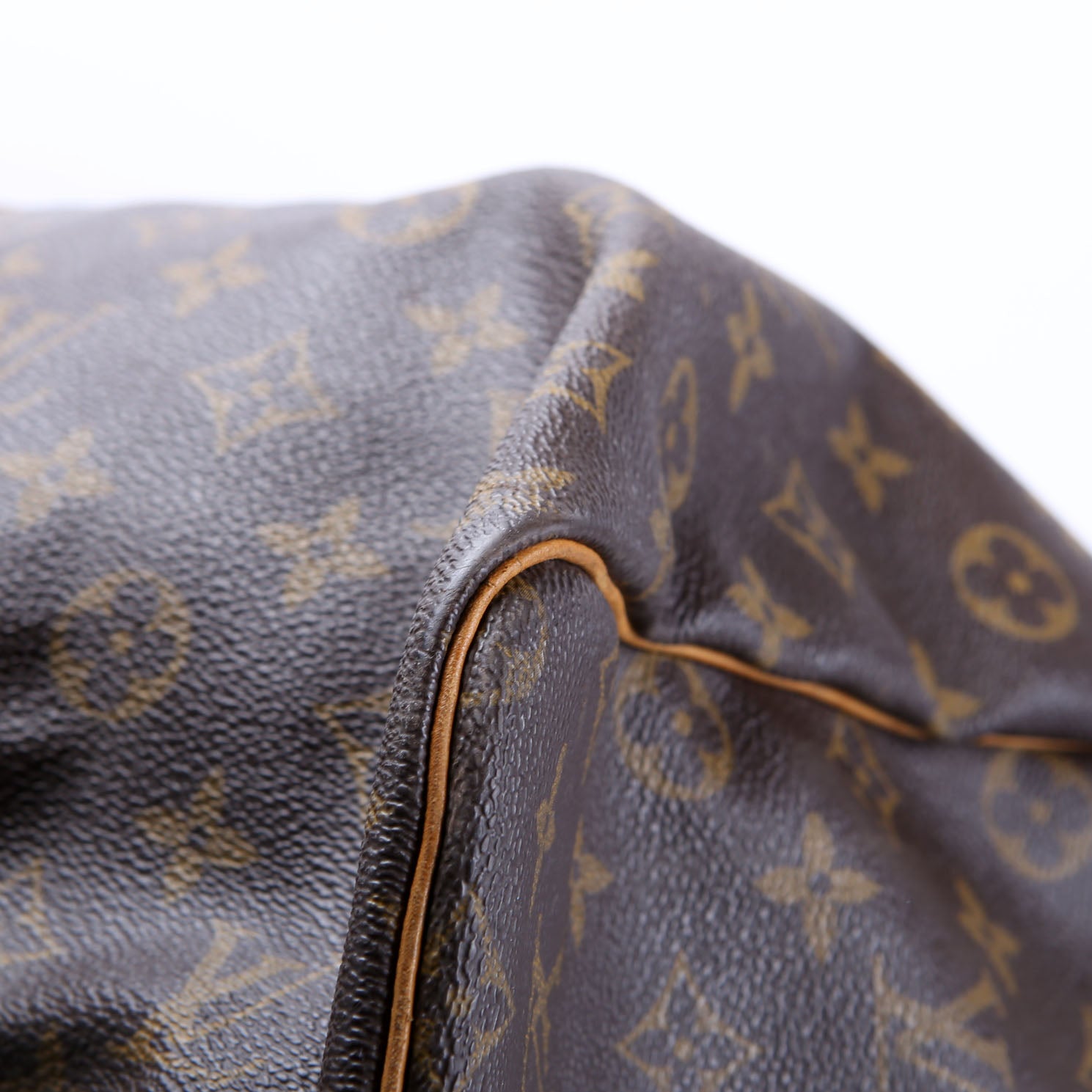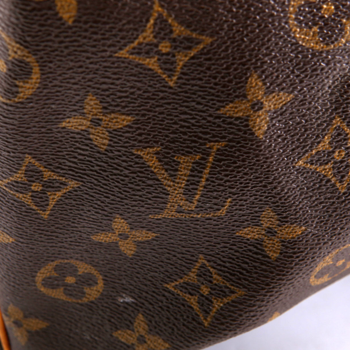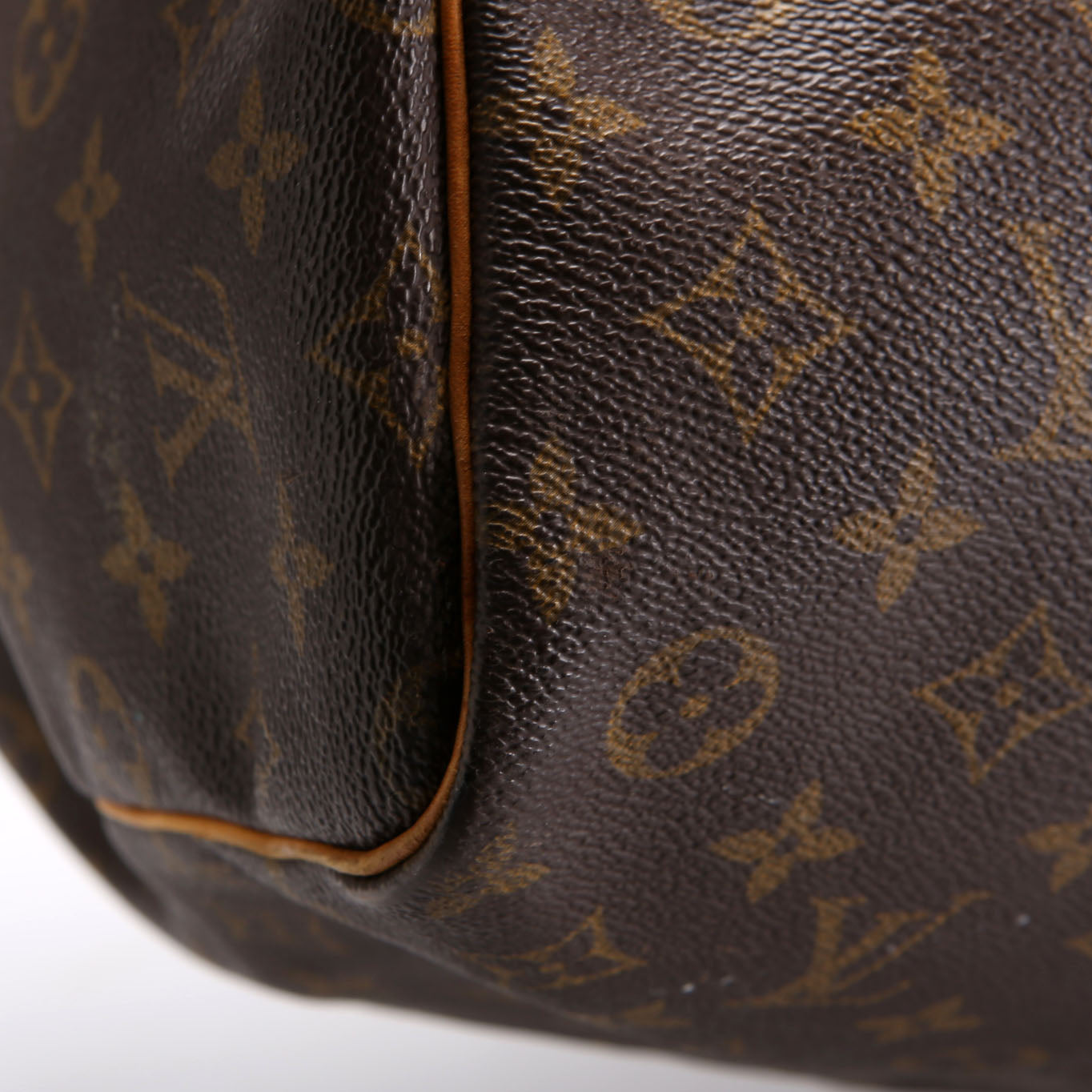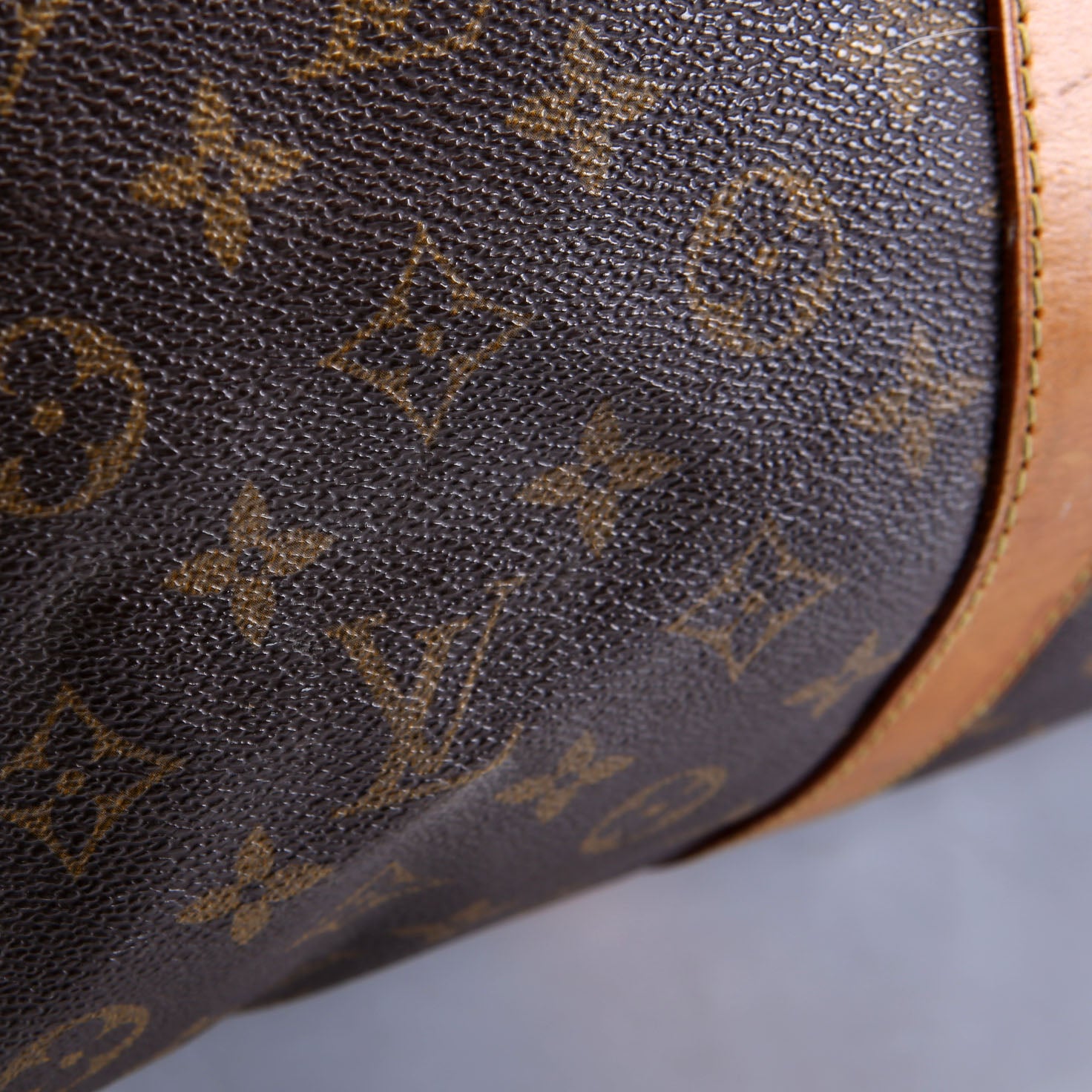 Exterior: The exterior coated canvas shows fading. The corners show wear and rubbing. The leather detail shows wear, rubbing, staining, and discoloration.