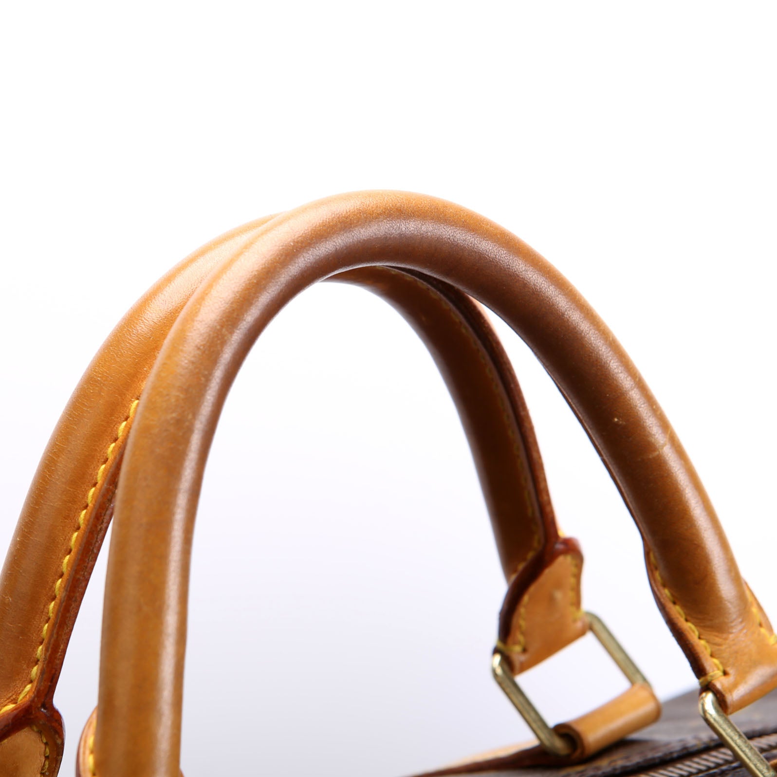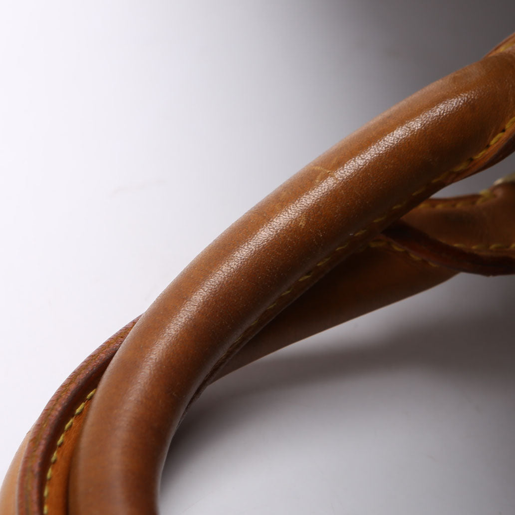 Handle: The leather handles show wear, rubbing, and discoloration.