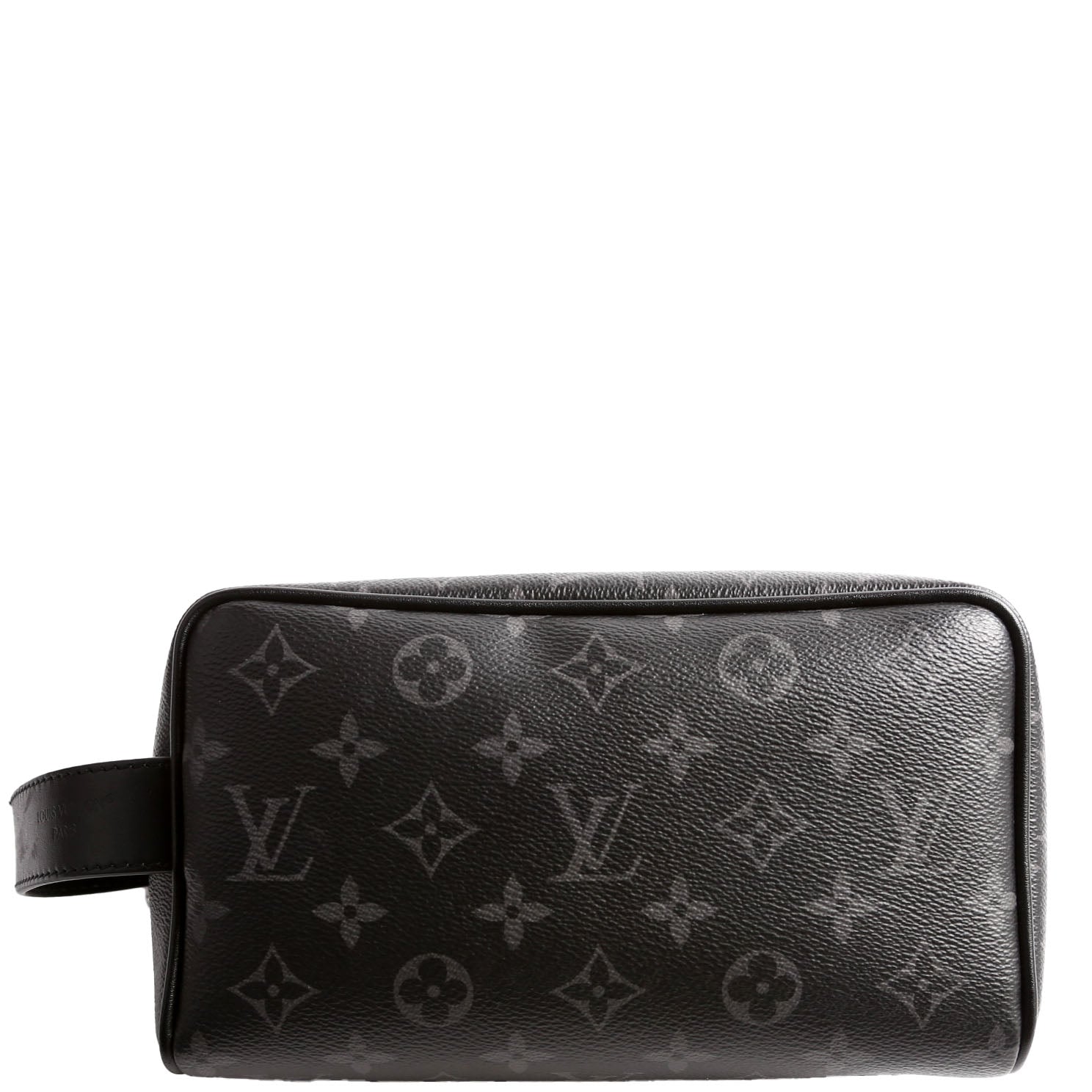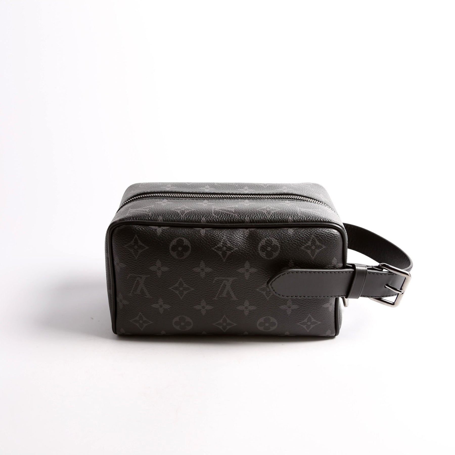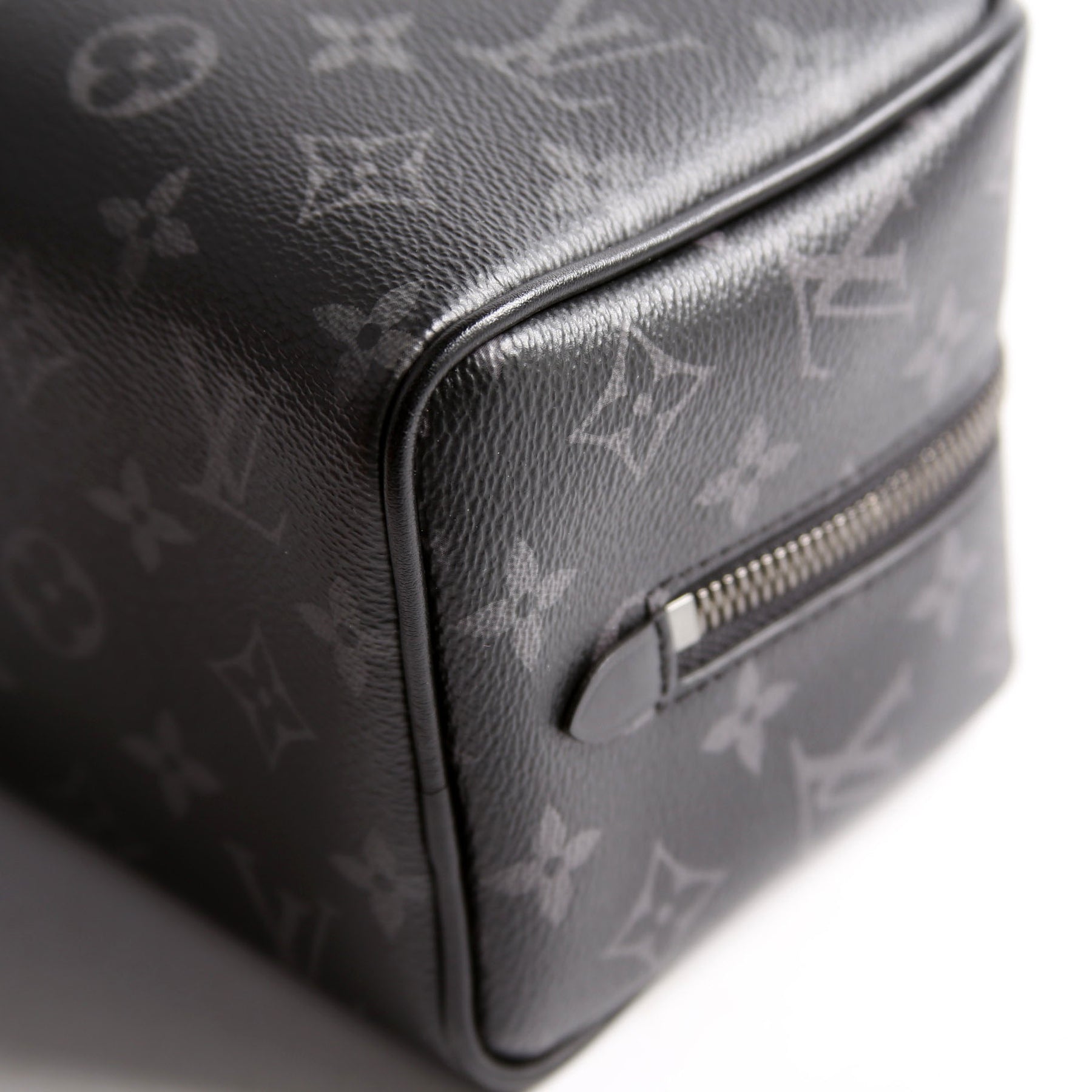 This pre-owned Louis Vuitton Locker Dopp Kit is guaranteed 100% authentic. The exterior is in the classic Monogram Eclipse coated canvas.
