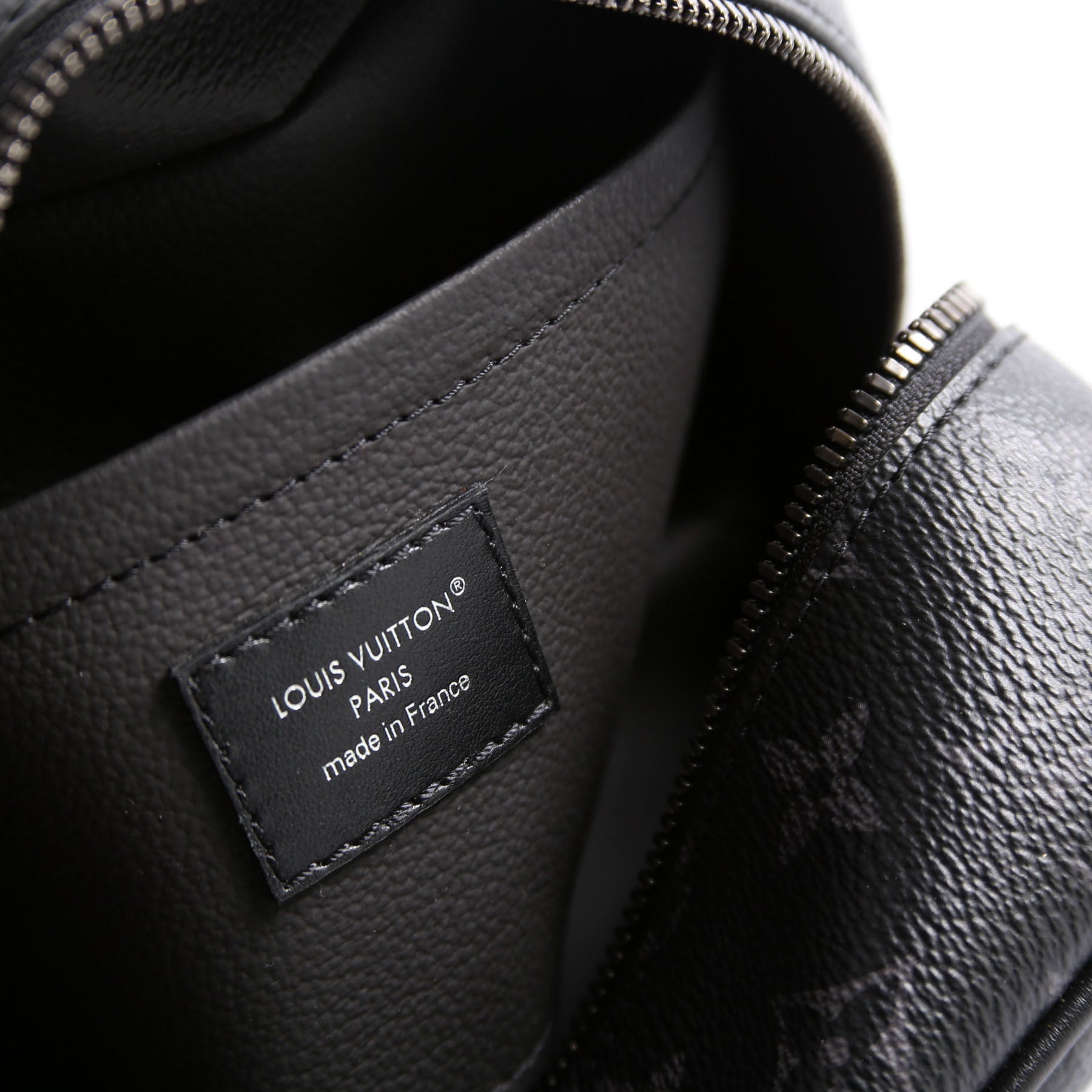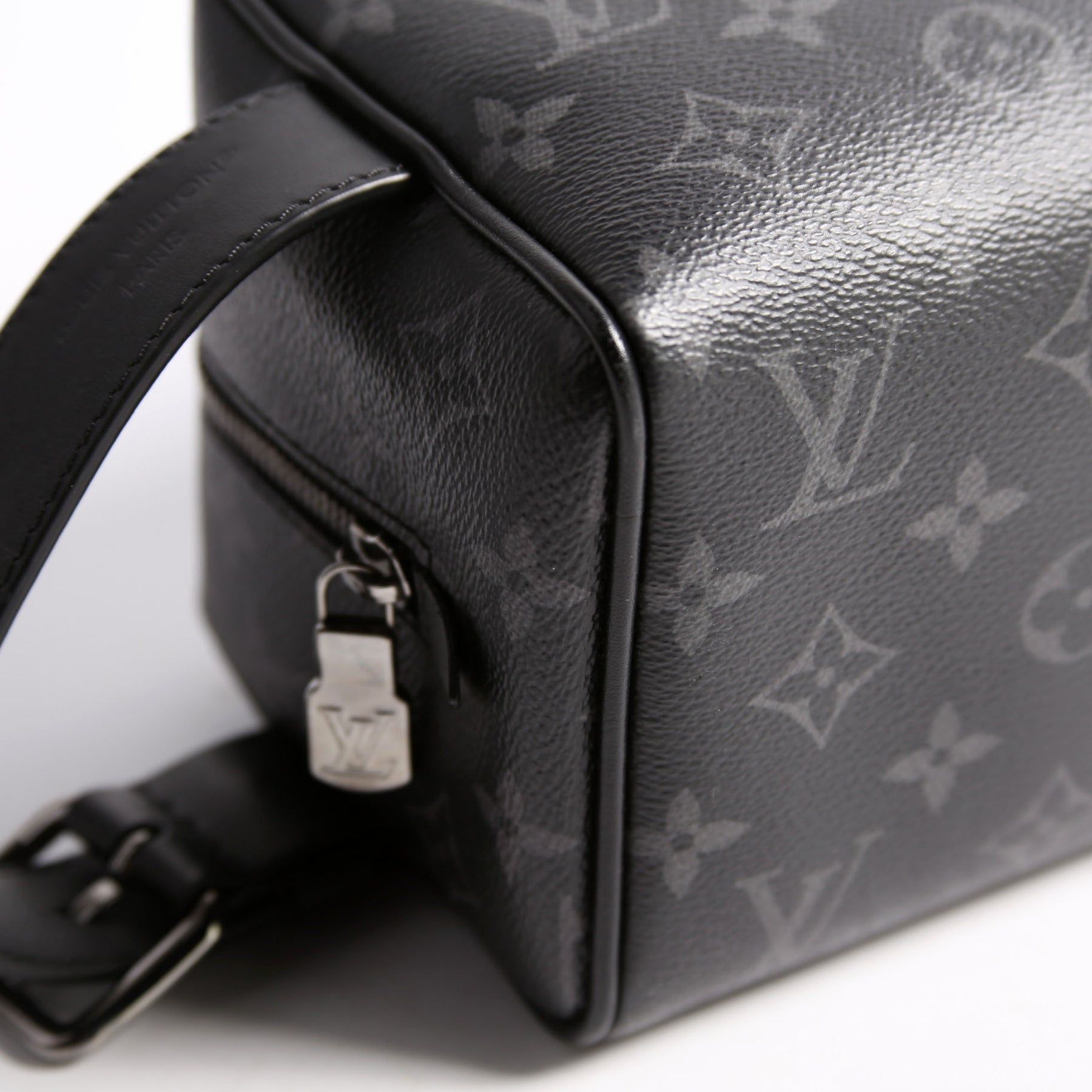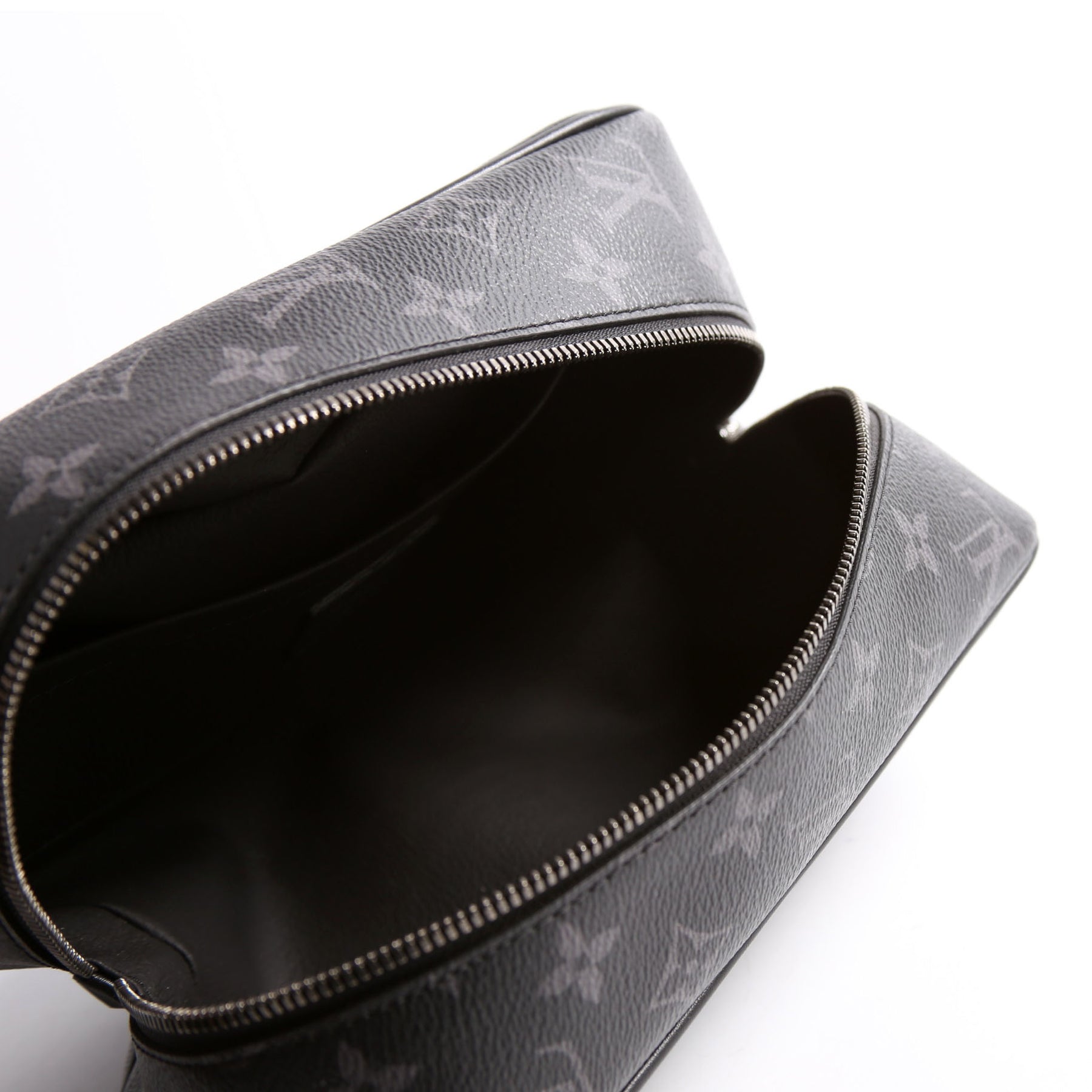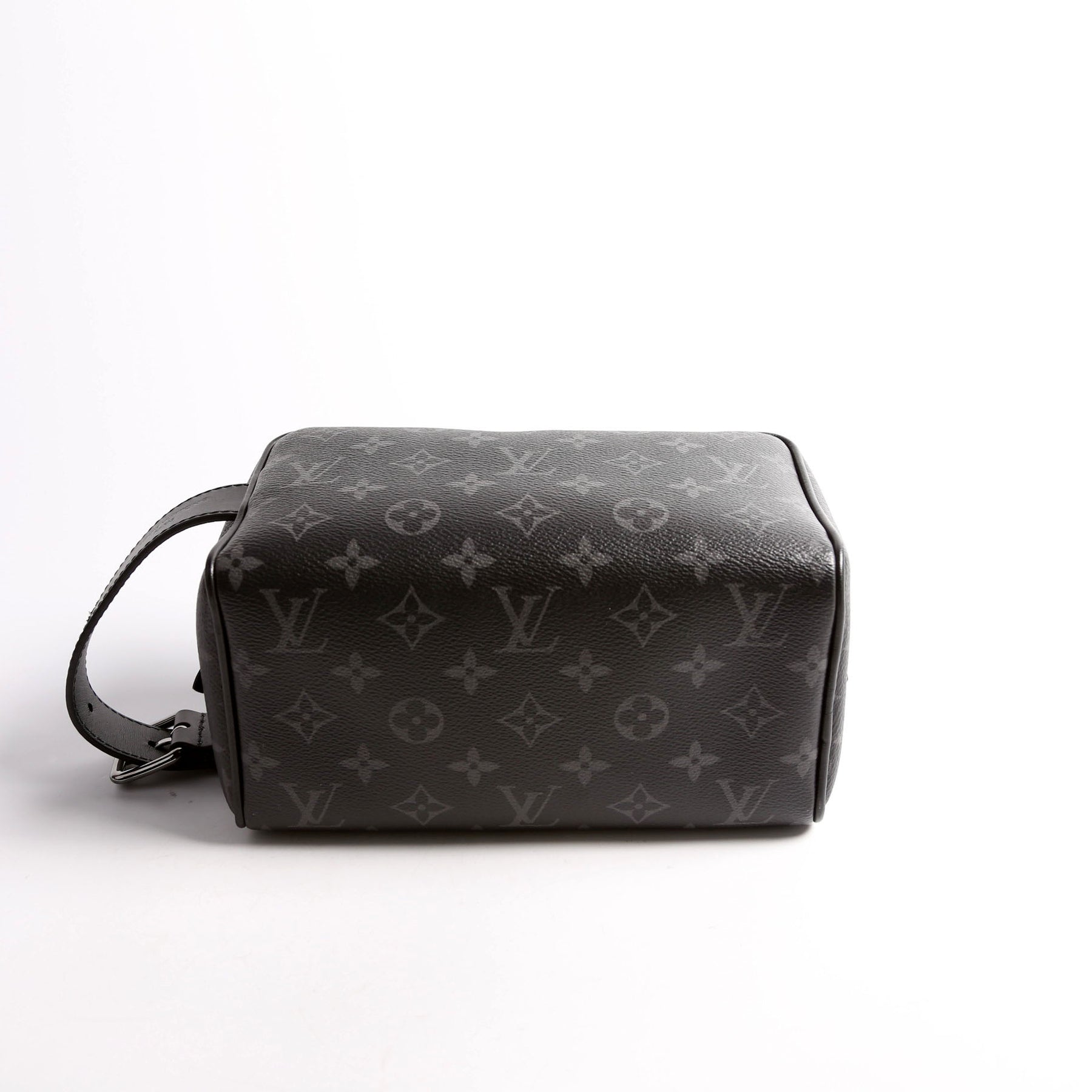 This pre-owned Louis Vuitton Locker Dopp Kit is guaranteed 100% authentic. The exterior is in the classic Monogram Eclipse coated canvas.