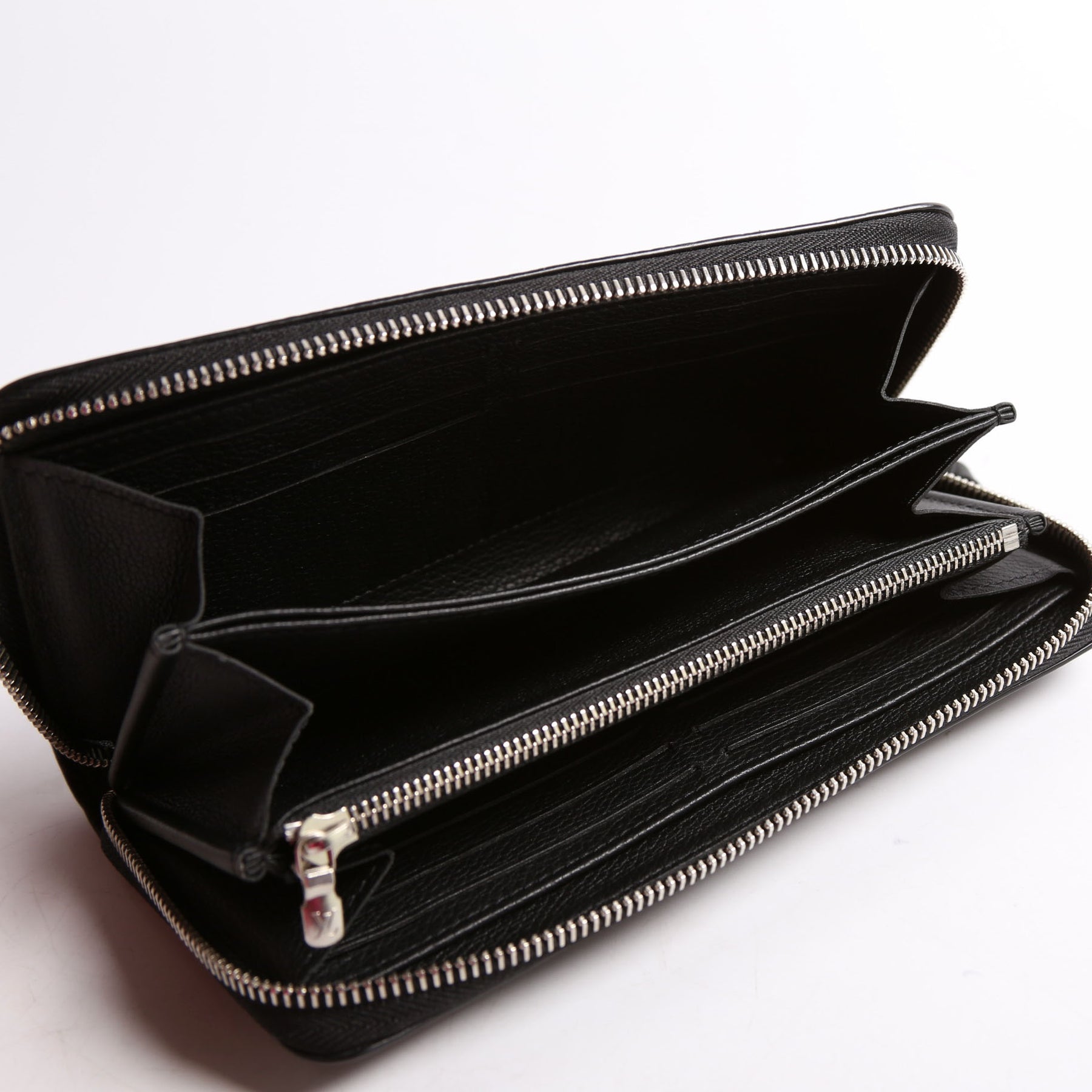 Interior: The interior is free of major wear and features twelve card slots, three cash slots, and one zipper pocket.