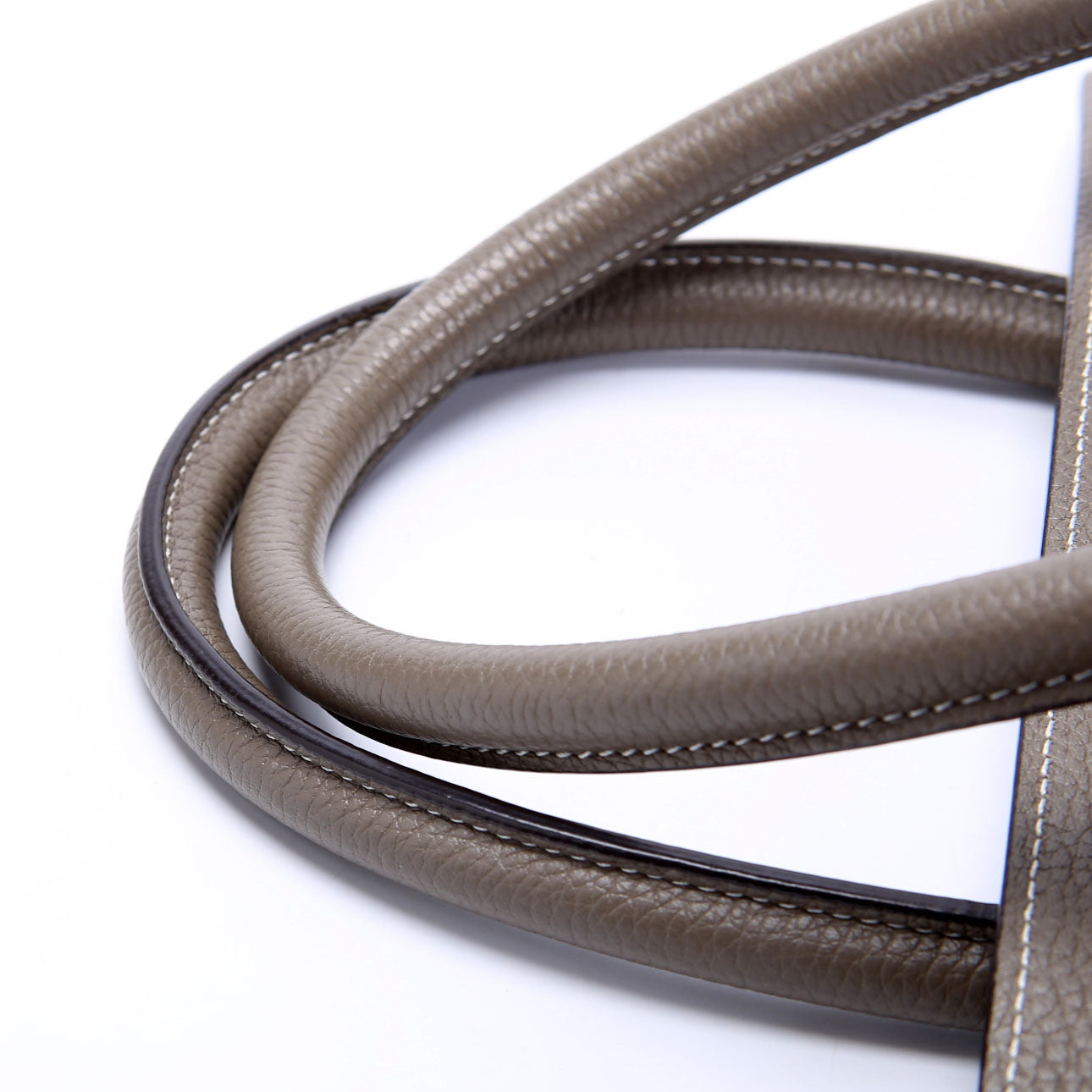 Exterior: The exterior leather shows light scuffs and scratches throughout. The corners show wear and rubbing.