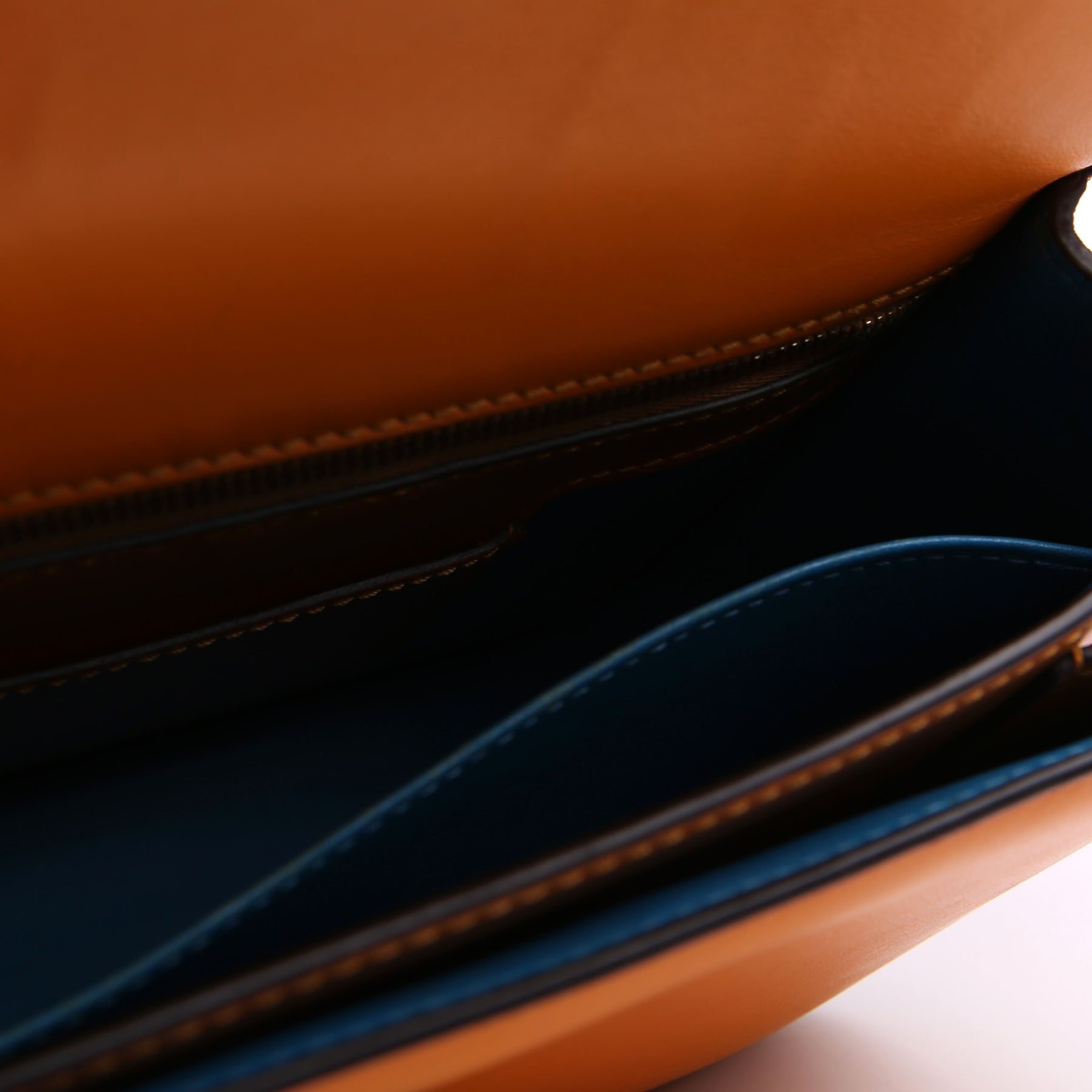 Interior: The interior is clean and free of rips or tears. The interior features two open pockets, one card slot, and one zipper pocket. The leather has minor signs of wear. The interior logo is fading.