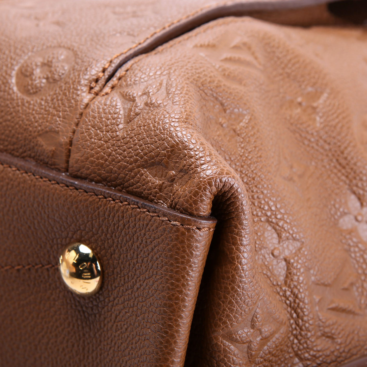 Handle: The leather handle is free from wear. The piping shows scuffs.