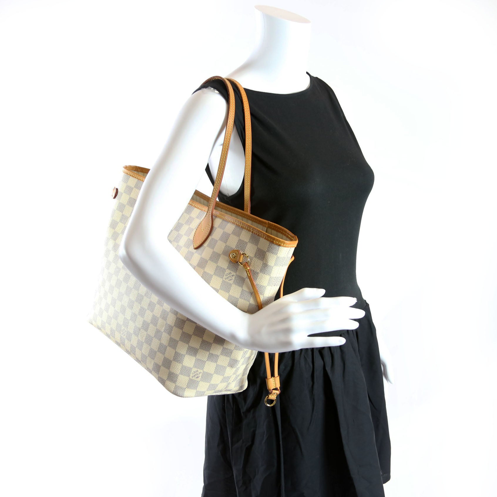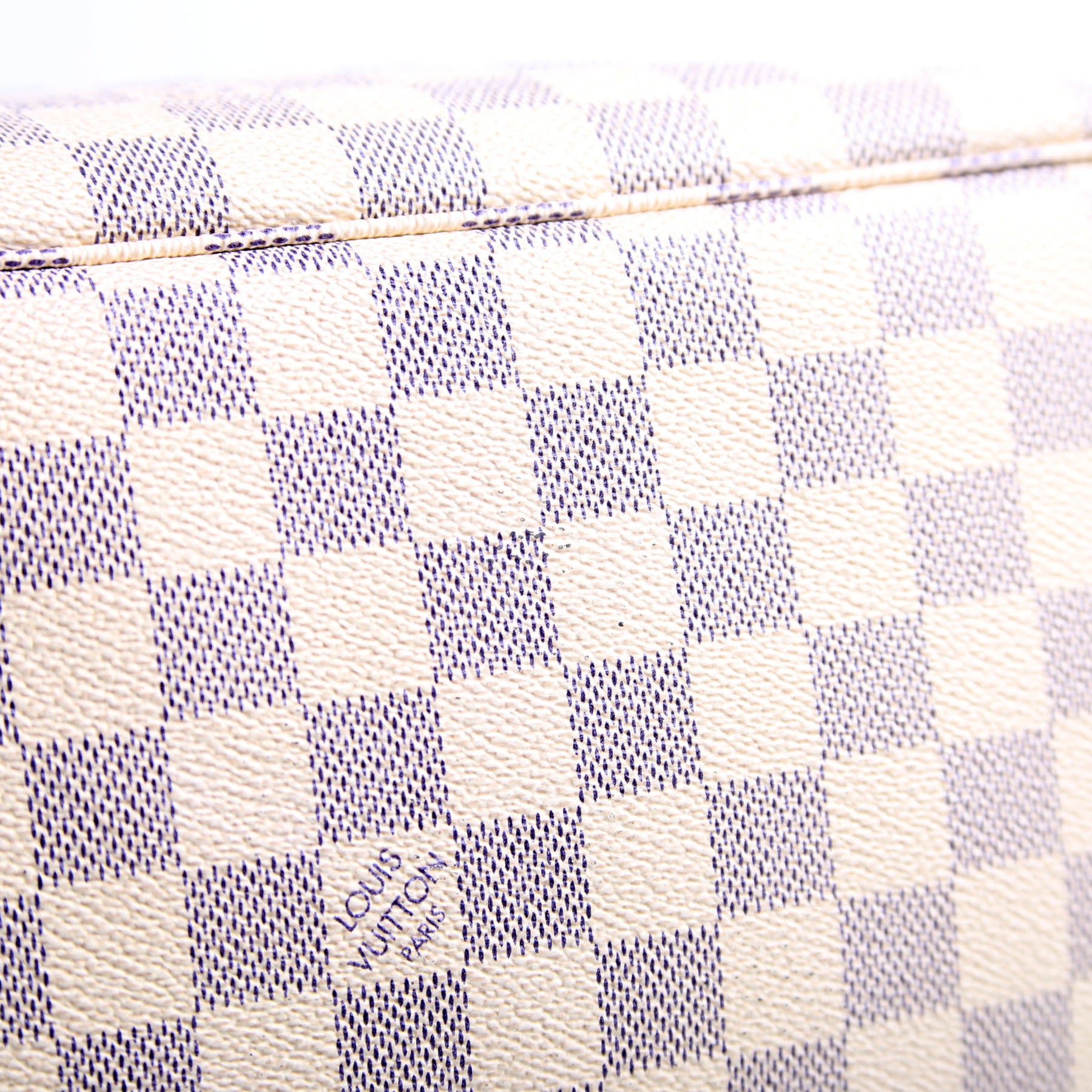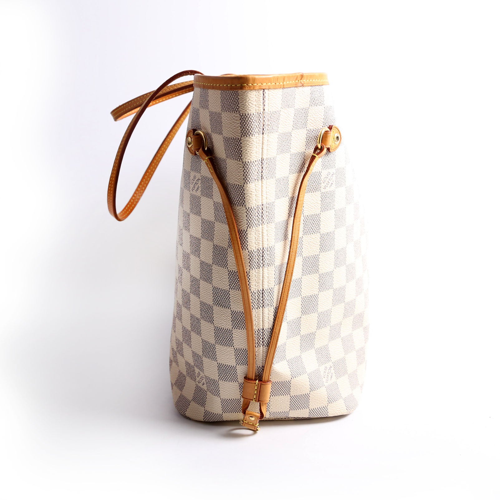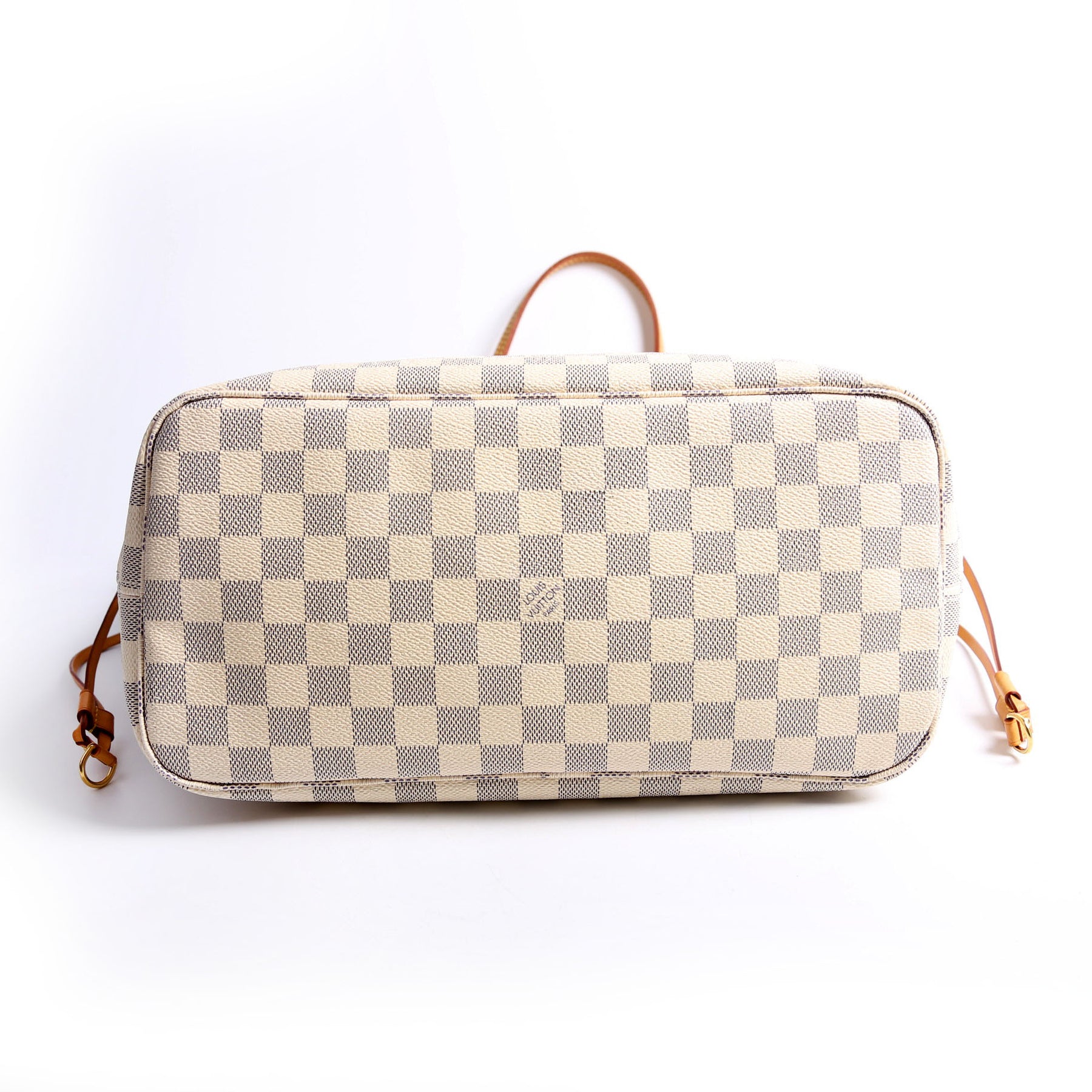 This pre-owned Louis Vuitton Neverfull MM is guaranteed 100% authentic. The exterior is in the classic Louis Vuitton Damier Azur coated canvas.