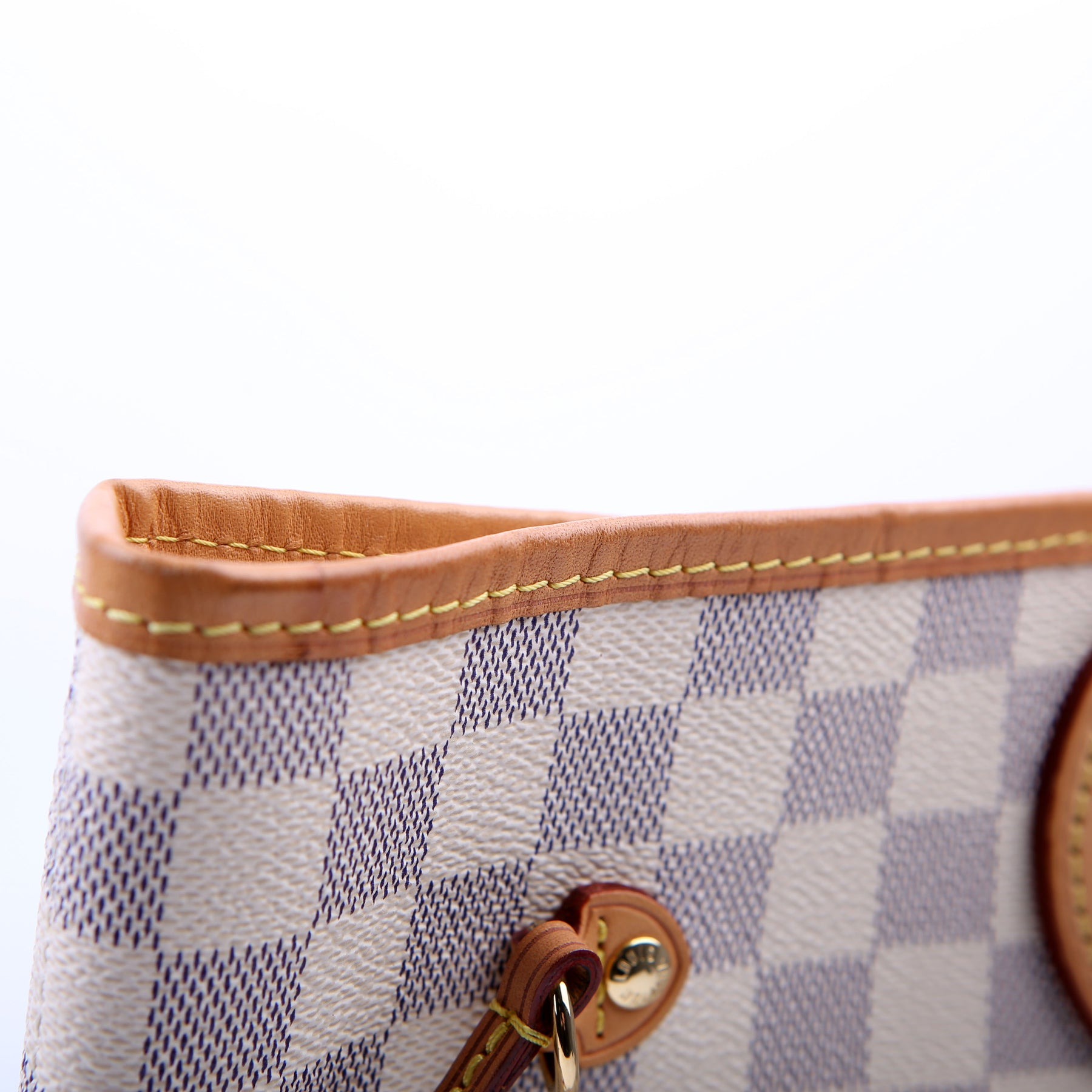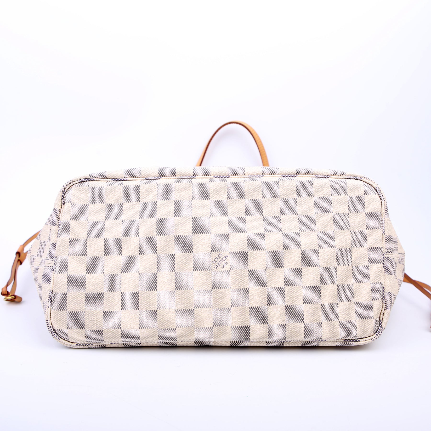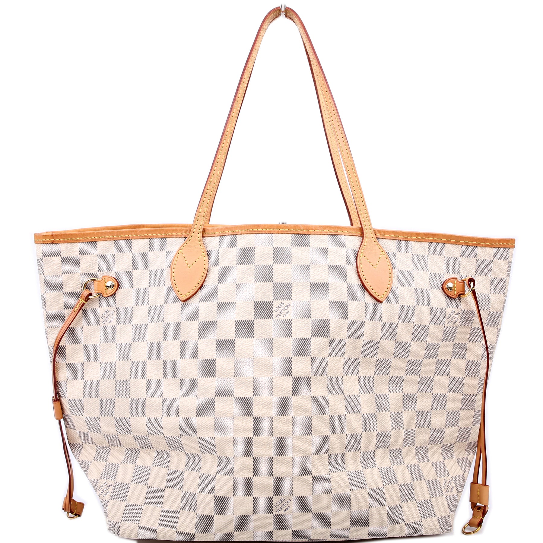 This pre-owned Louis Vuitton Neverfull MM is guaranteed 100% authentic. The exterior is in the classic Louis Vuitton Damier Azur coated canvas.