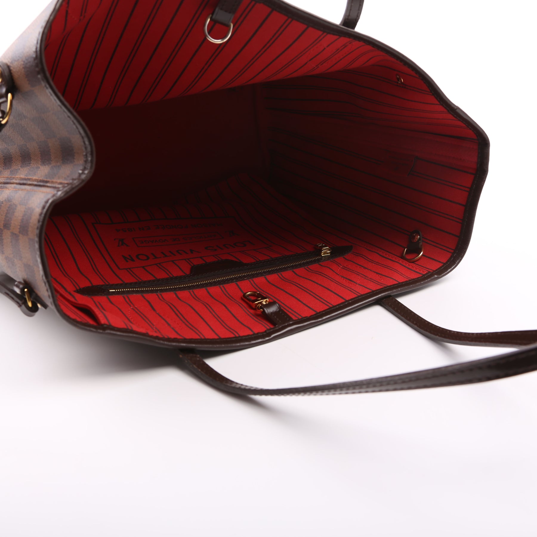 This pre-owned Louis Vuitton Neverfull MM is guaranteed 100% authentic. The exterior is in the classic Louis Vuitton Damier Ebene coated canvas.