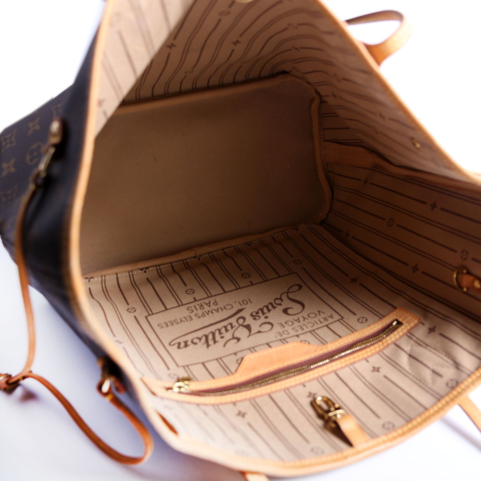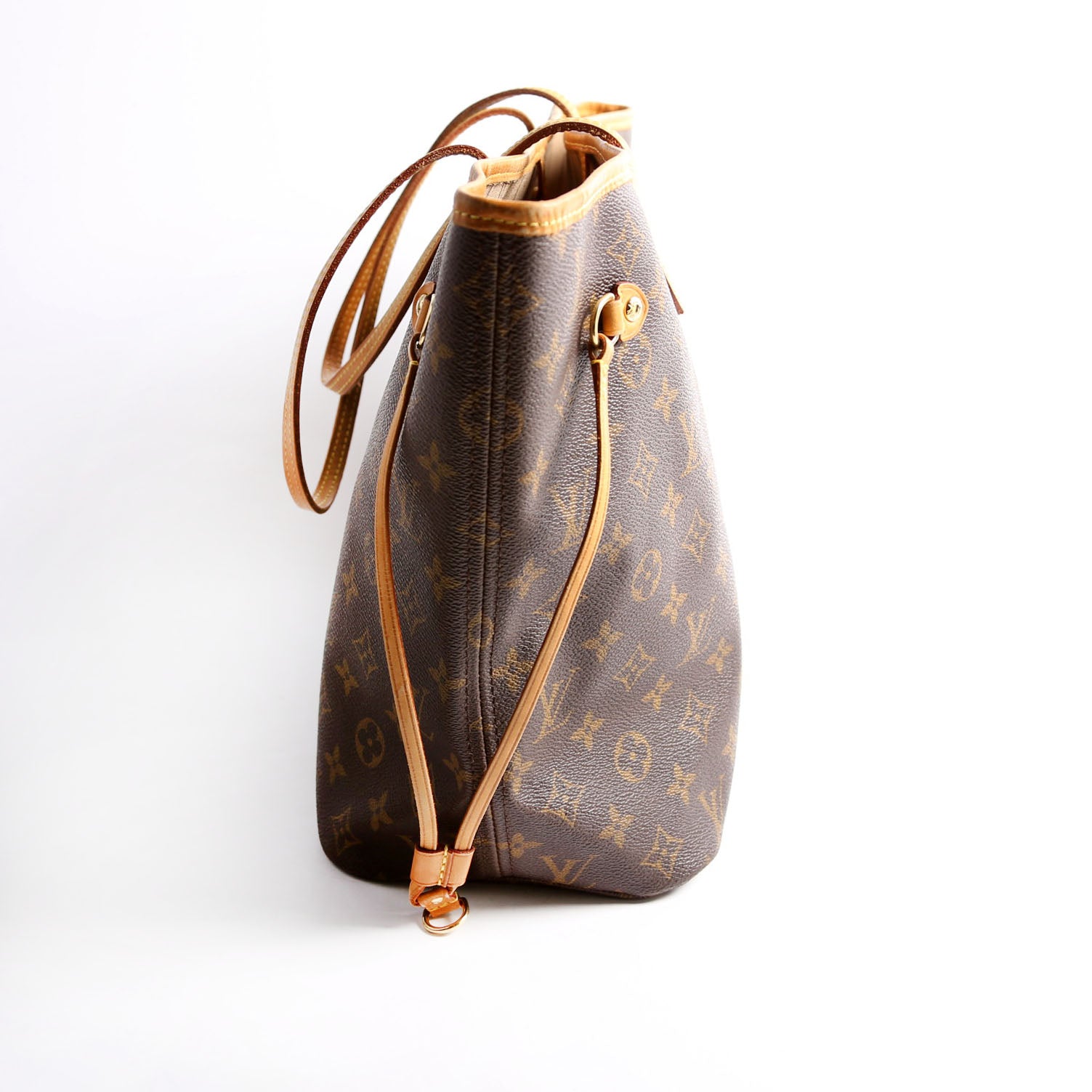 This pre-owned Louis Vuitton Neverfull MM is guaranteed 100% authentic. The exterior is in the classic Louis Vuitton Monogram coated canvas.