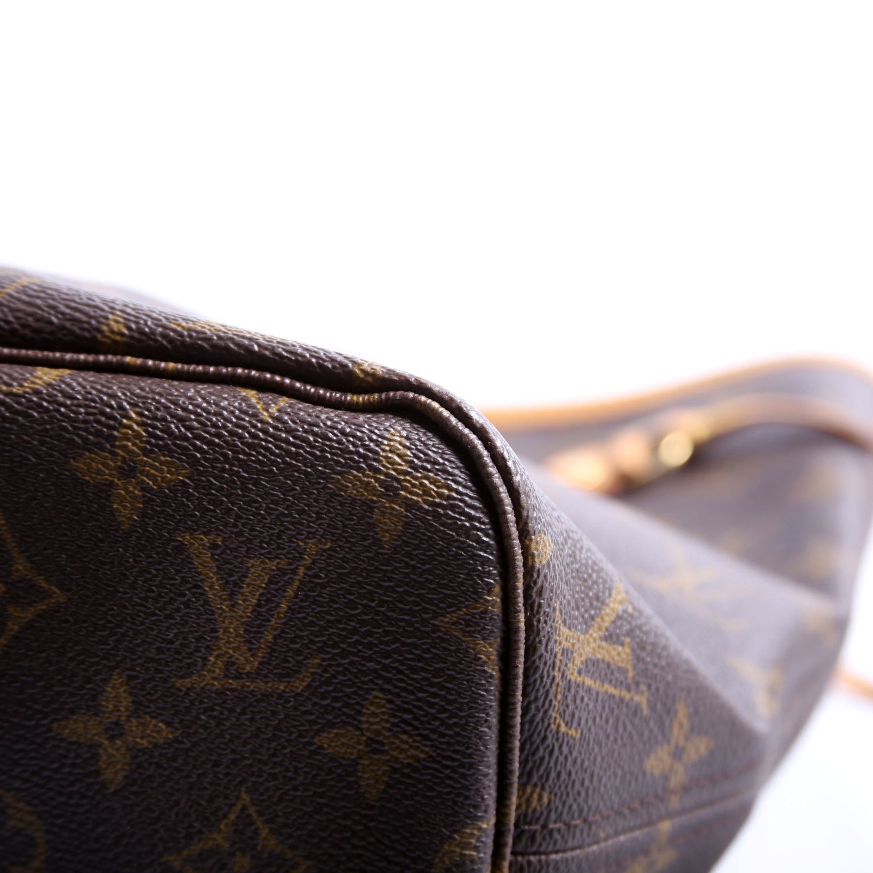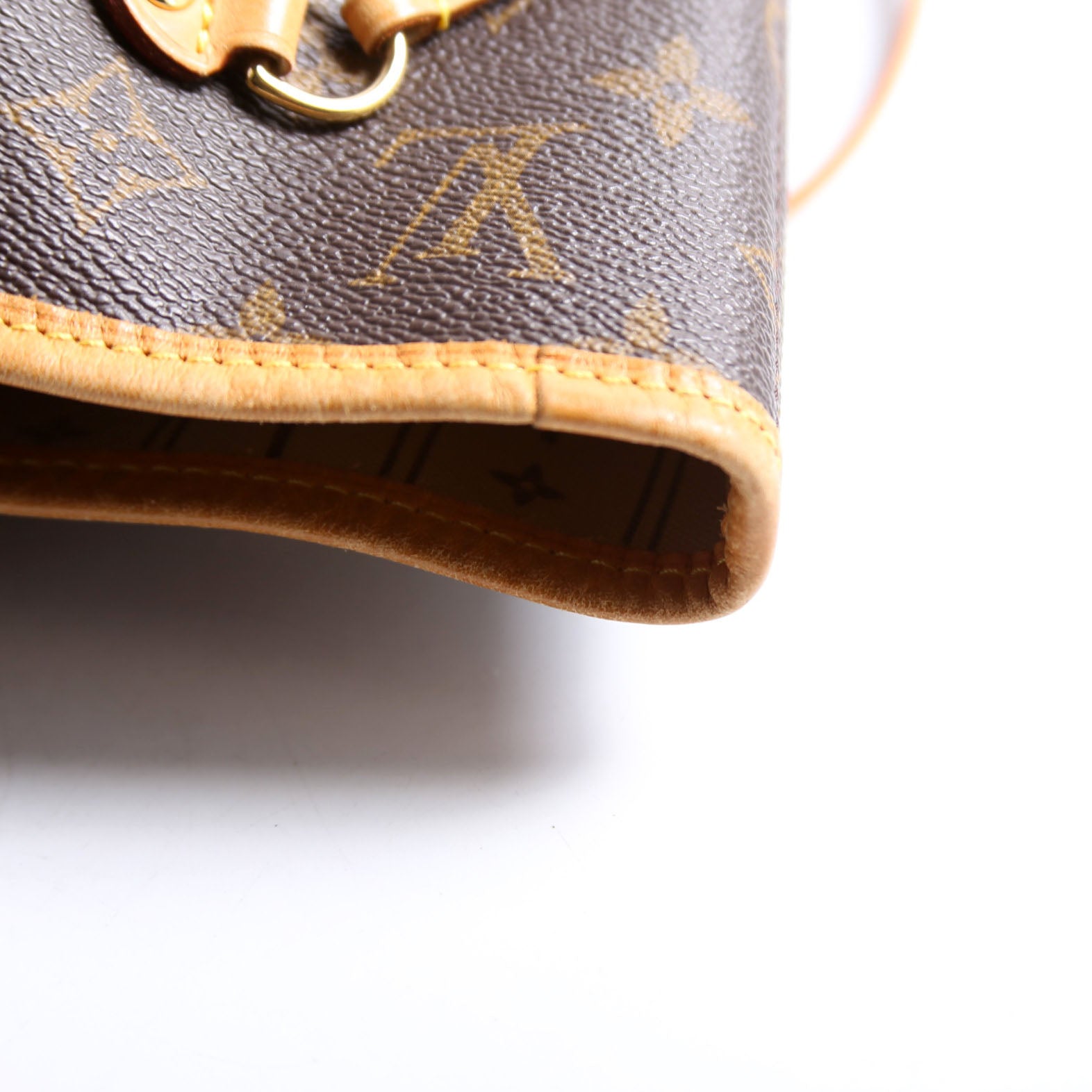 Exterior: The exterior coated canvas has light wear to the corners. The leather trim has discoloration.