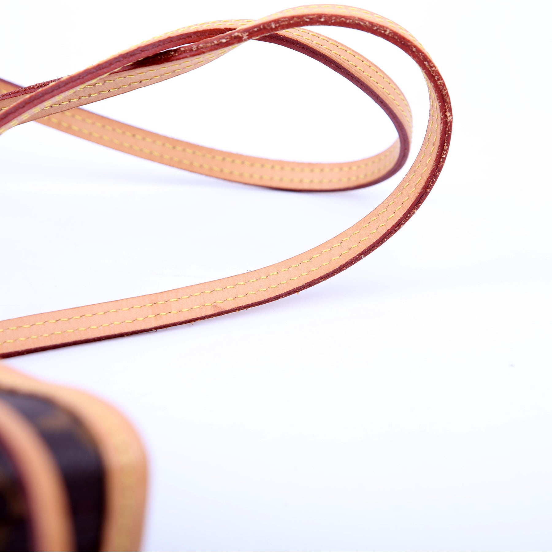 Handle: The leather handles show minor wear and discoloration.