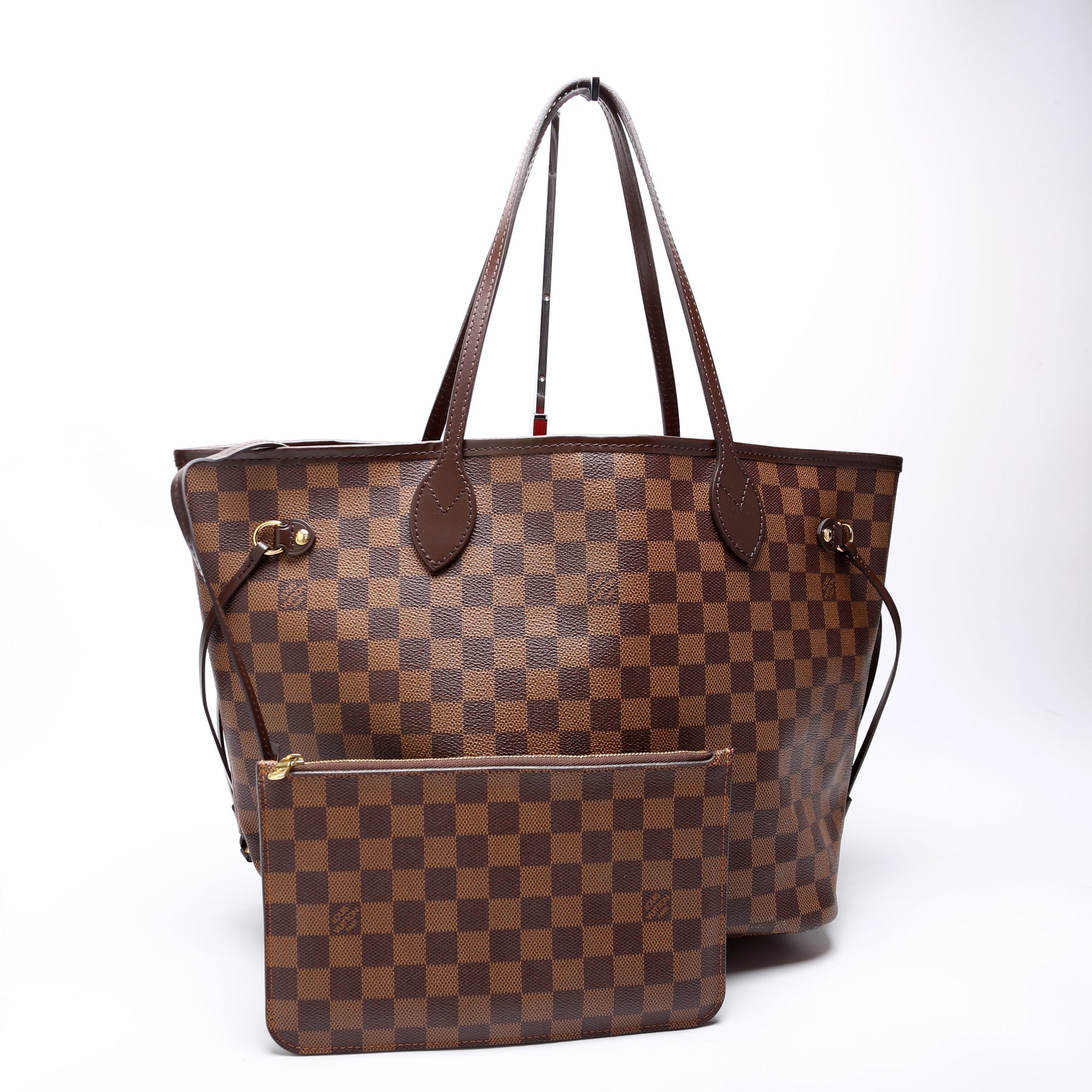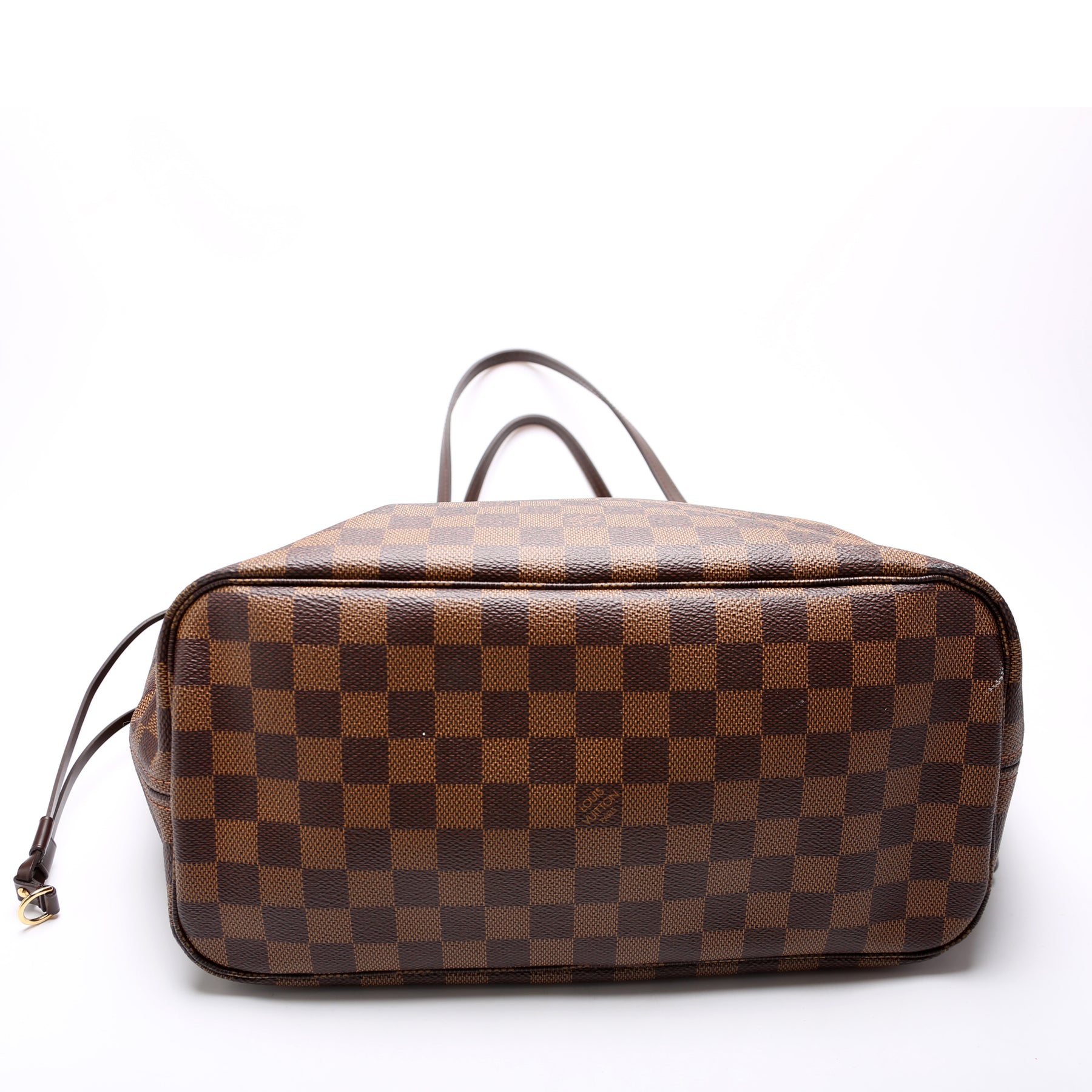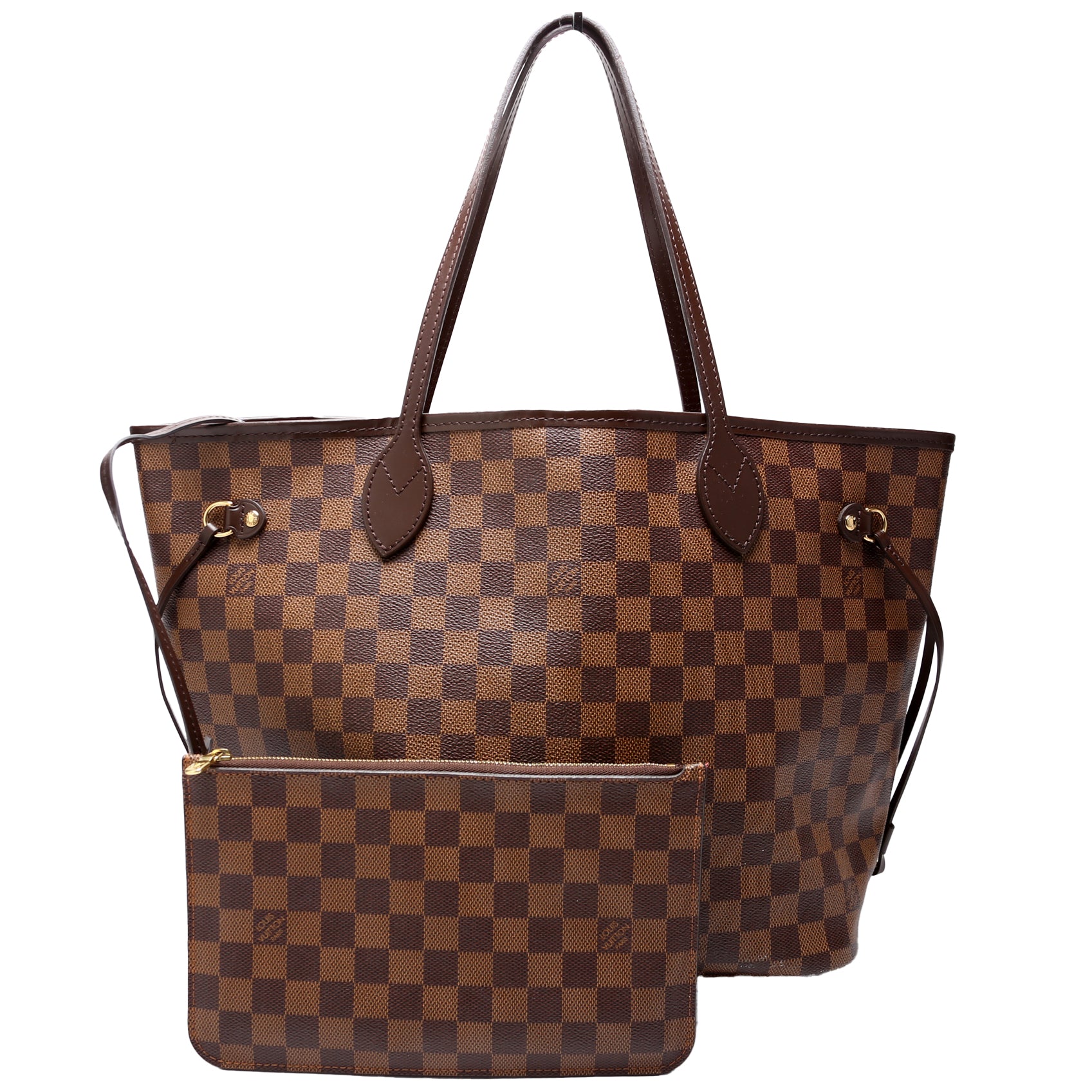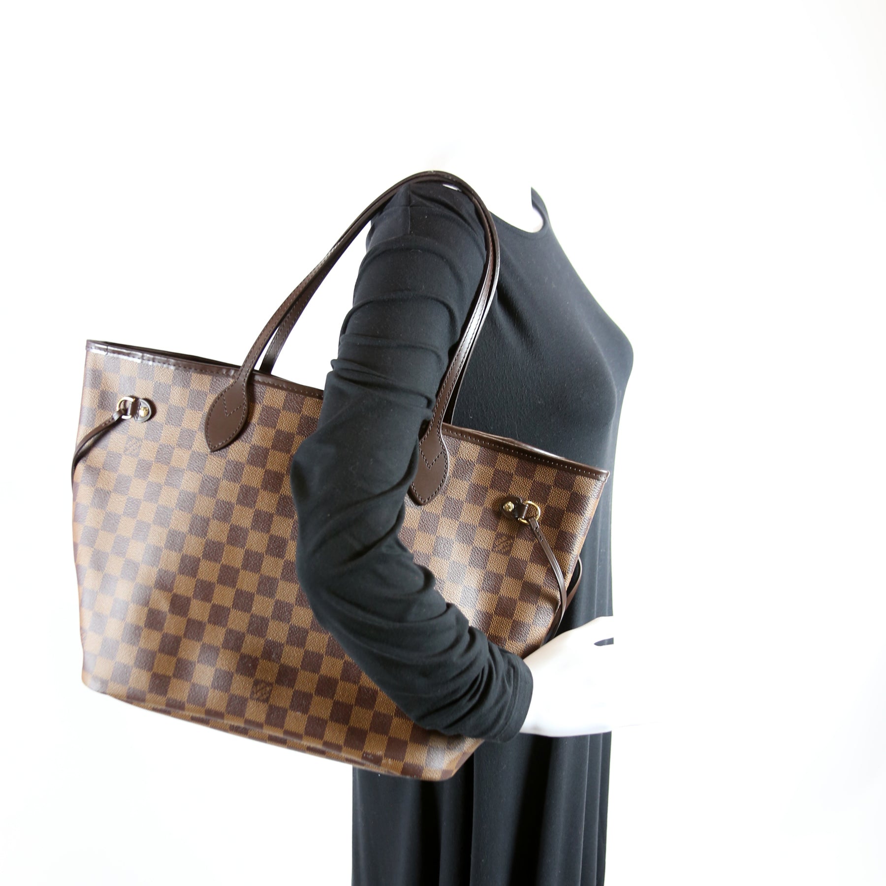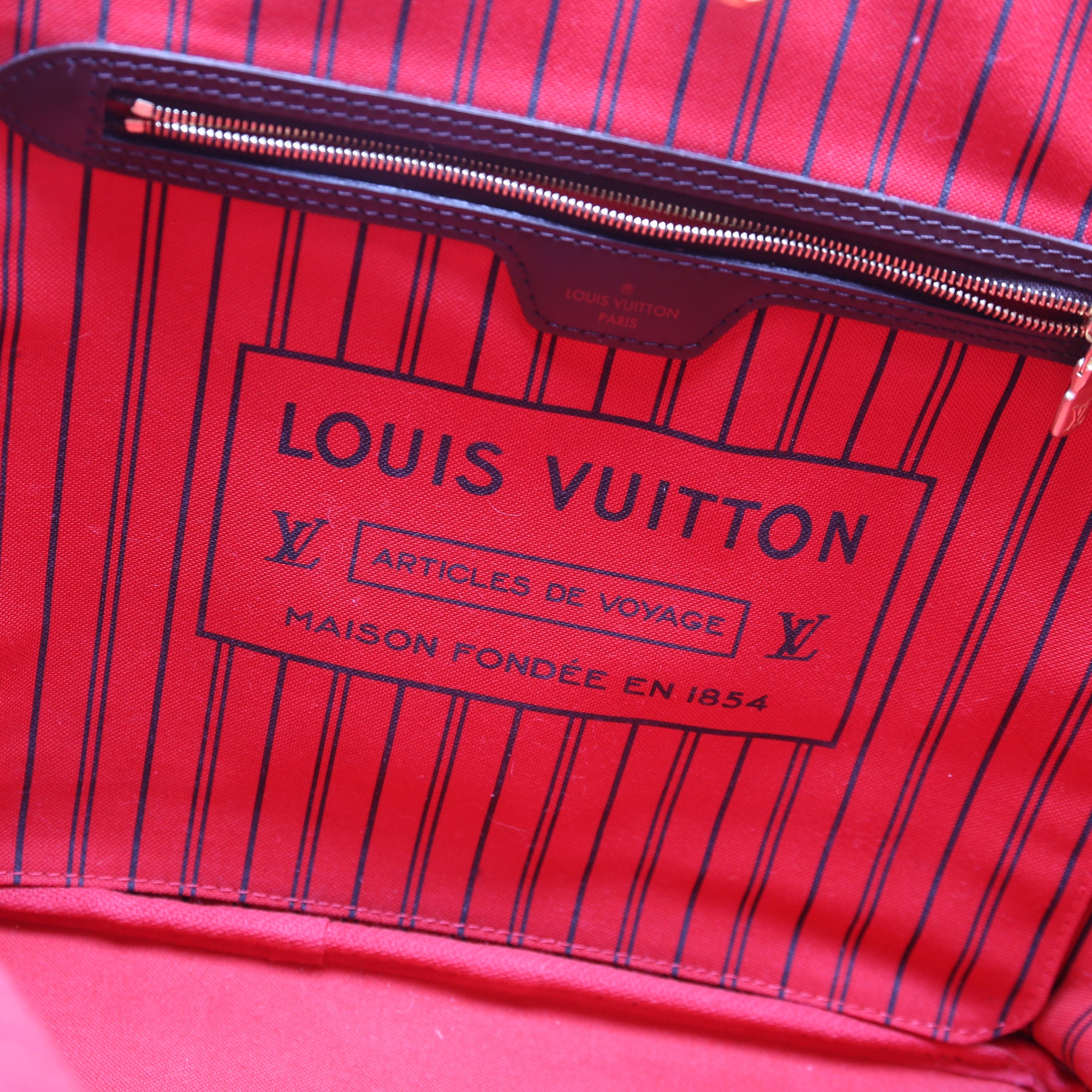 This pre-owned Louis Vuitton Neverfull MM W/Wallet is guaranteed 100% authentic. The exterior is in the classic Louis Vuitton Damier Ebene coated canvas.