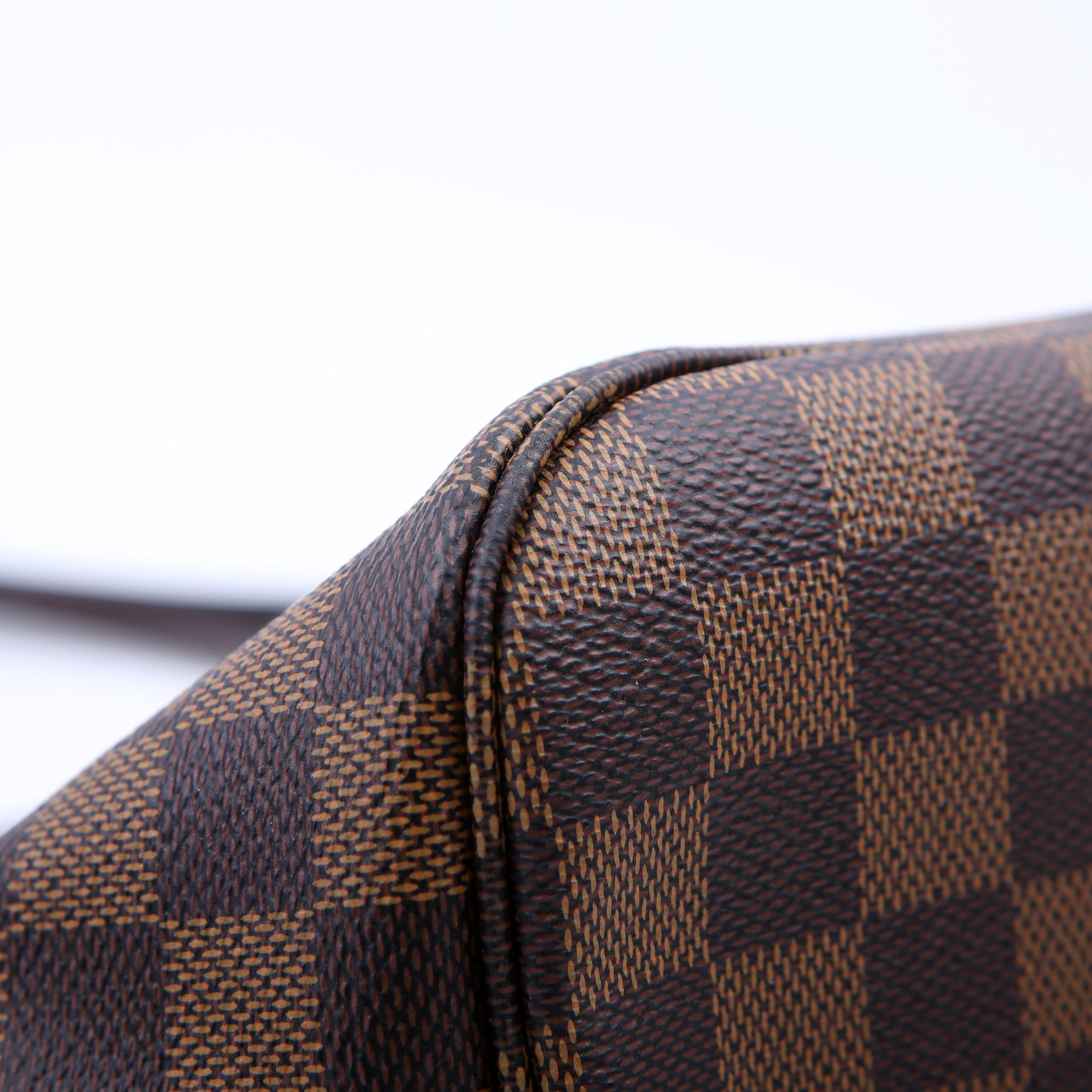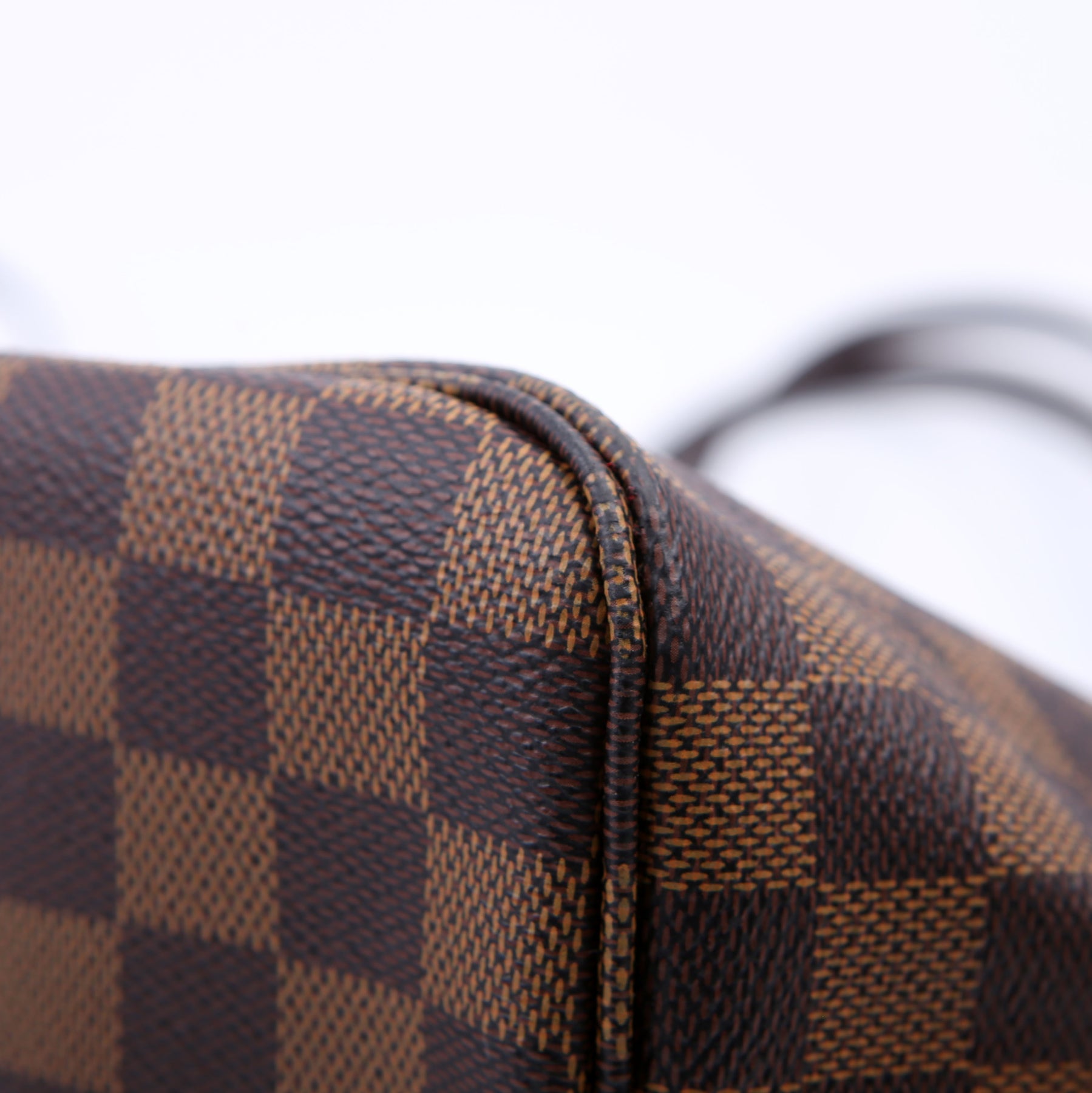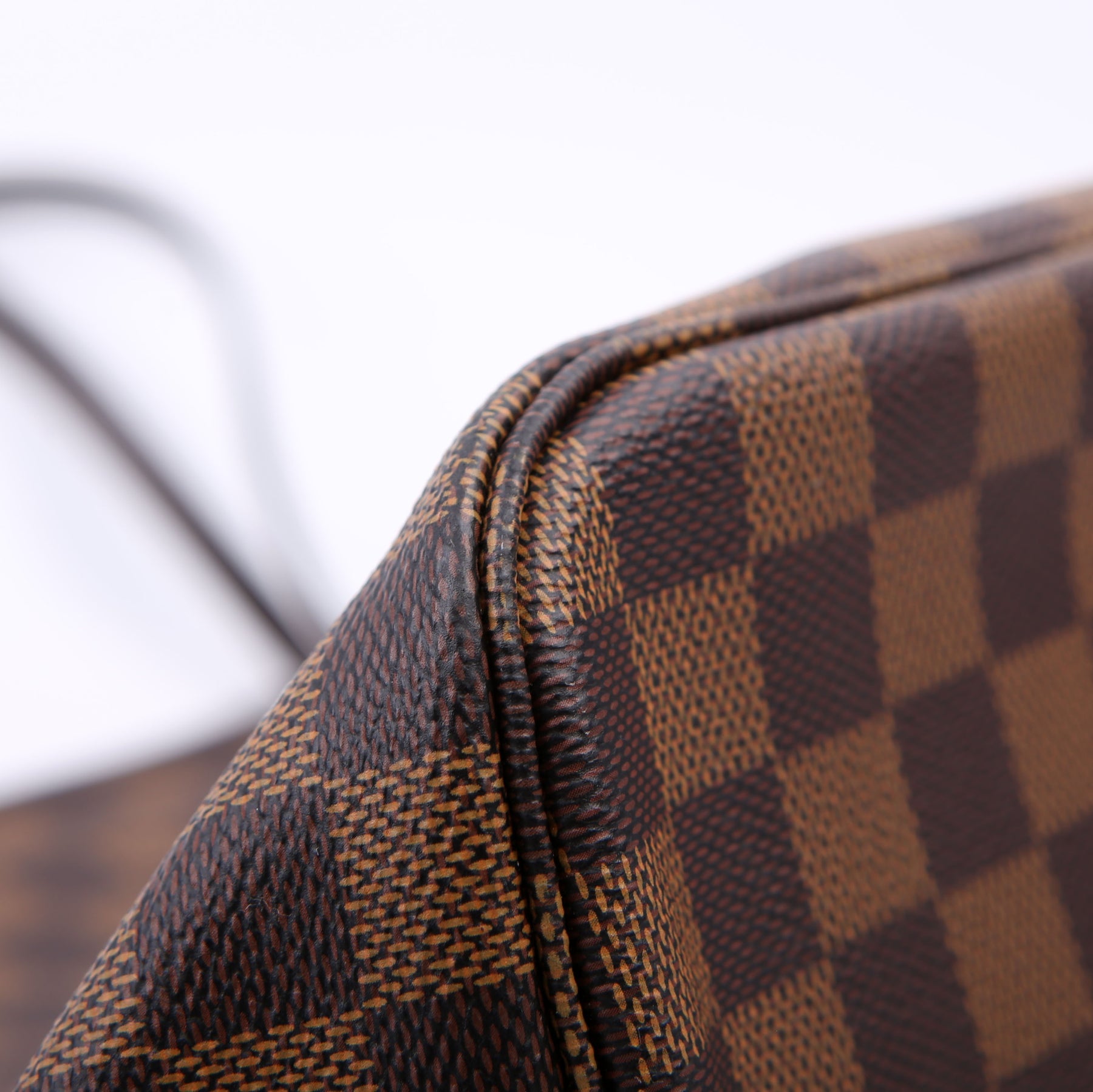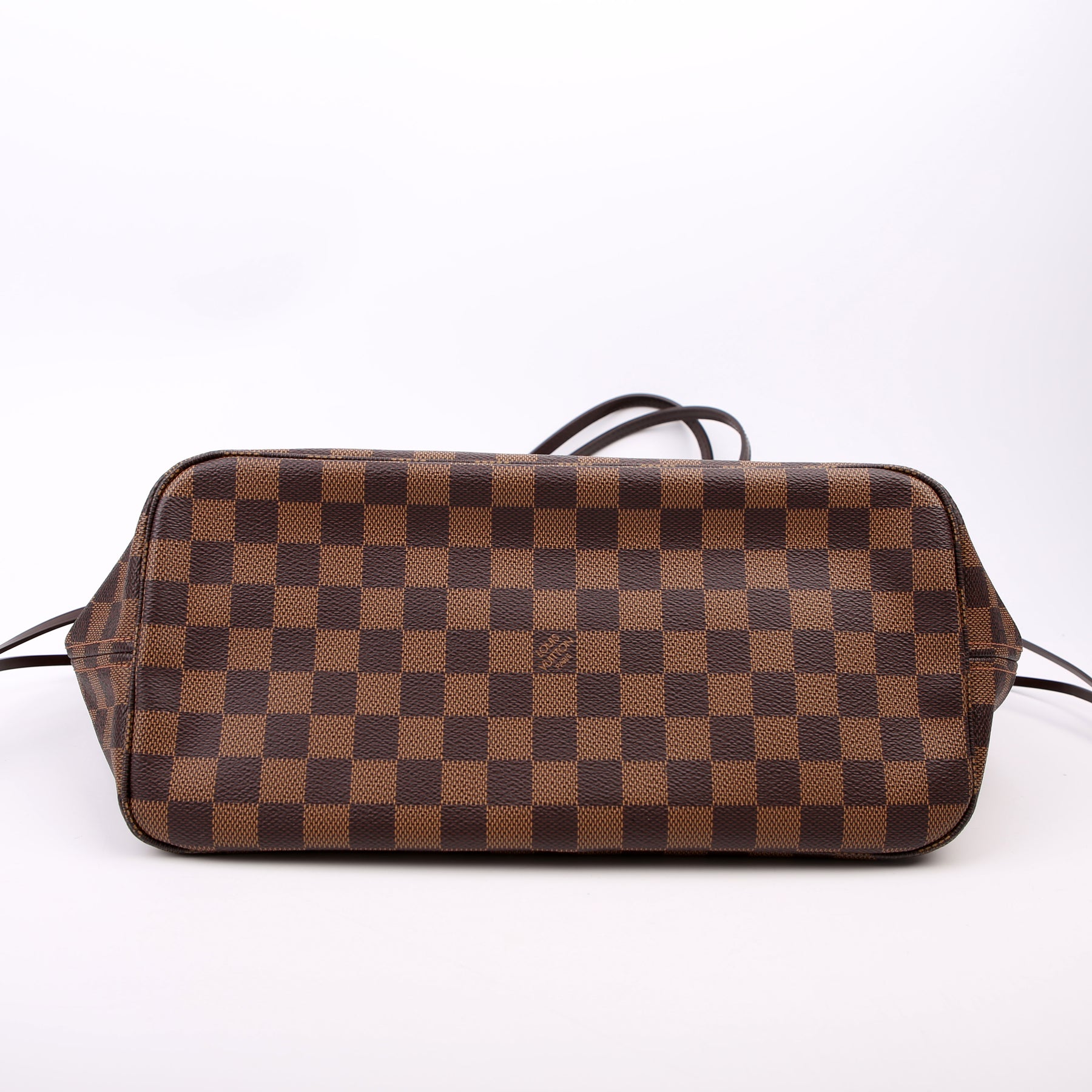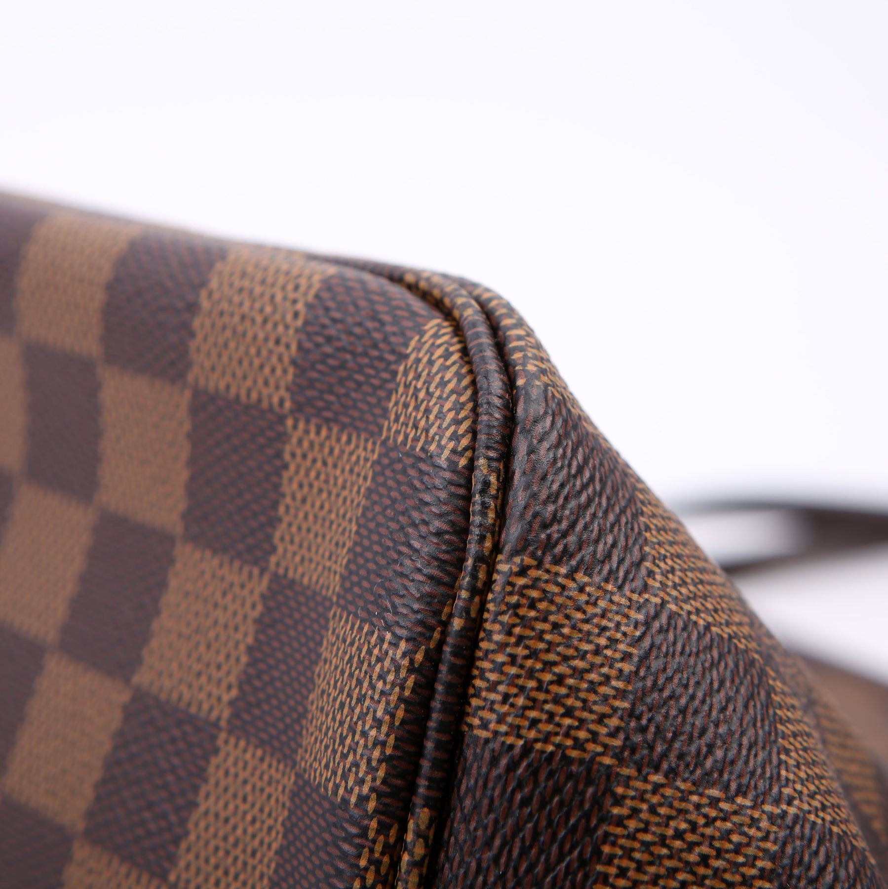 This pre-owned Louis Vuitton Neverfull MM With Wallet is guaranteed 100% authentic. The exterior is in the classic Louis Vuitton Damier Ebene coated canvas.