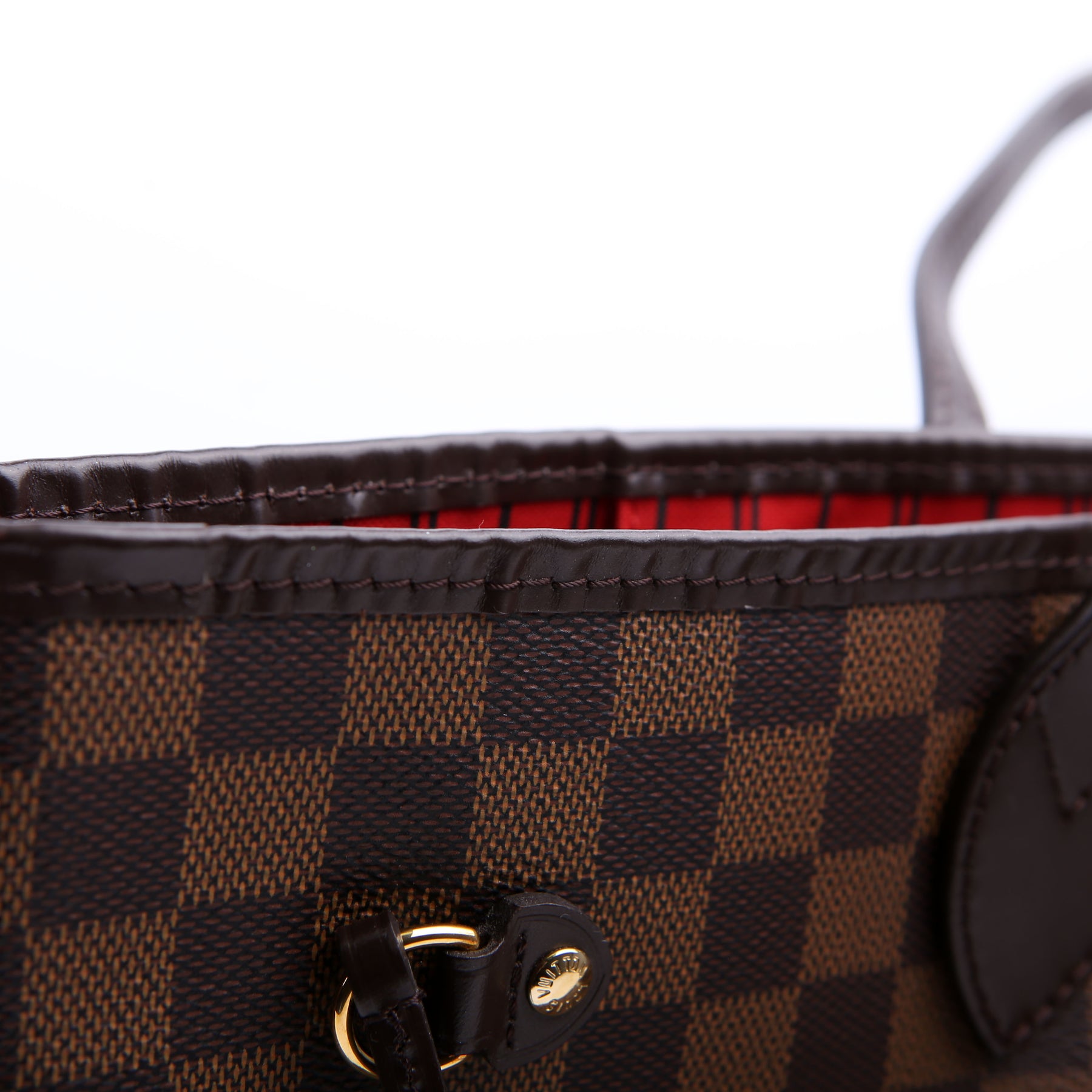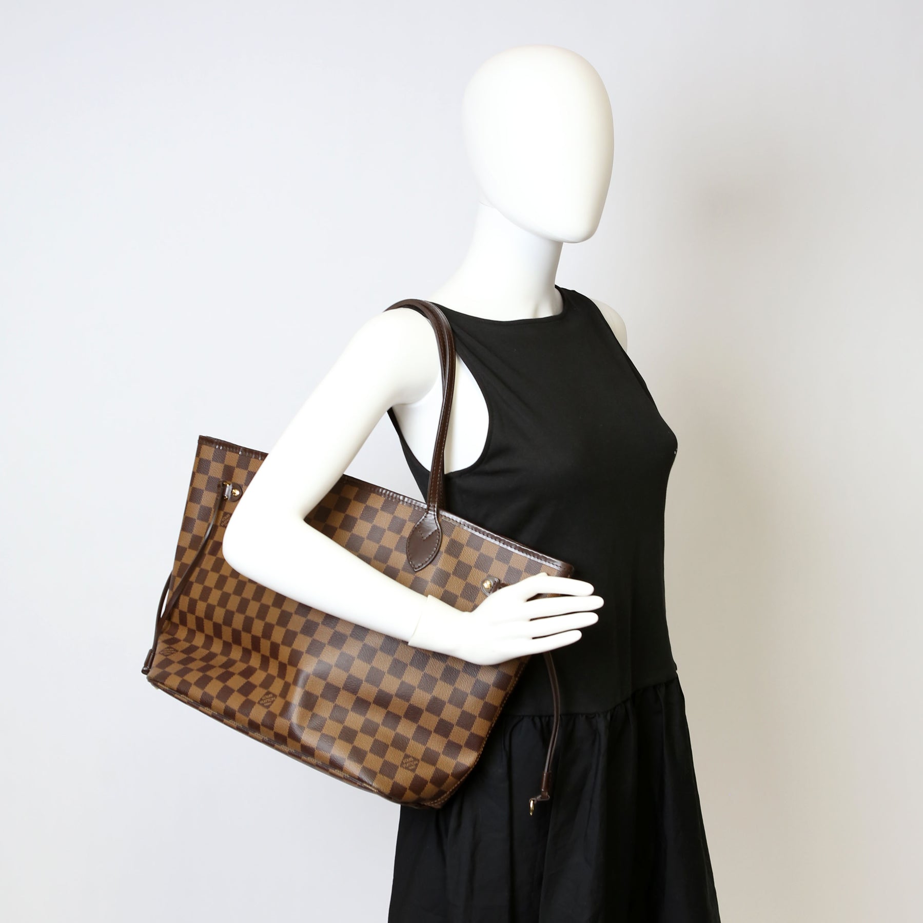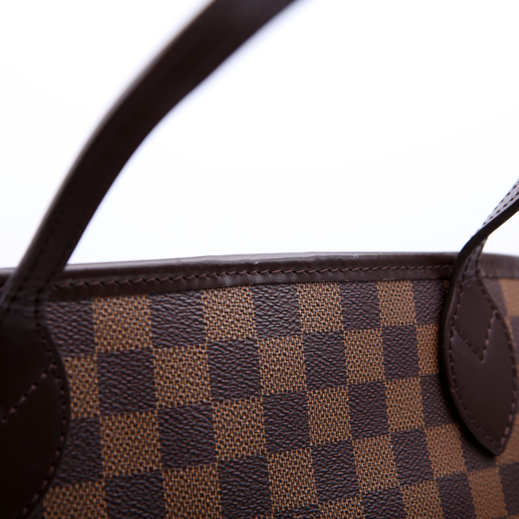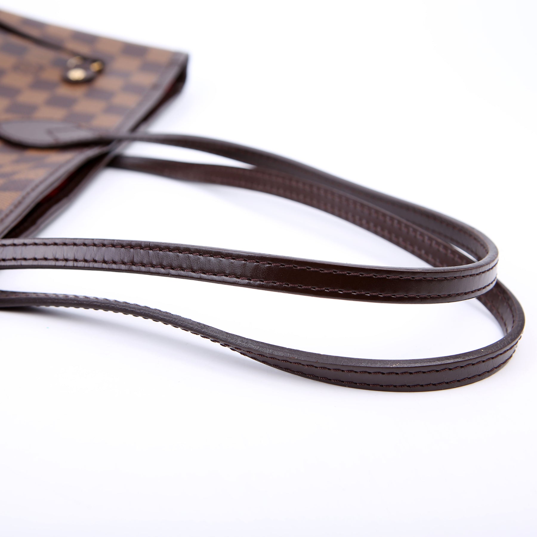 This pre-owned Louis Vuitton Neverfull MM With Wallet is guaranteed 100% authentic. The exterior is in the classic Louis Vuitton Damier Ebene coated canvas.