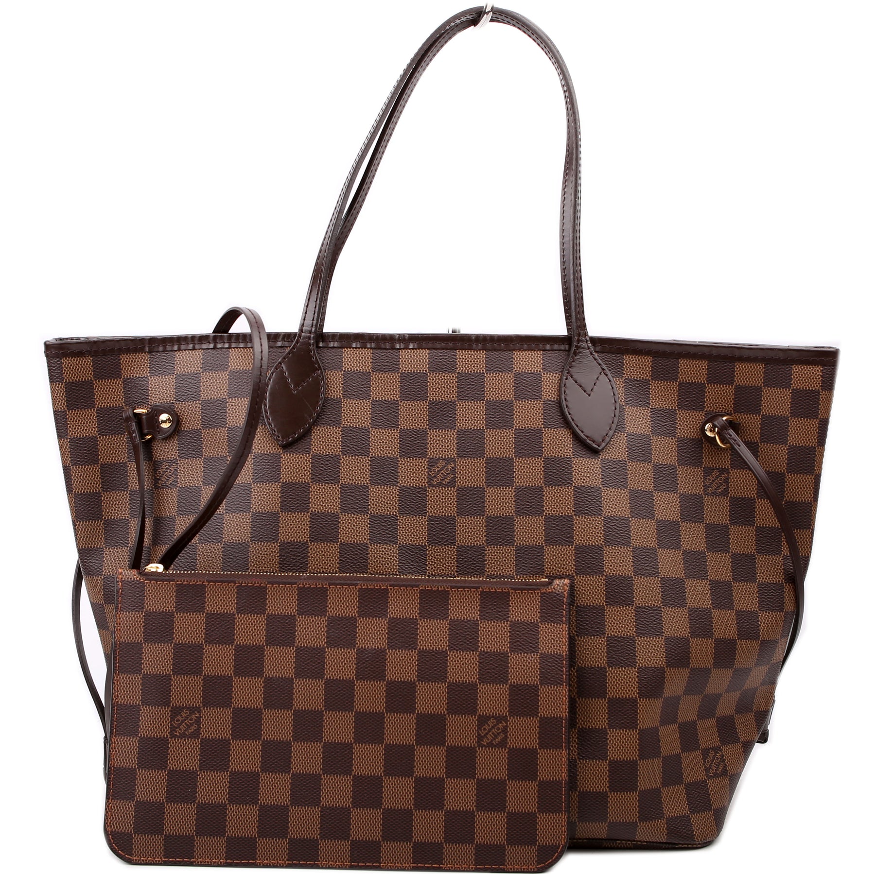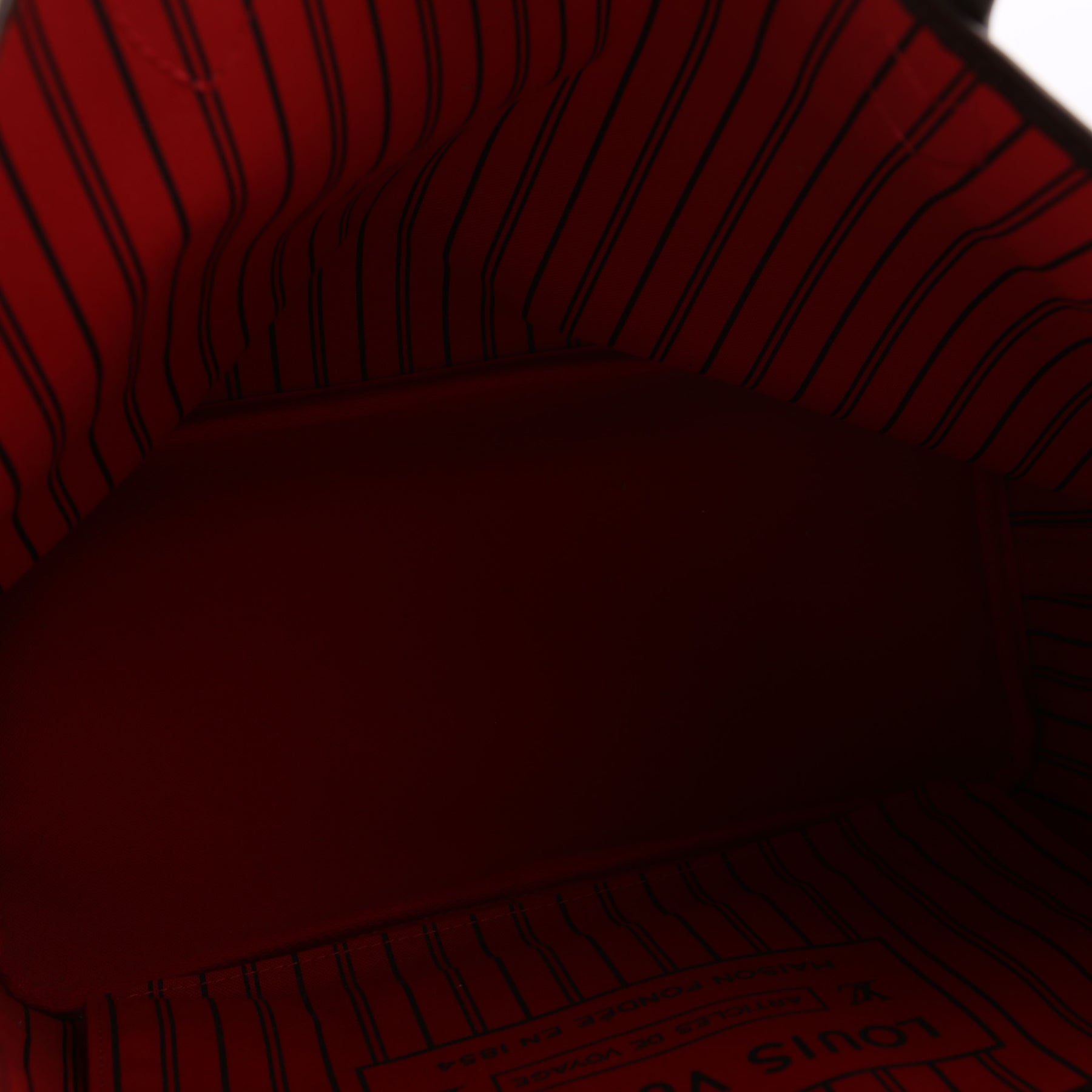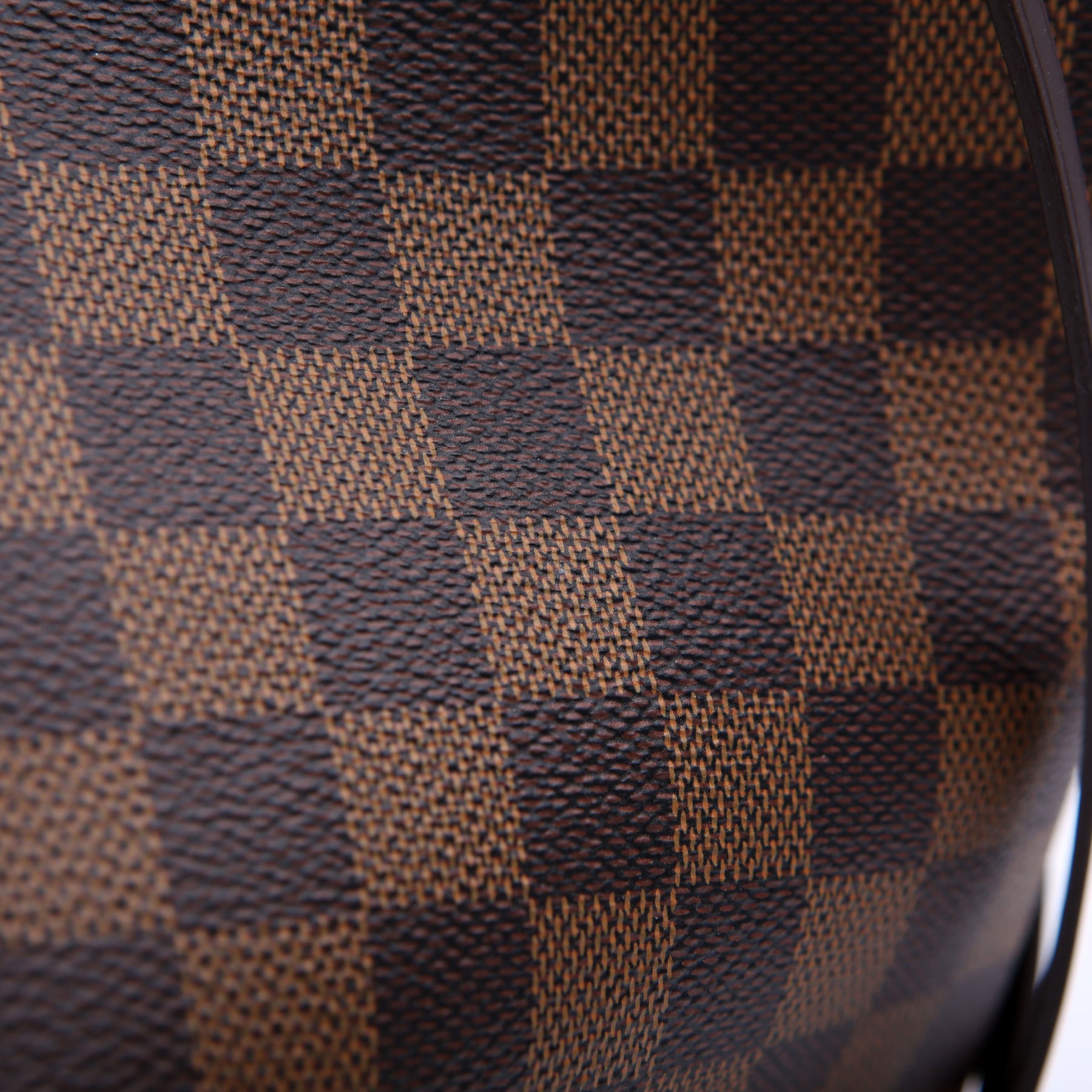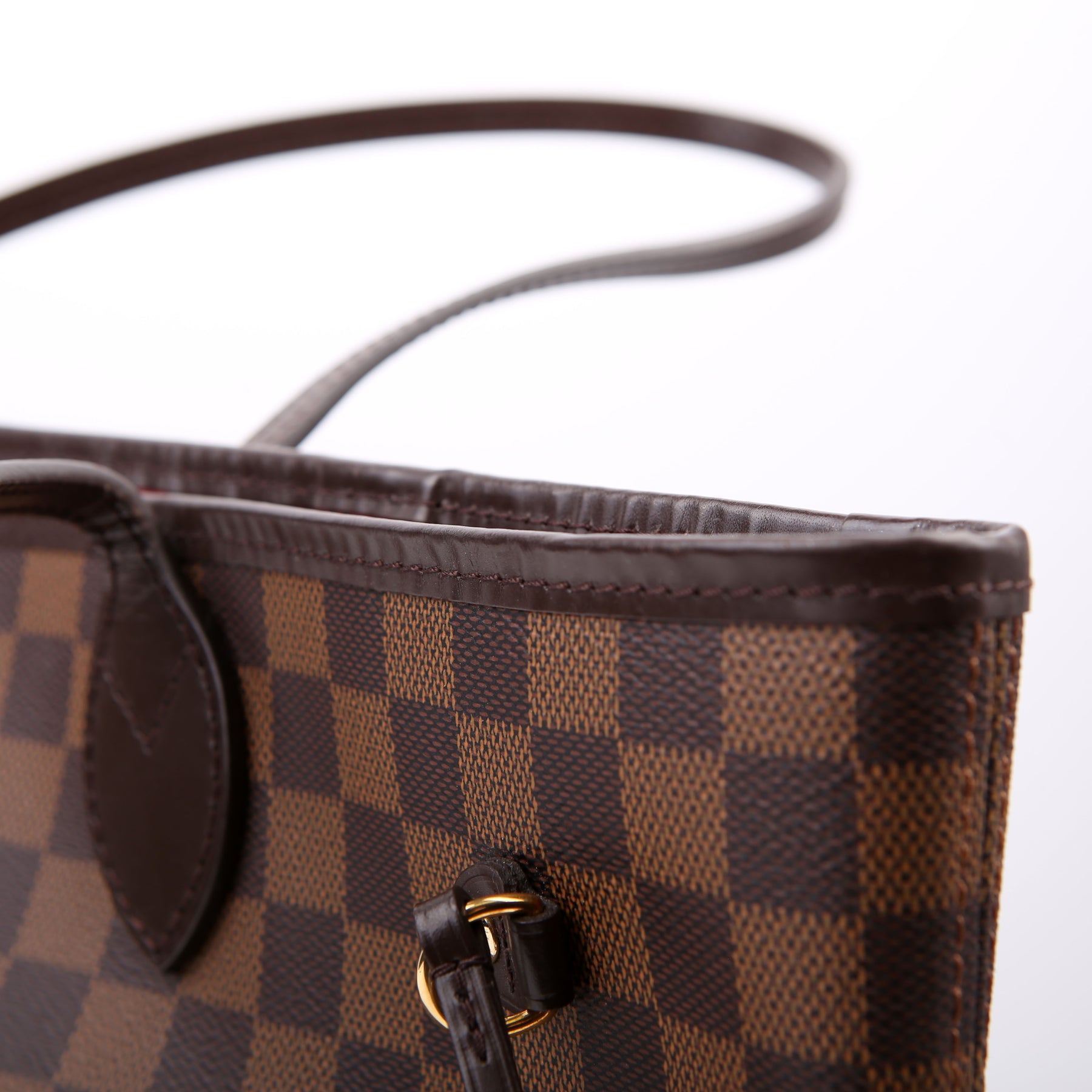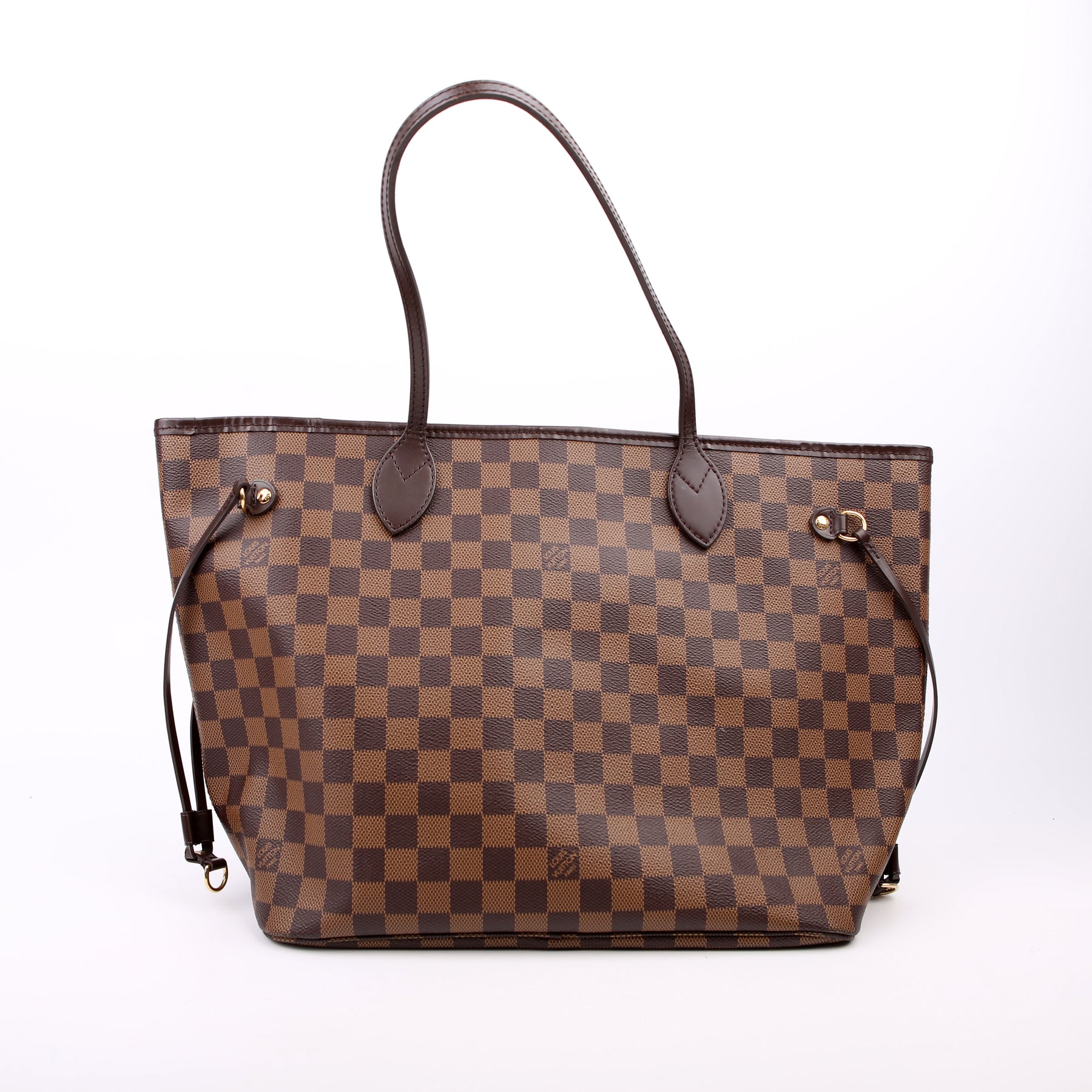 This pre-owned Louis Vuitton Neverfull MM With Wallet is guaranteed 100% authentic. The exterior is in the classic Louis Vuitton Damier Ebene coated canvas.