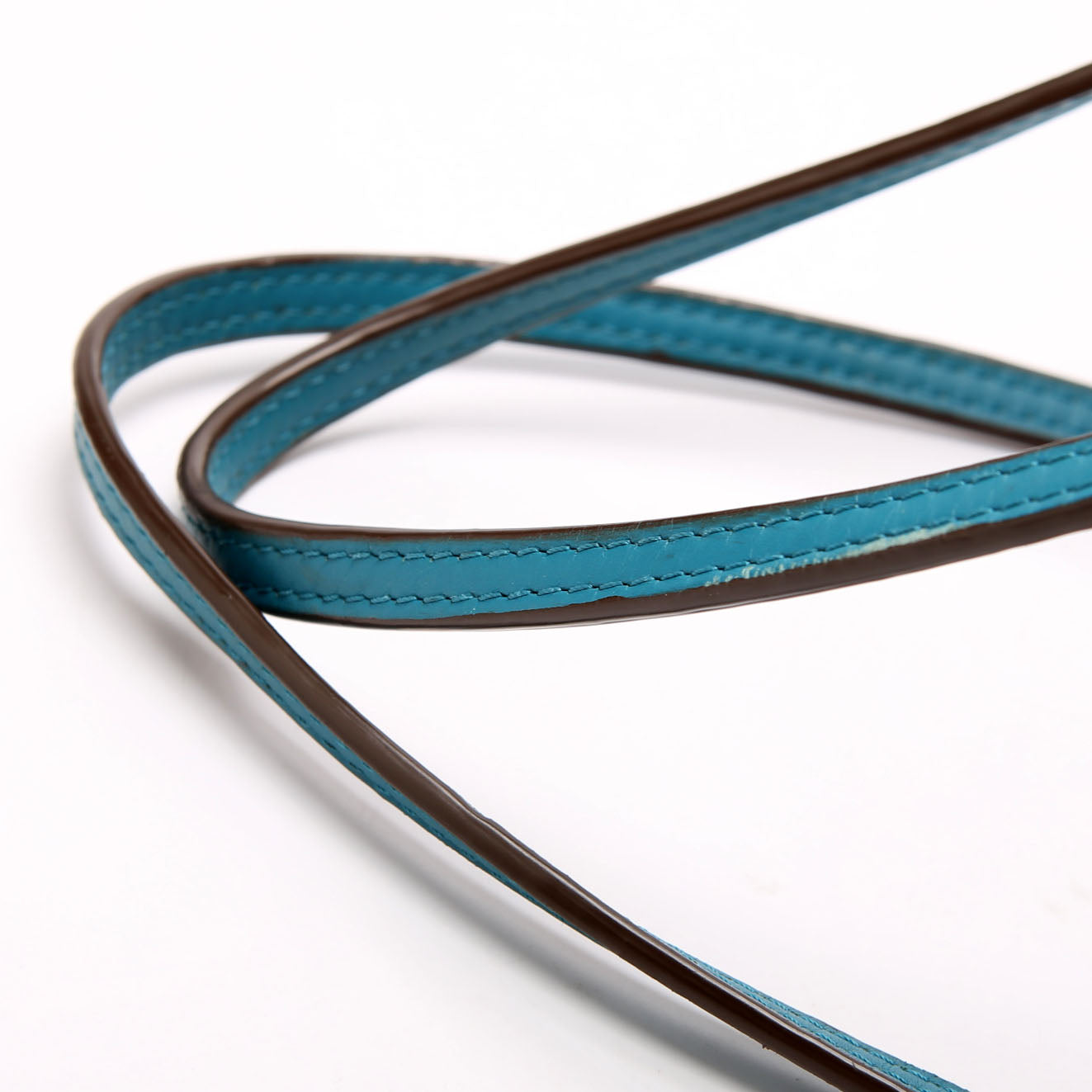 Exterior: The exterior leather shows scratches and scuffs throughout. The leather piping shows heavy wear, rubbing, and scuffs.