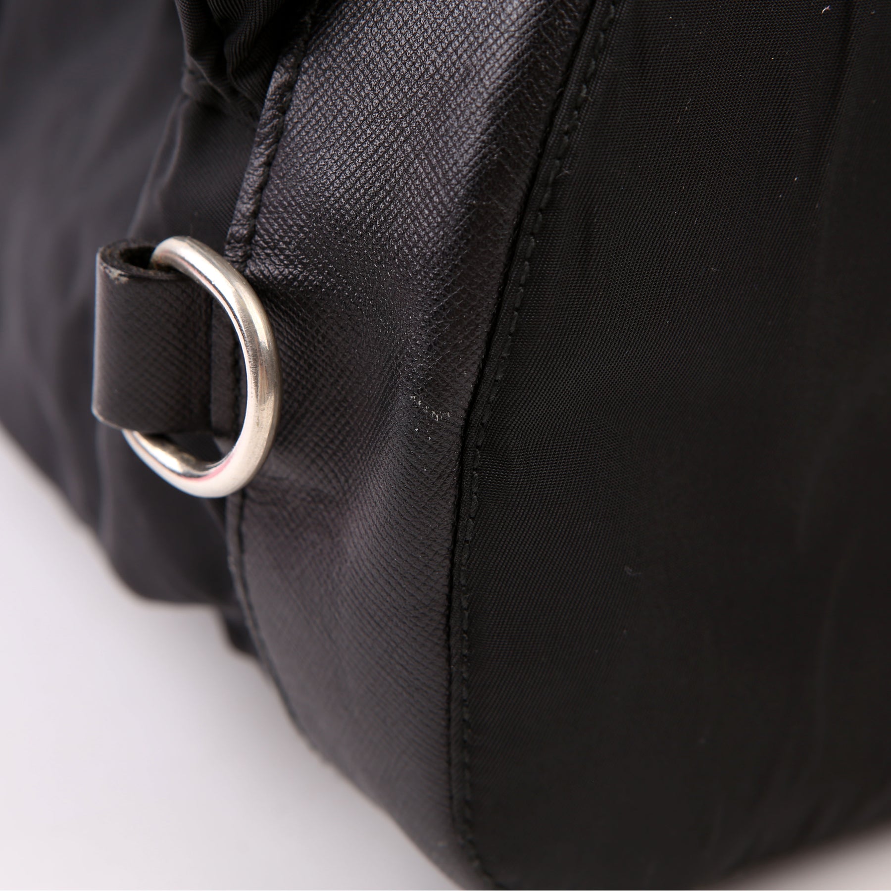 Exterior: The exterior nylon has light marks throughout. The leather trim shows minor wear throughout. The exterior features two zipper pockets.