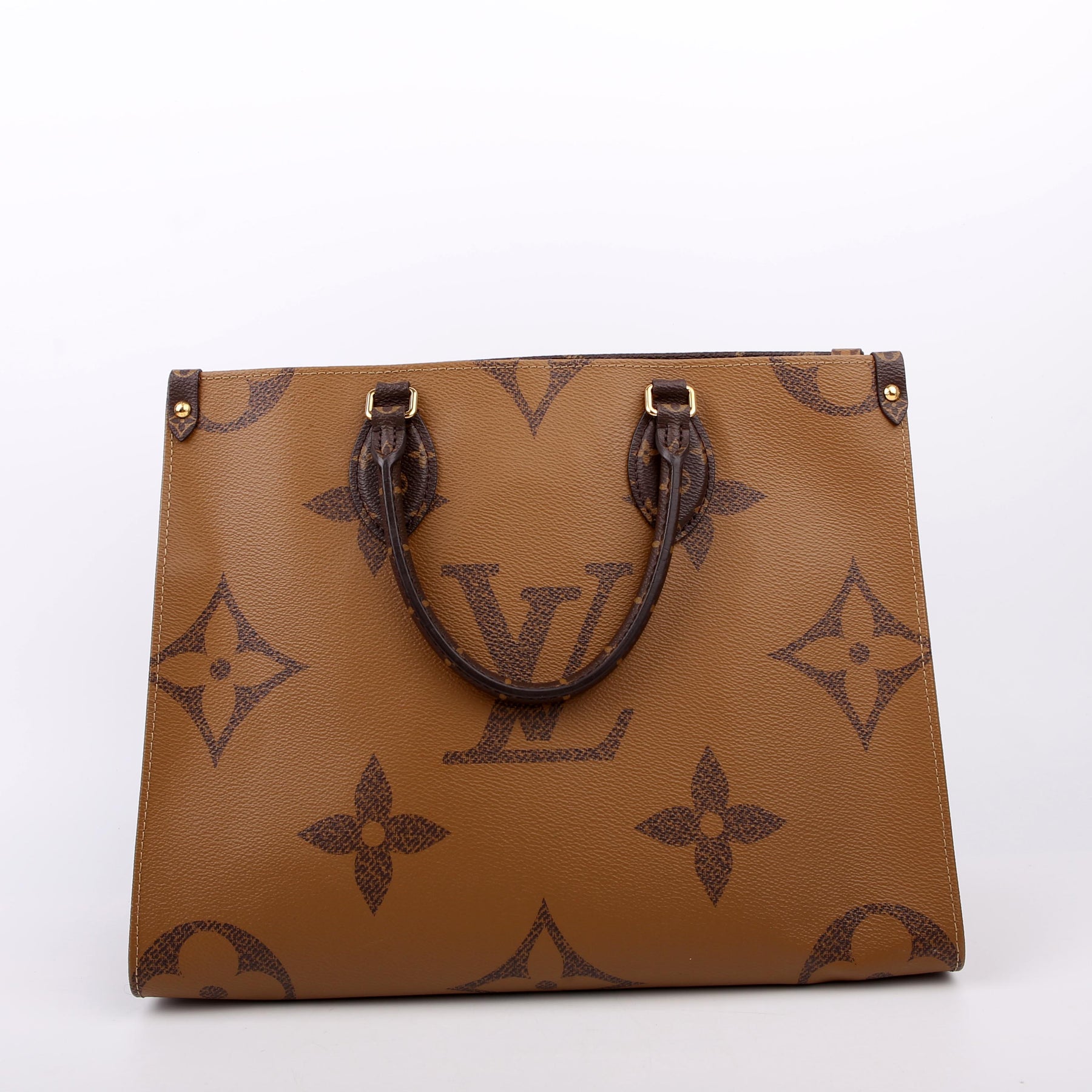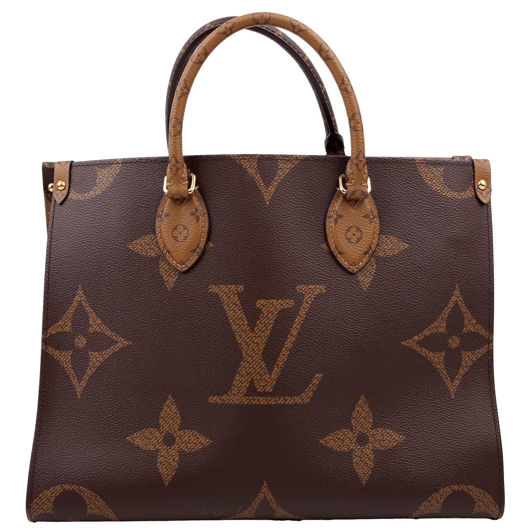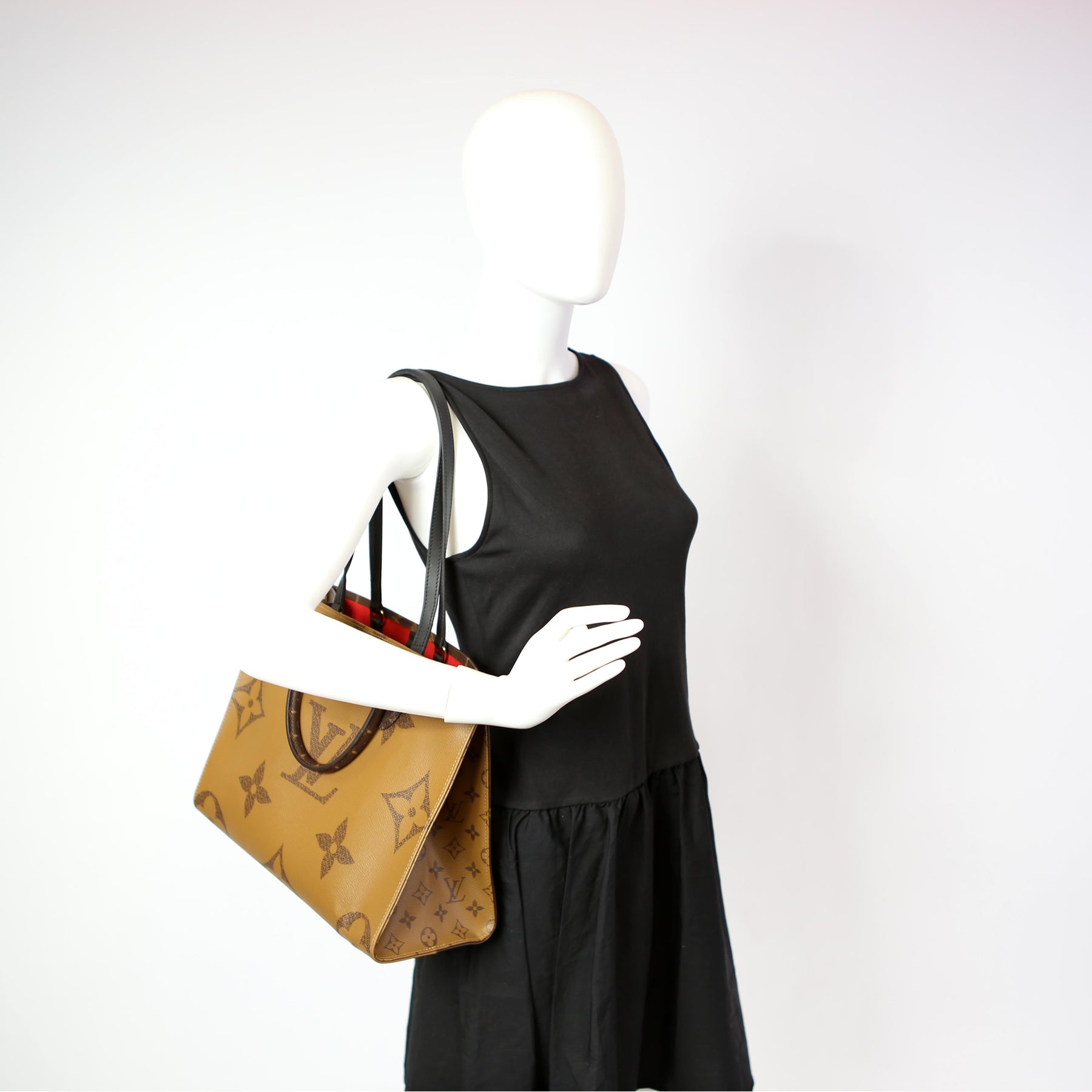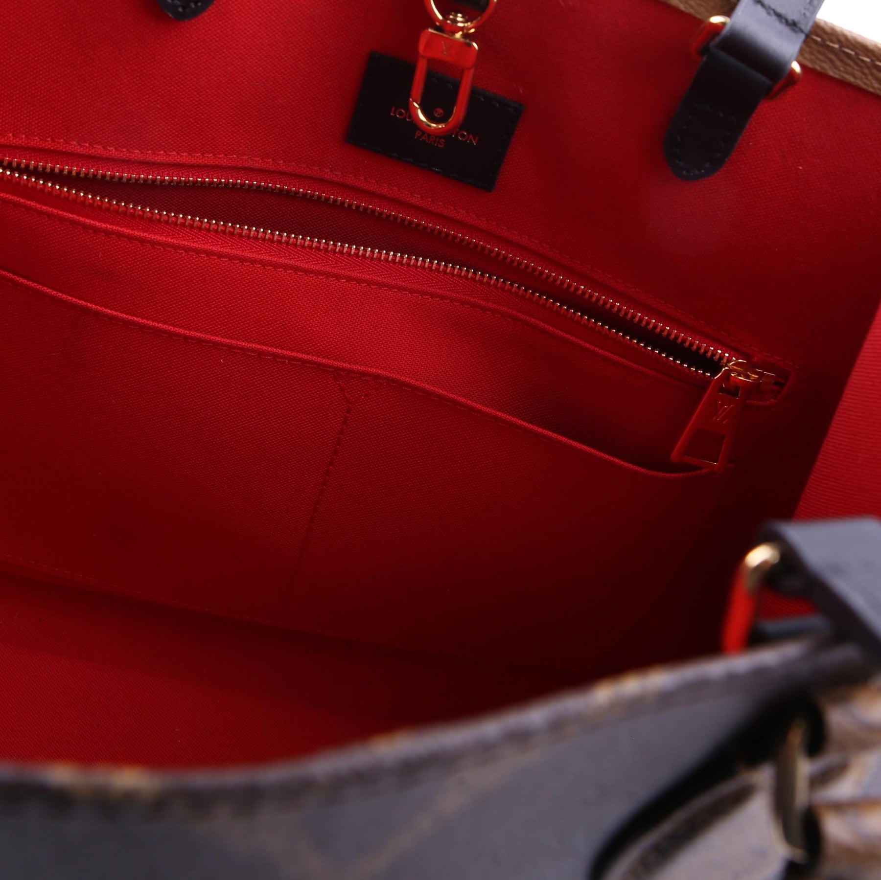 This pre-owned Louis Vuitton ONTHEGO MM is guaranteed 100% authentic. The exterior is in the classic Louis Vuitton Reverse Monogram coated canvas.
