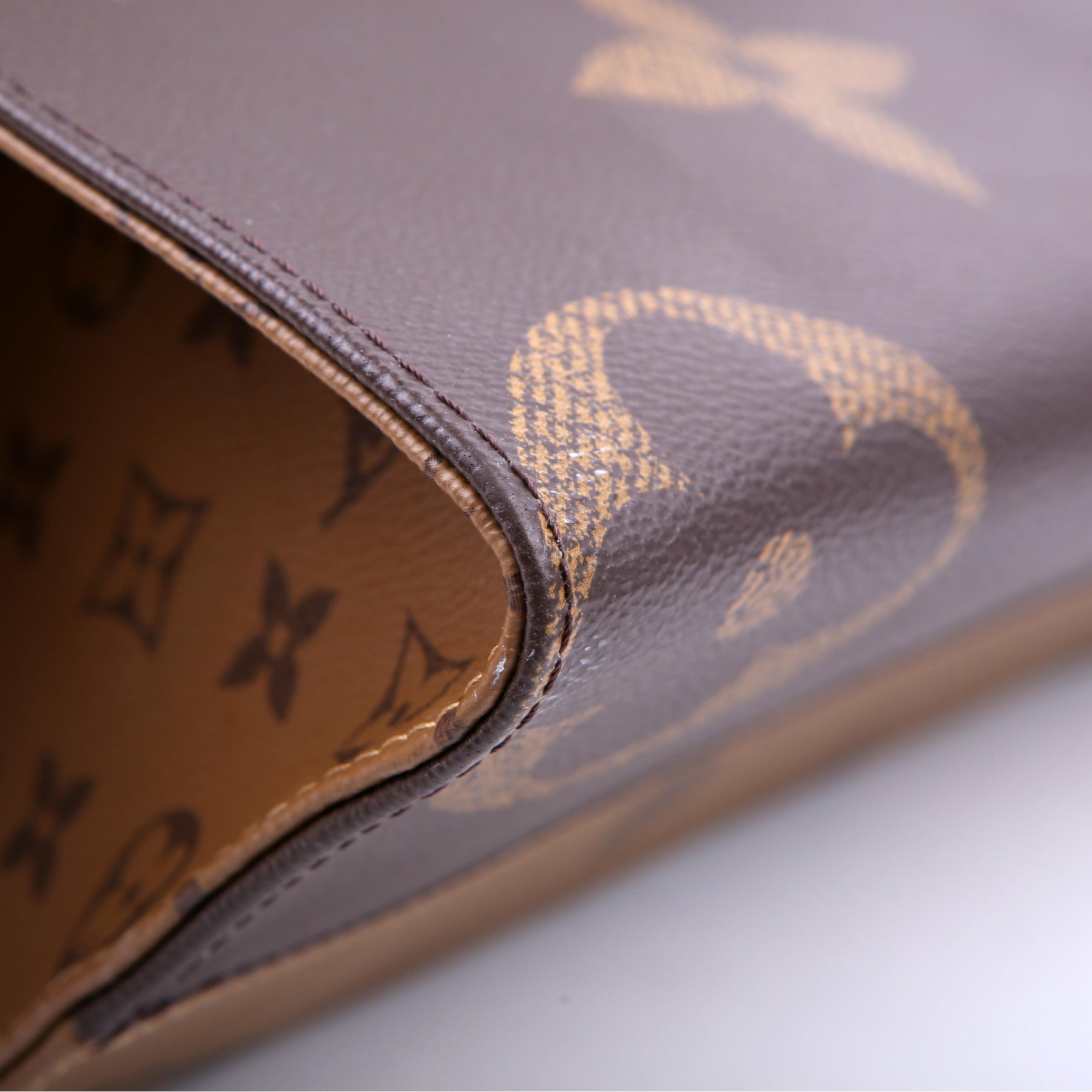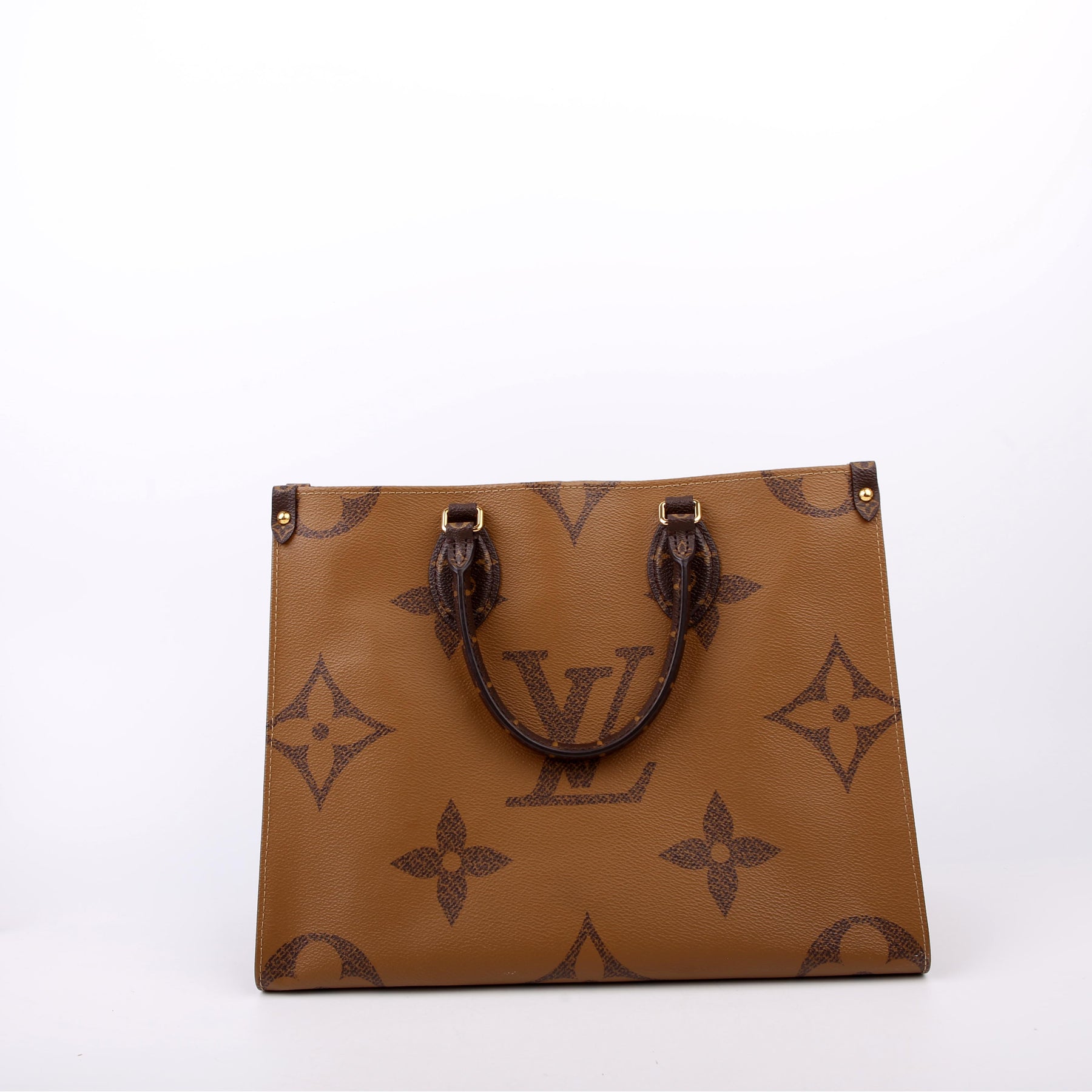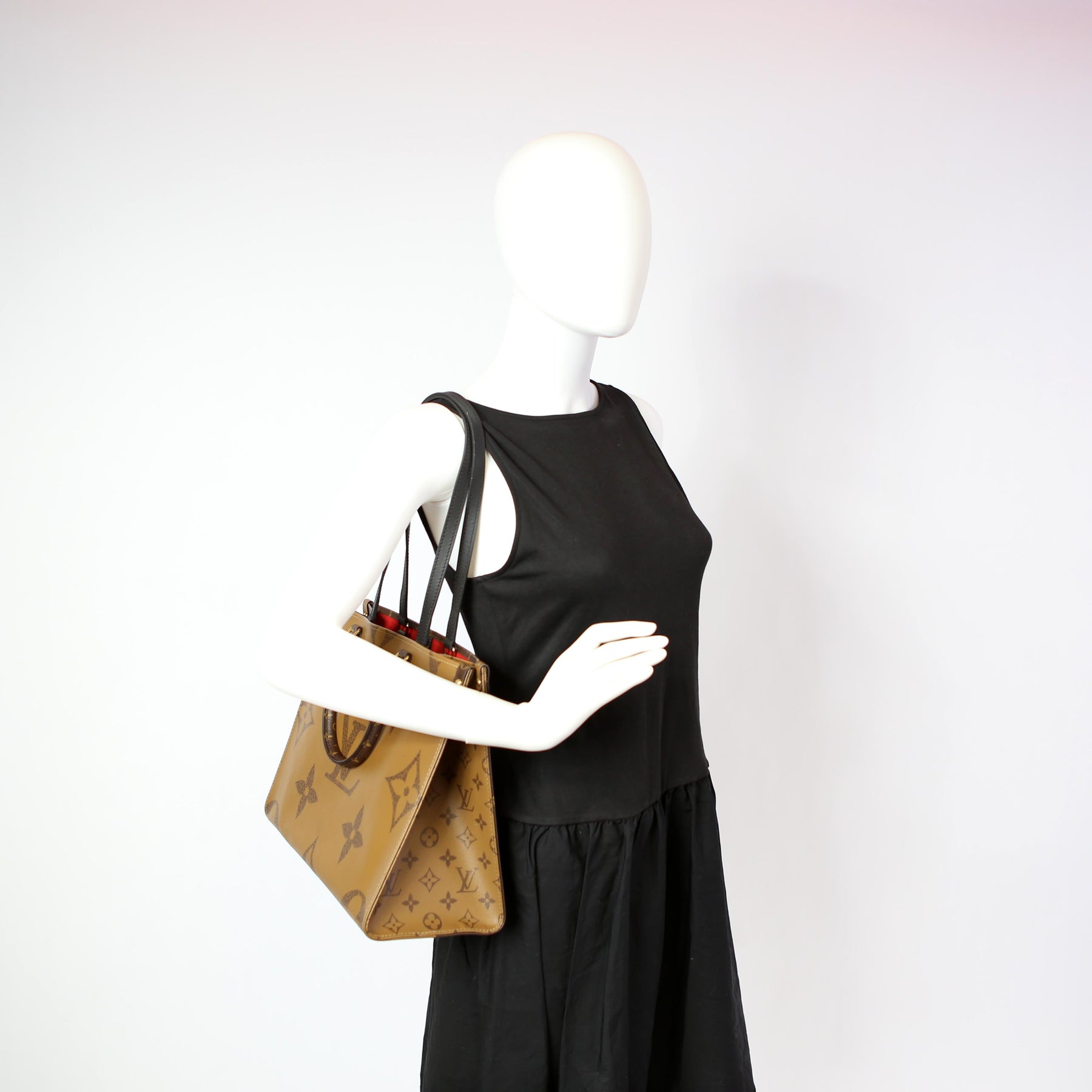 This pre-owned Louis Vuitton ONTHEGO MM is guaranteed 100% authentic. The exterior is in the classic Louis Vuitton Reverse Monogram coated canvas.