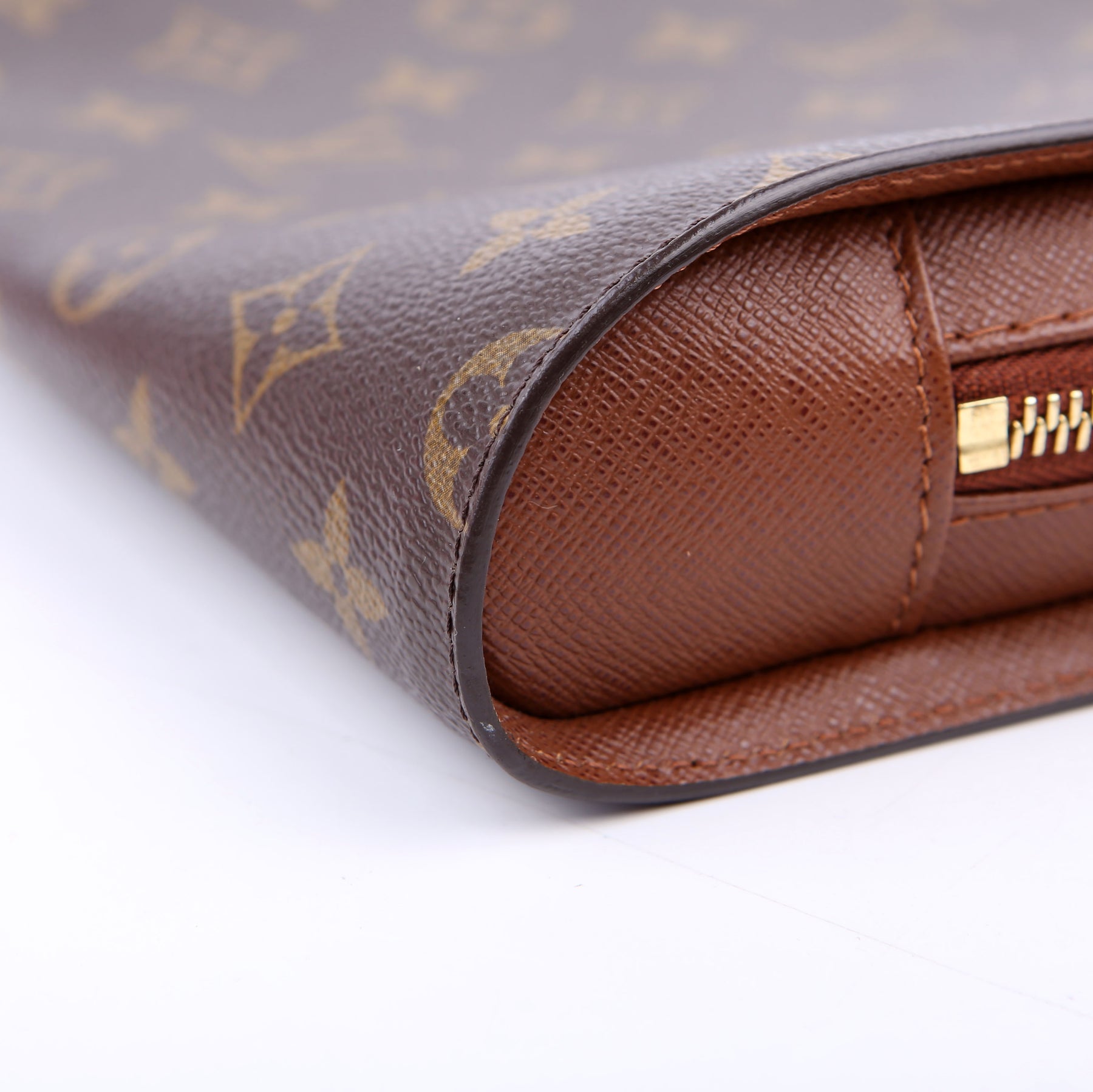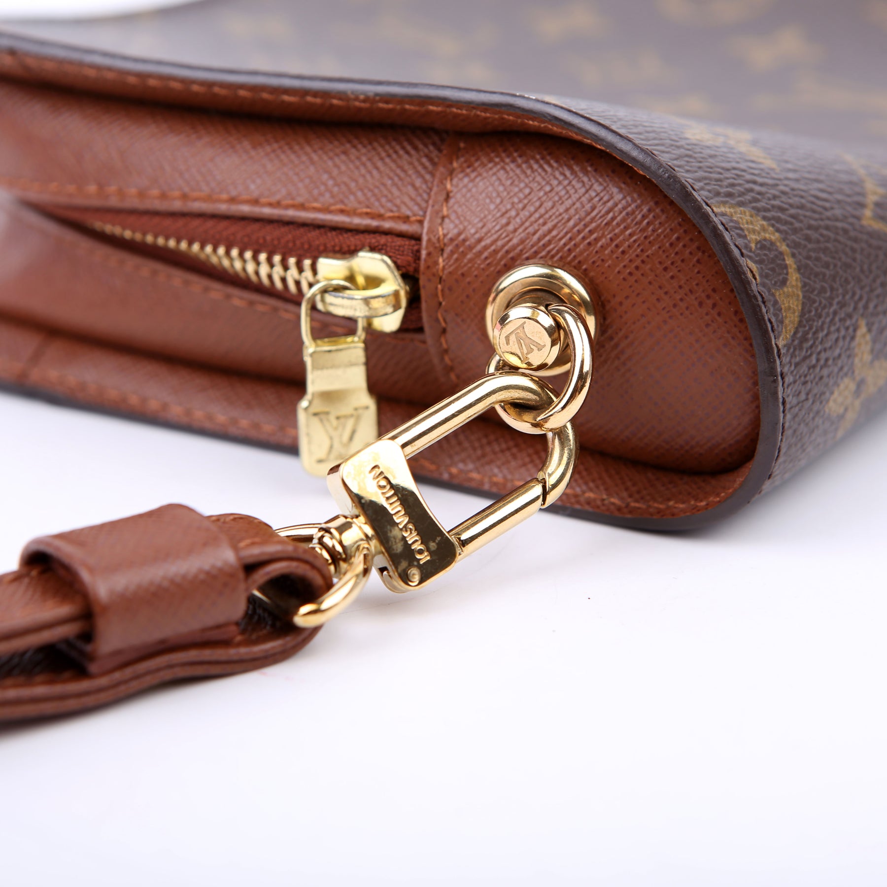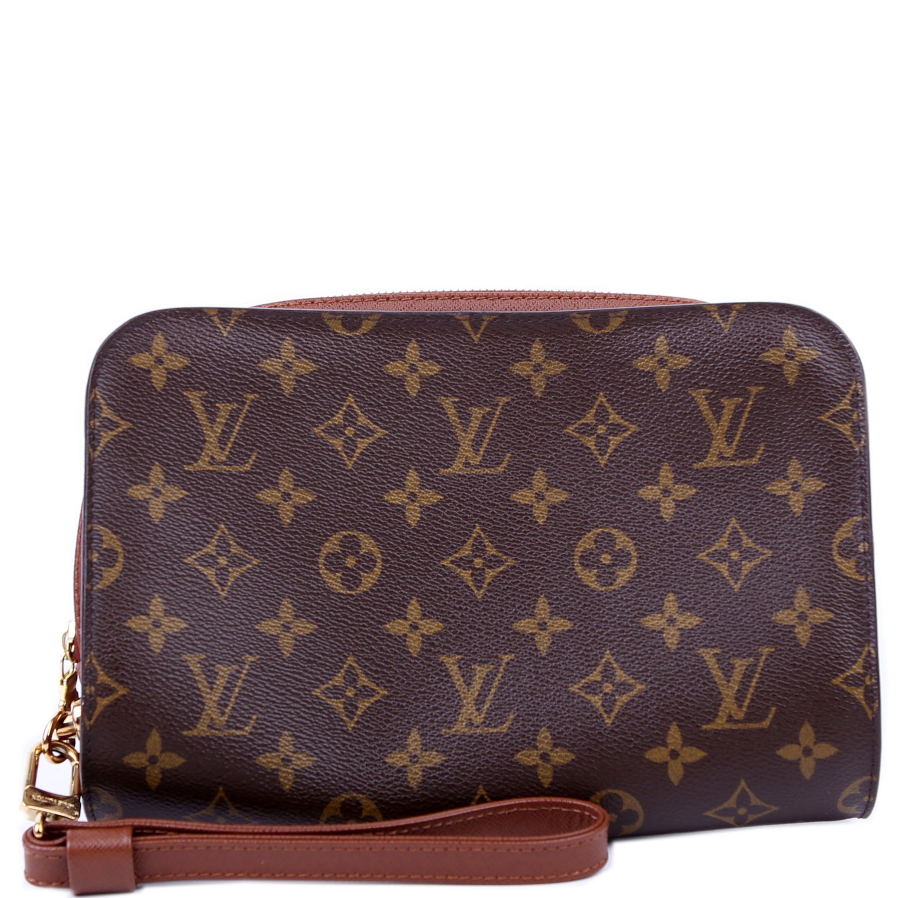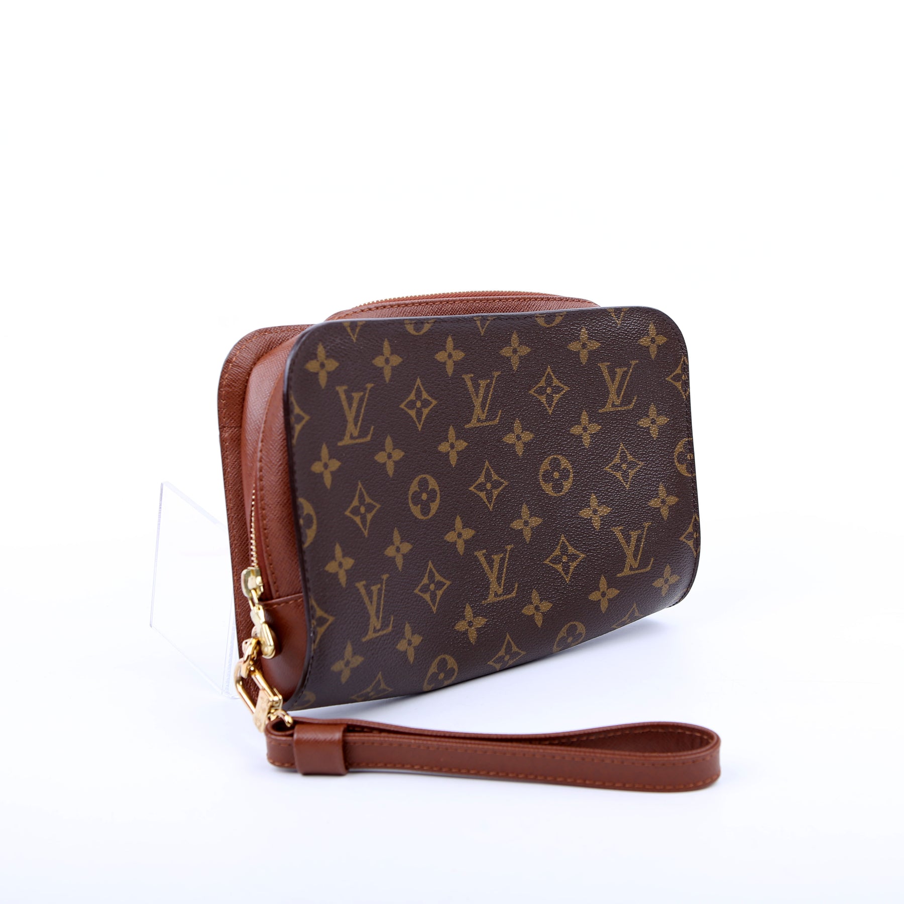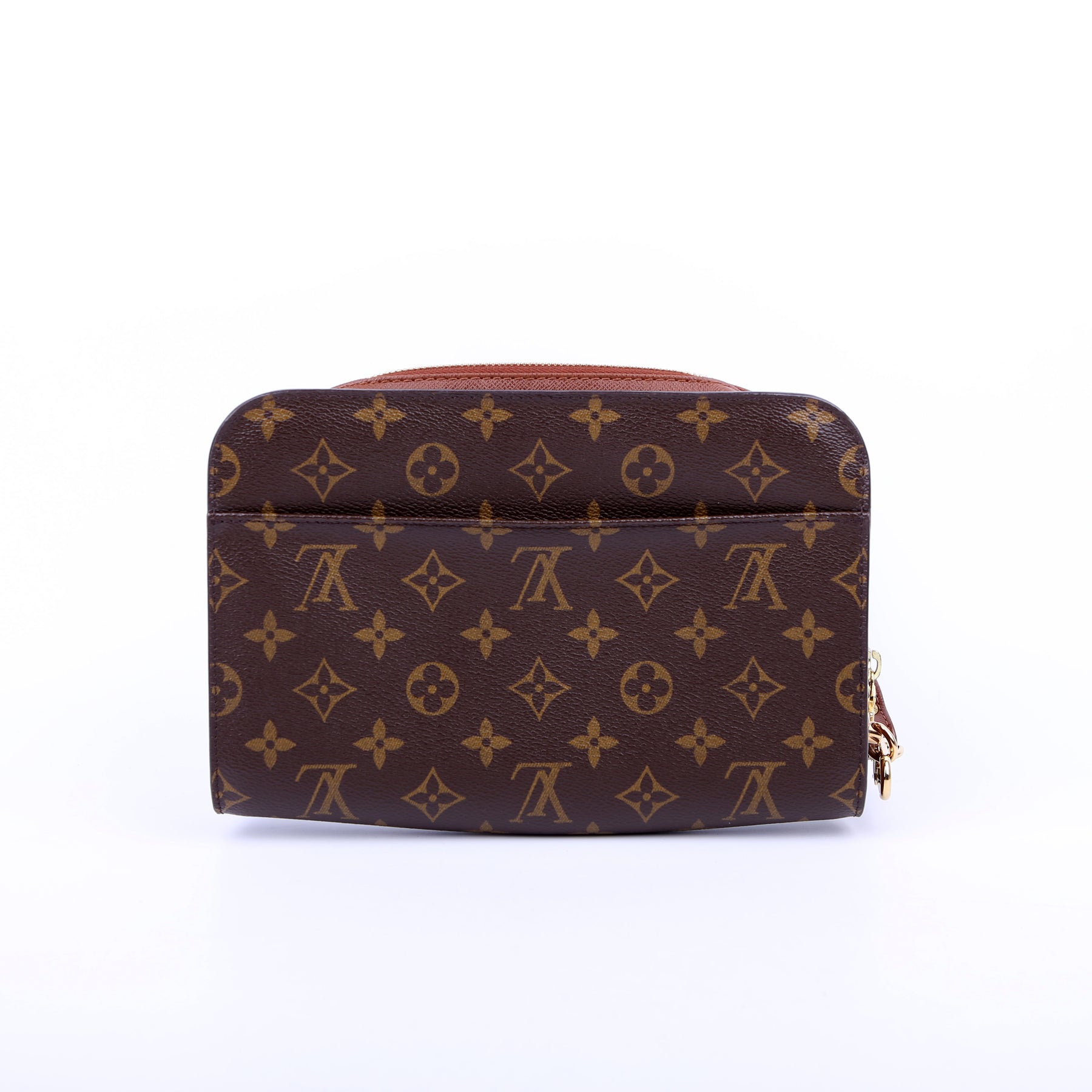 This pre-owned Louis Vuitton Orsay Clutch is guaranteed 100% authentic. The exterior is in the classic Louis Vuitton Monogram coated canvas.