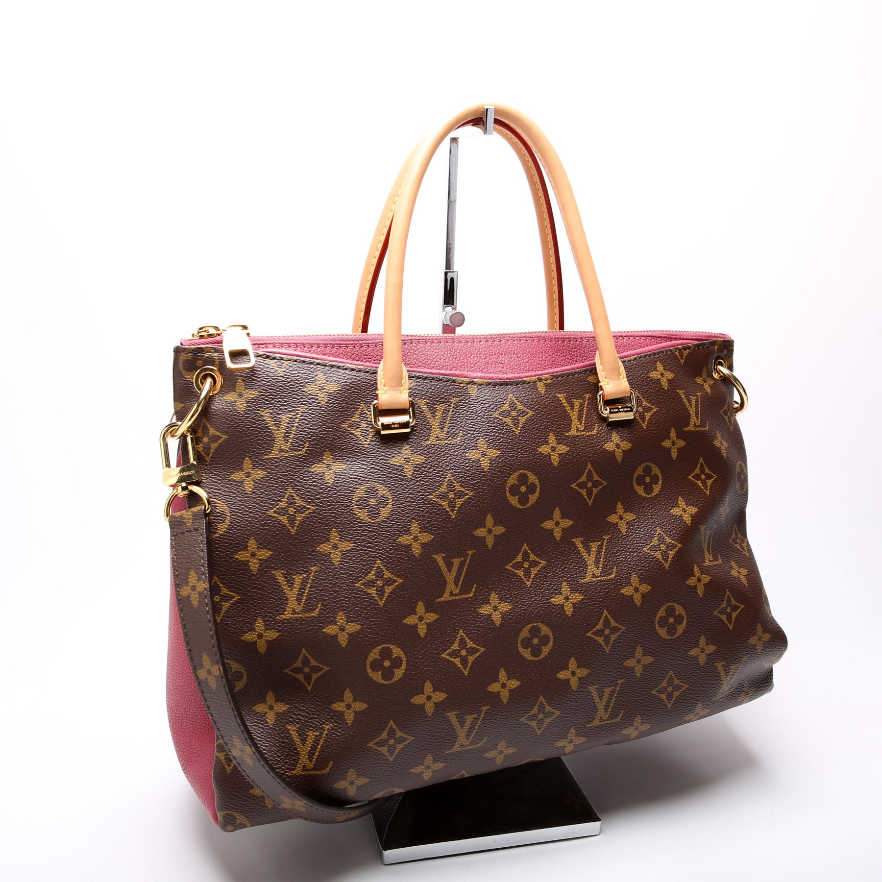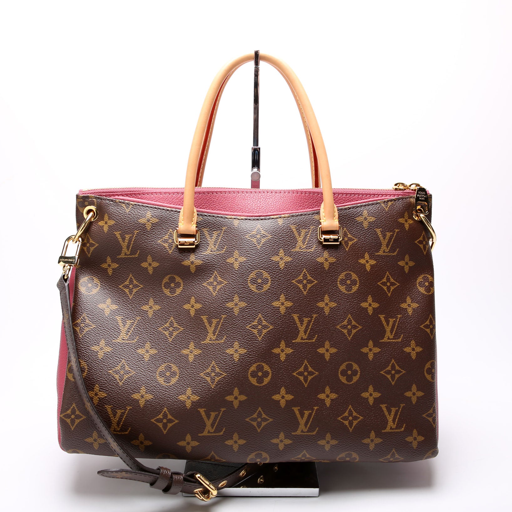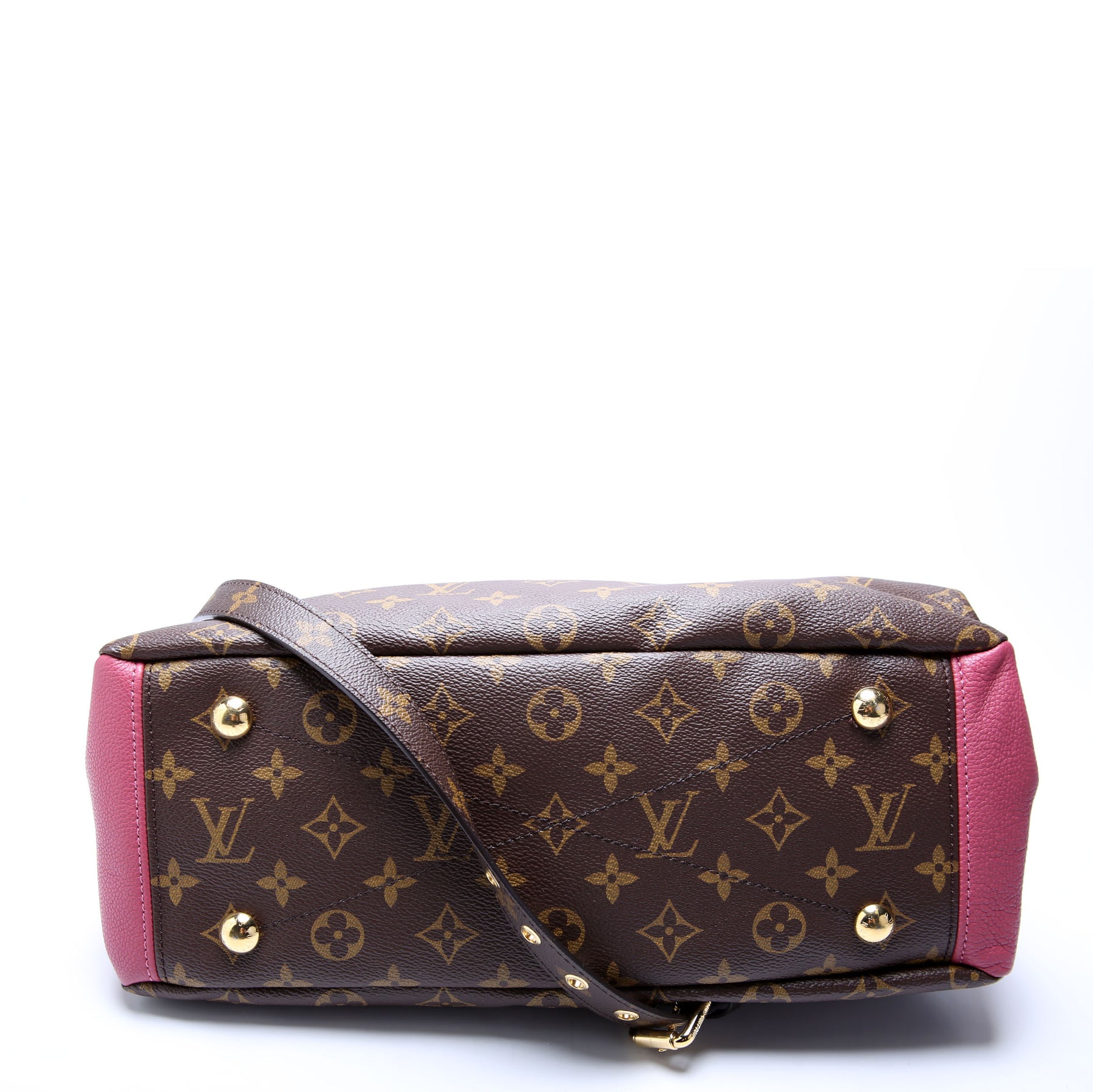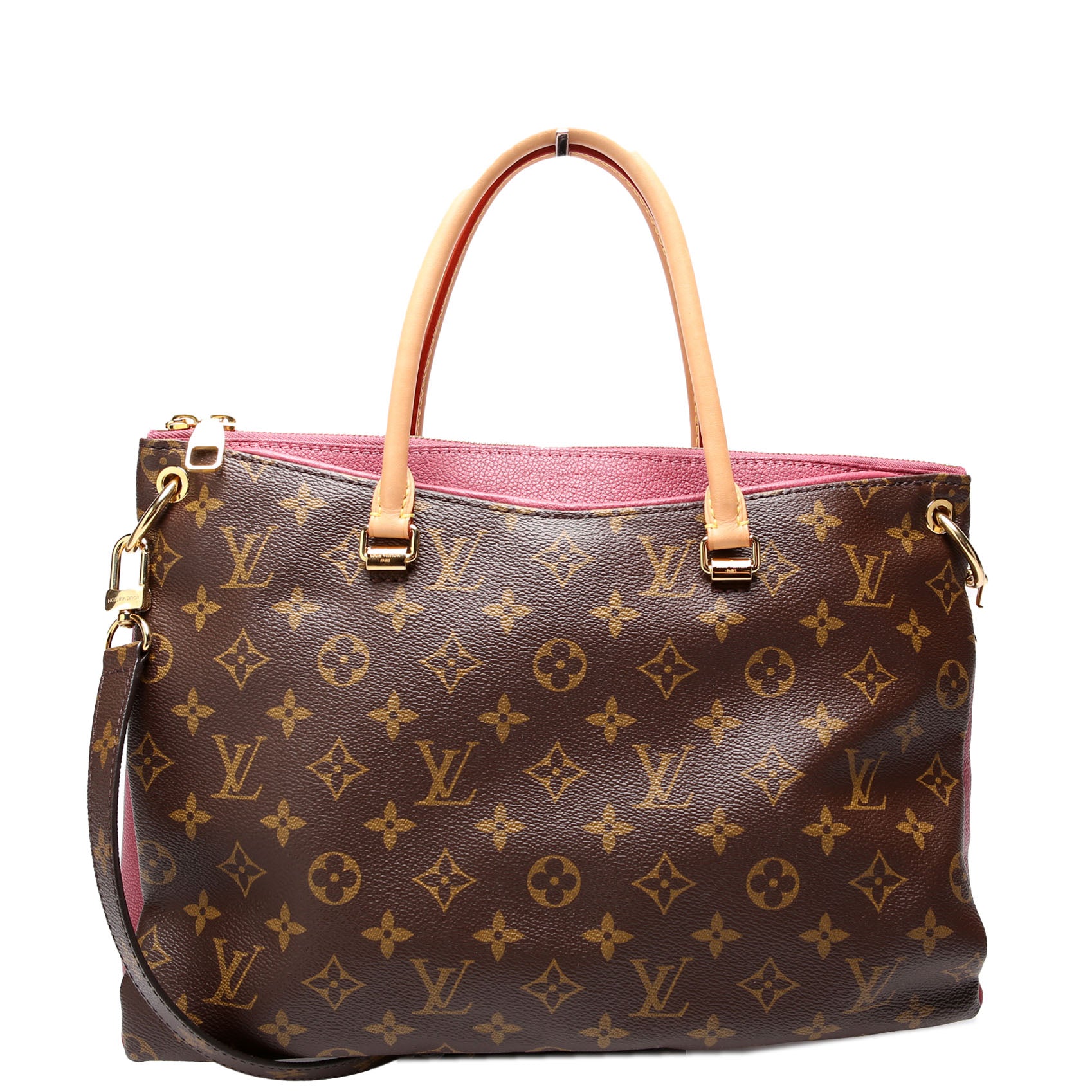 This pre-owned Louis Vuitton Pallas Tote Leather Side is guaranteed 100% authentic. The exterior is in the classic Louis Vuitton Monogram coated canvas.