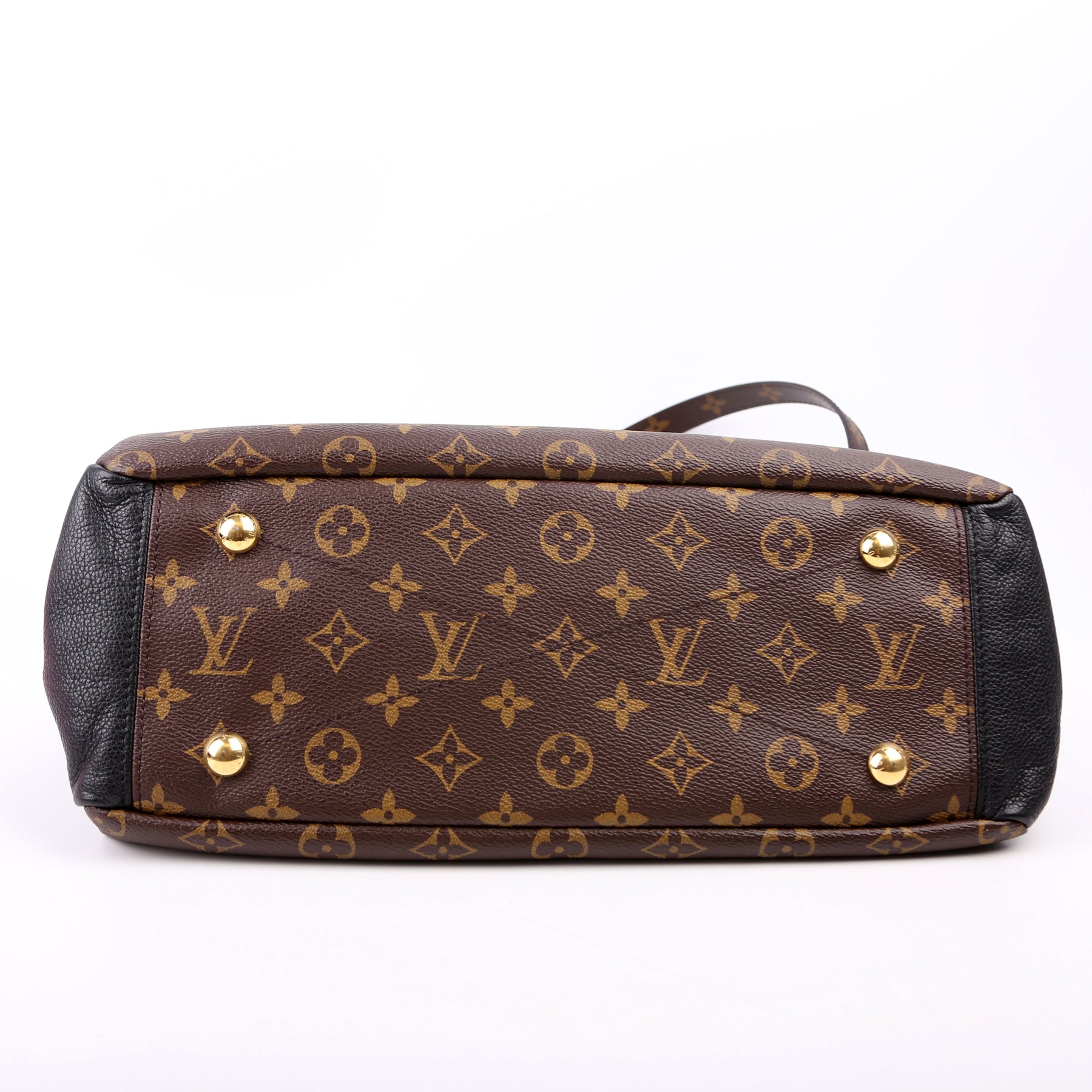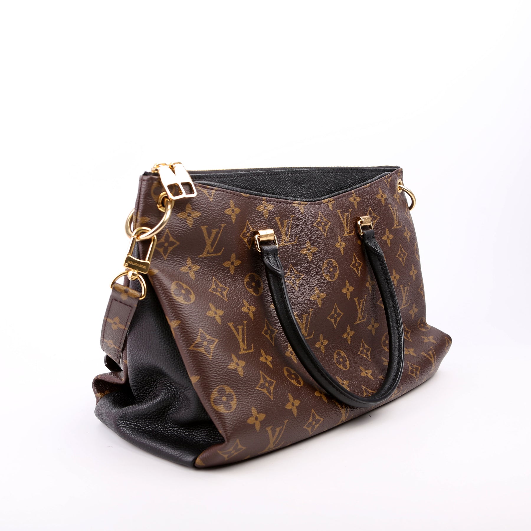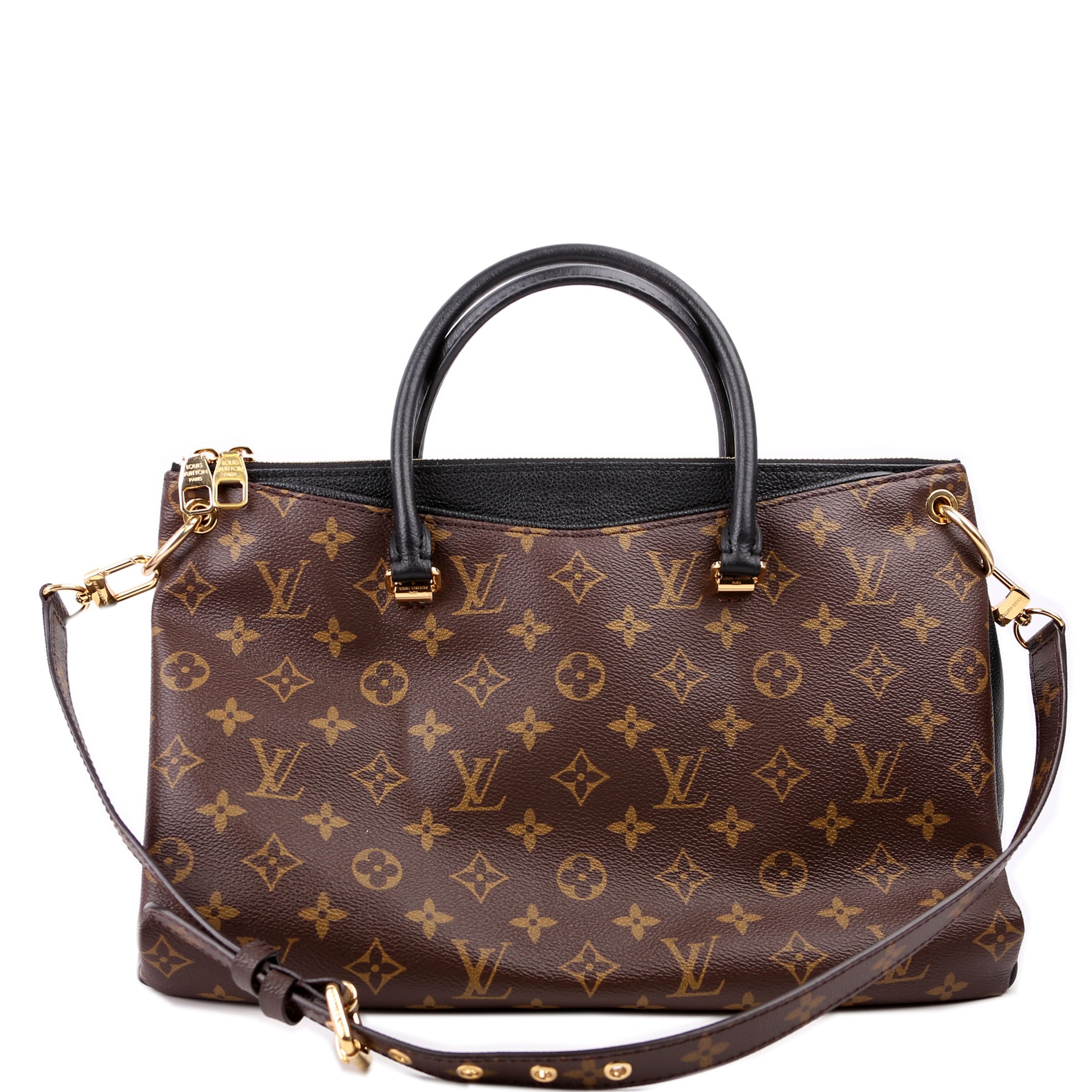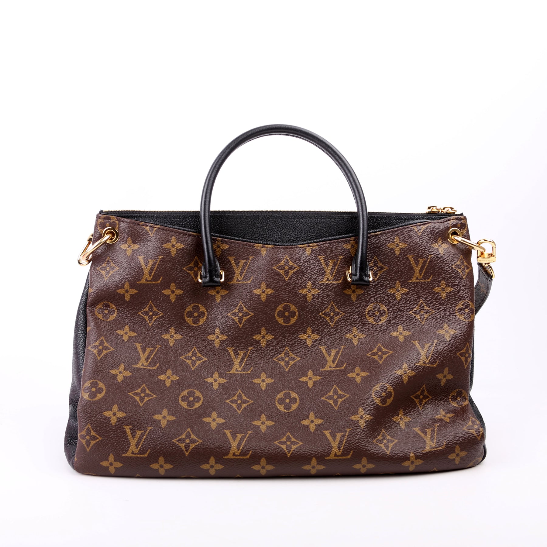 This pre-owned Louis Vuitton Pallas Tote Leather Side is guaranteed 100% authentic. The exterior is in the classic Louis Vuitton Monogram coated canvas..