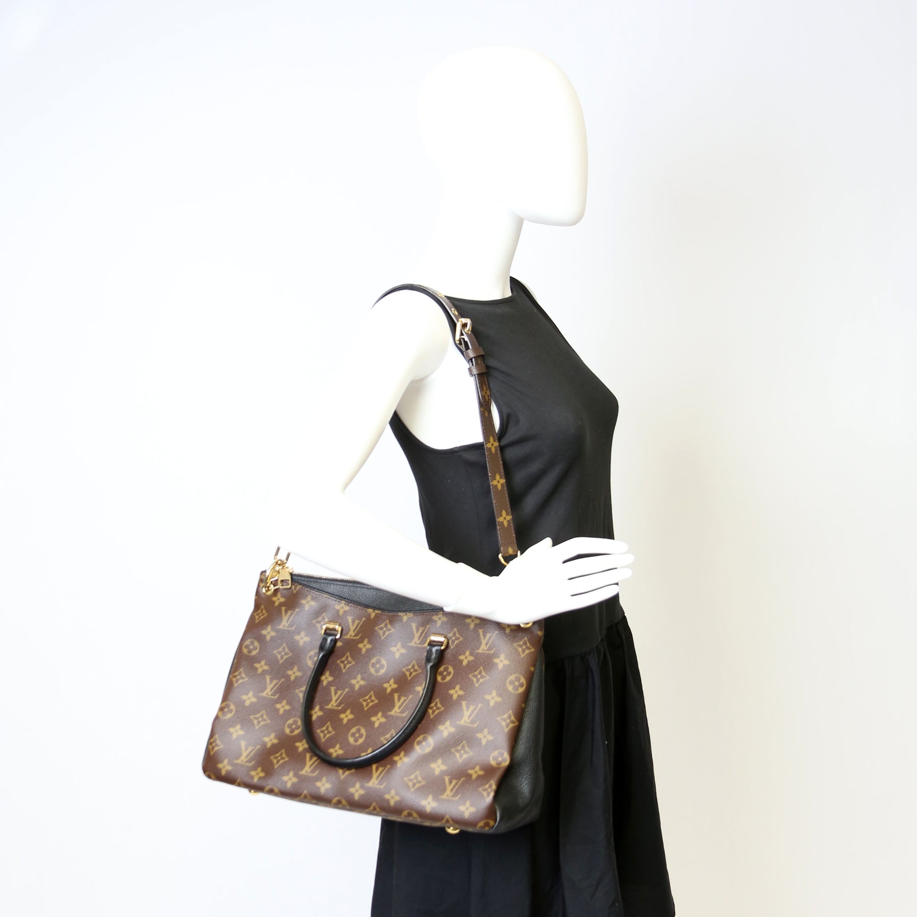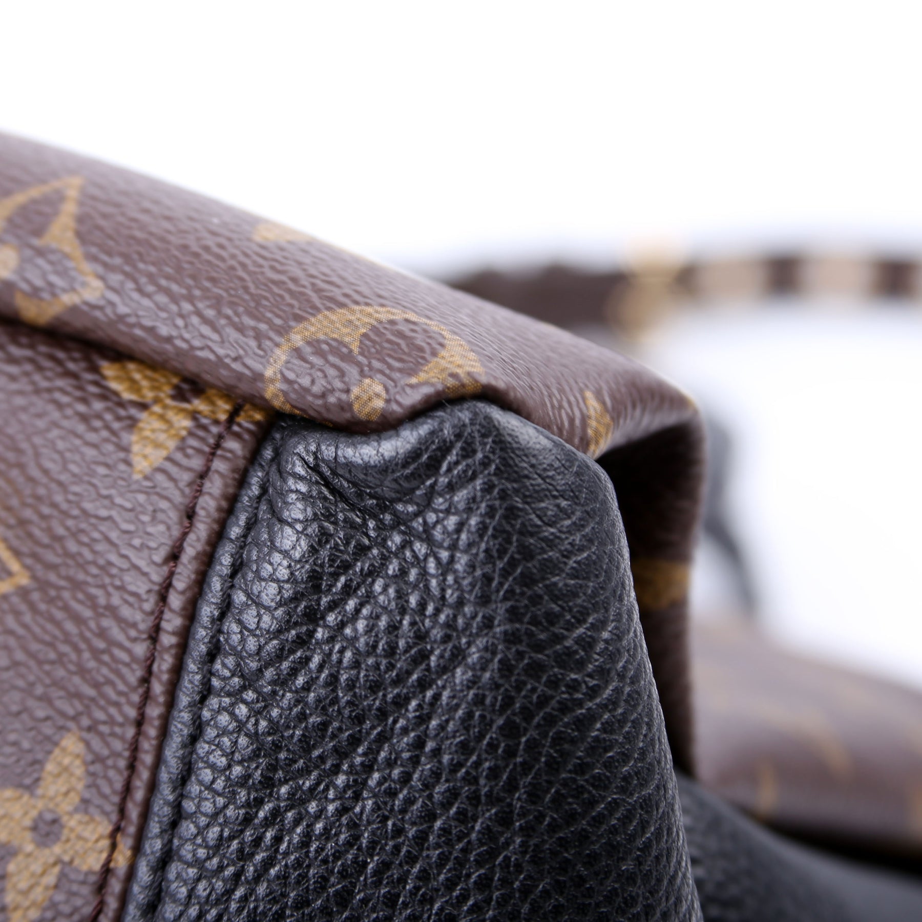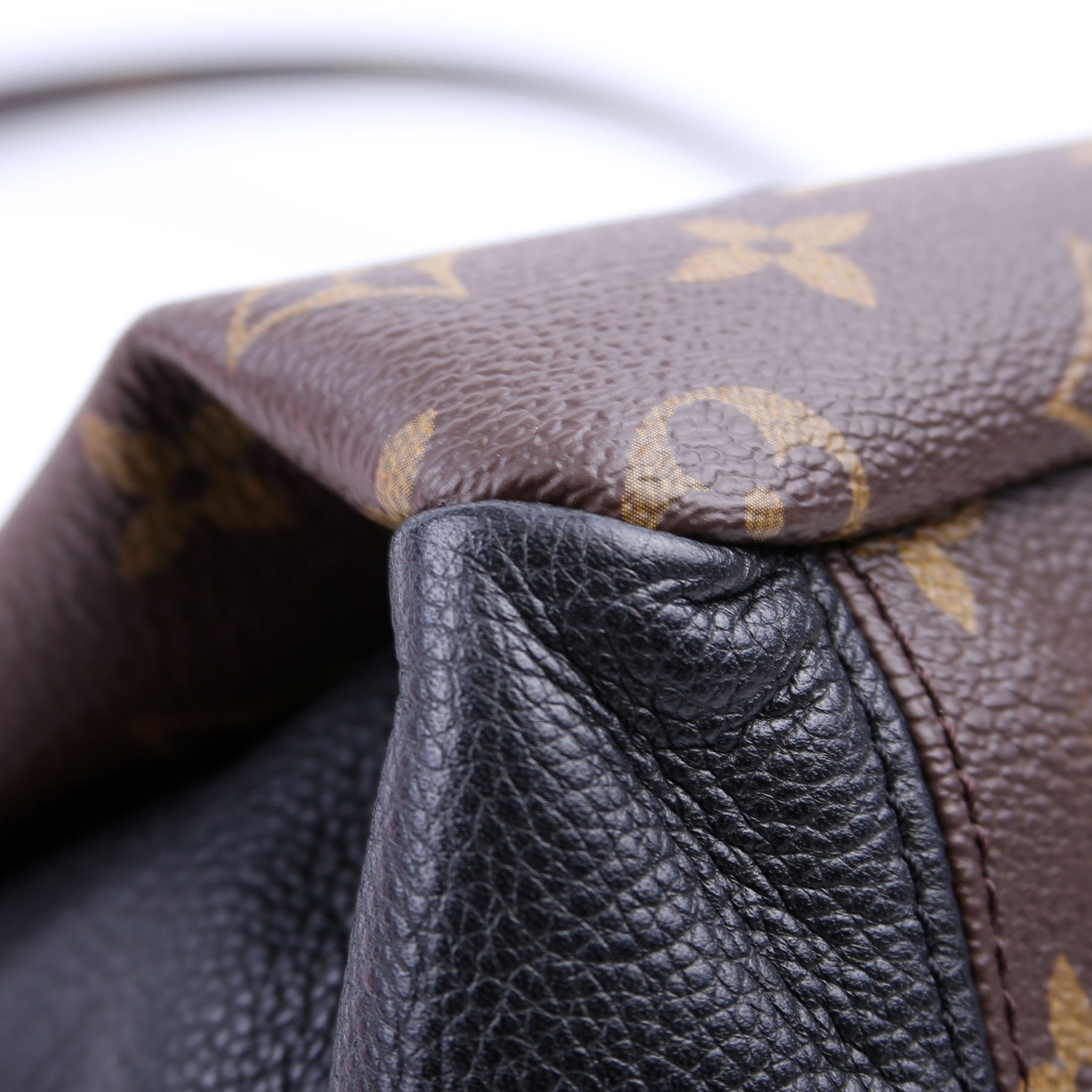 This pre-owned Louis Vuitton Pallas Tote Leather Side is guaranteed 100% authentic. The exterior is in the classic Louis Vuitton Monogram coated canvas..