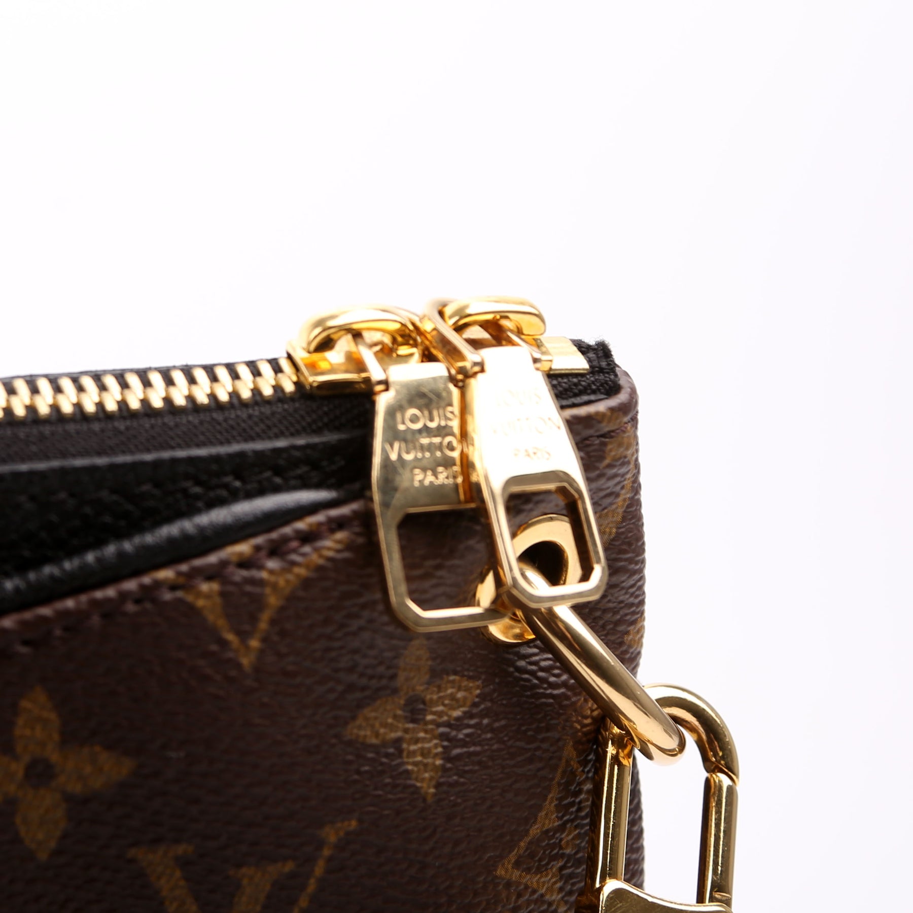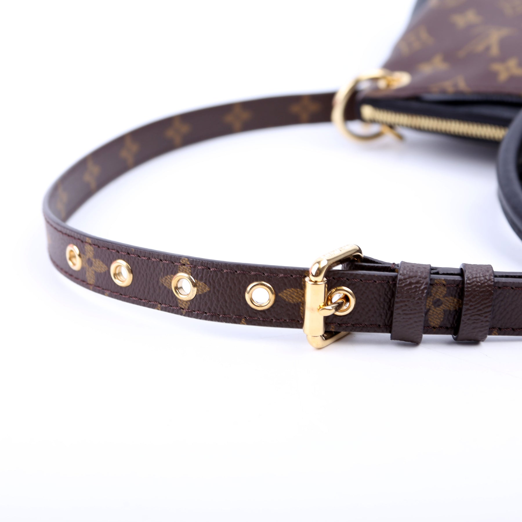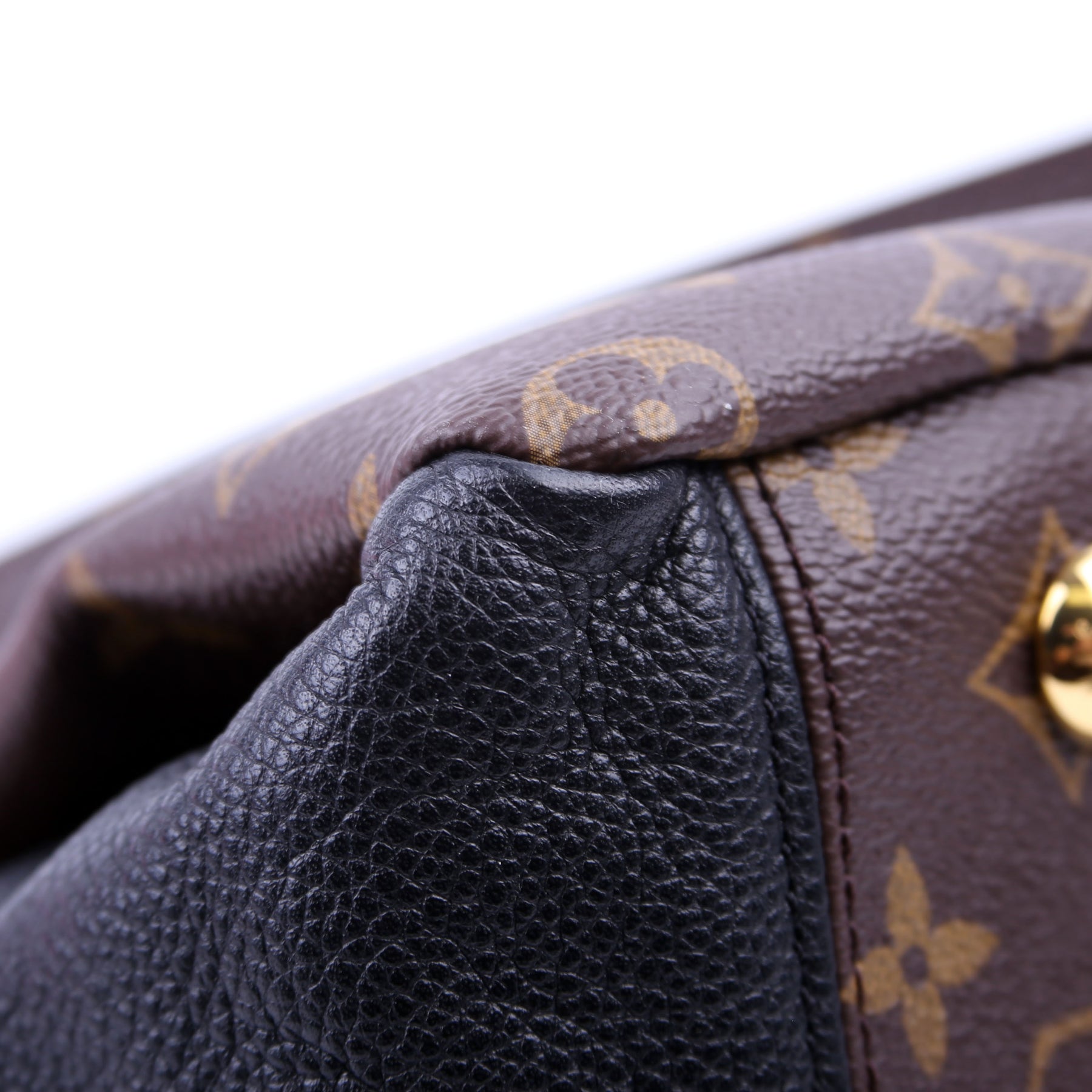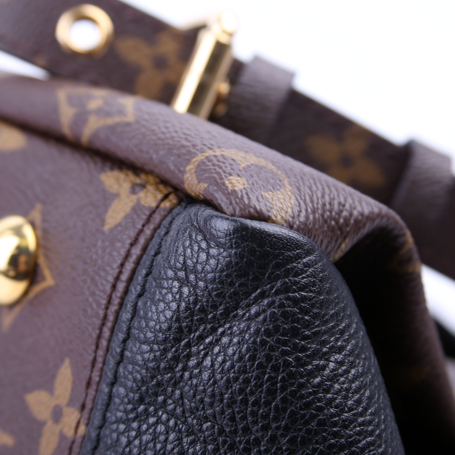 This pre-owned Louis Vuitton Pallas Tote Leather Side is guaranteed 100% authentic. The exterior is in the classic Louis Vuitton Monogram coated canvas..