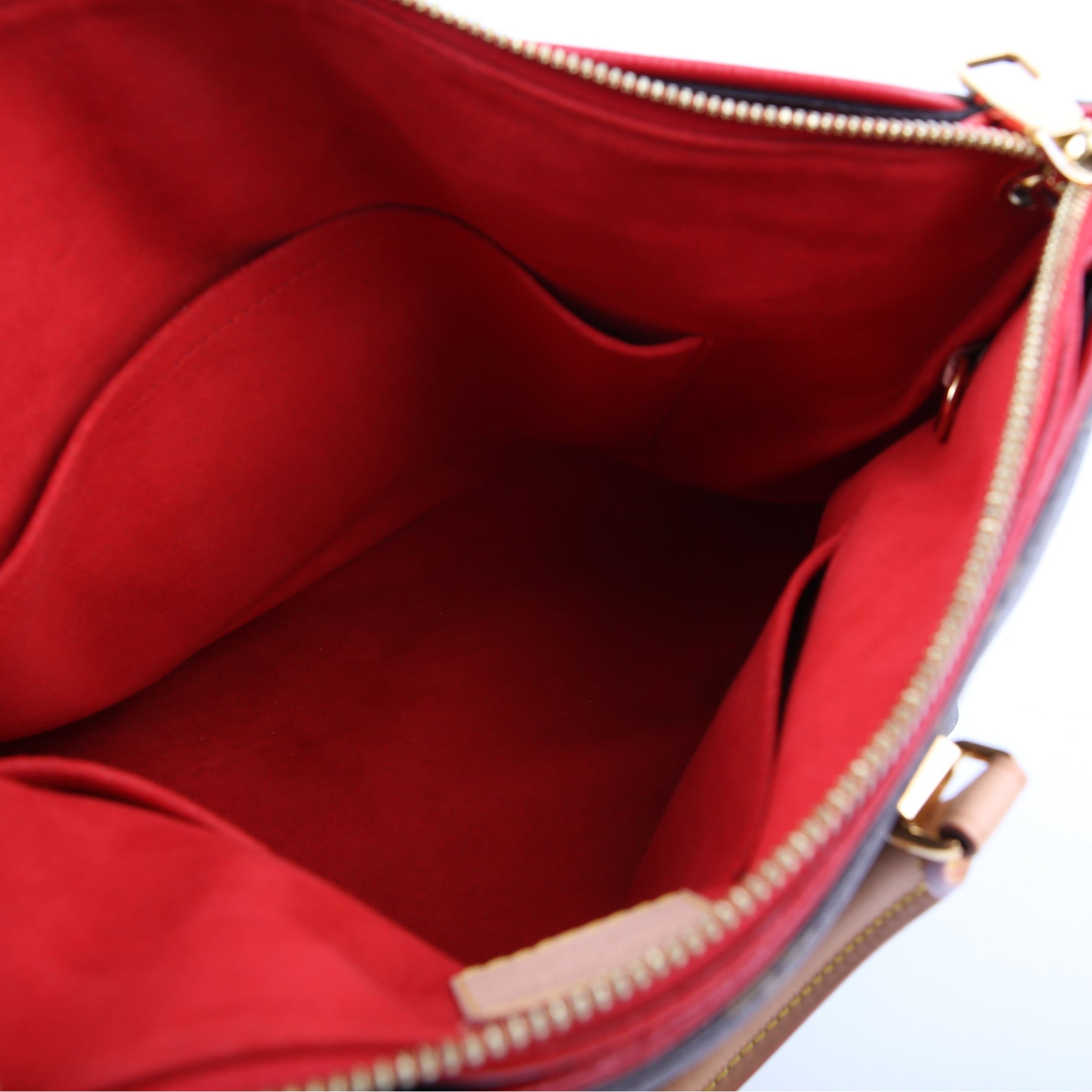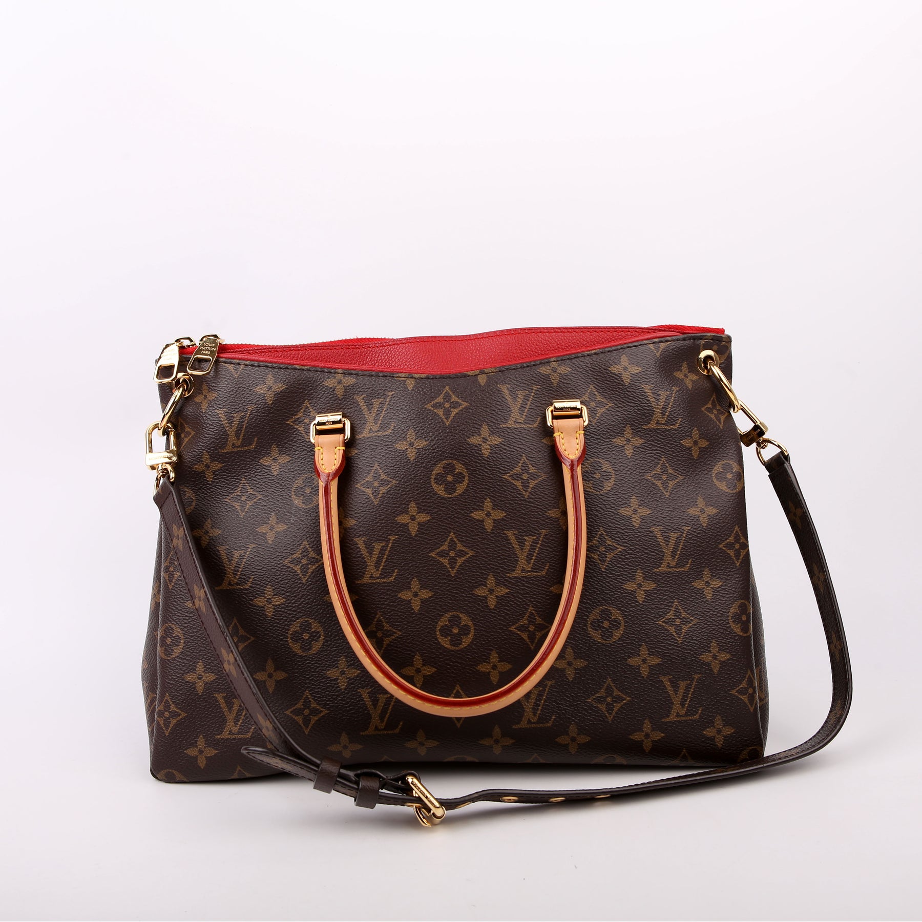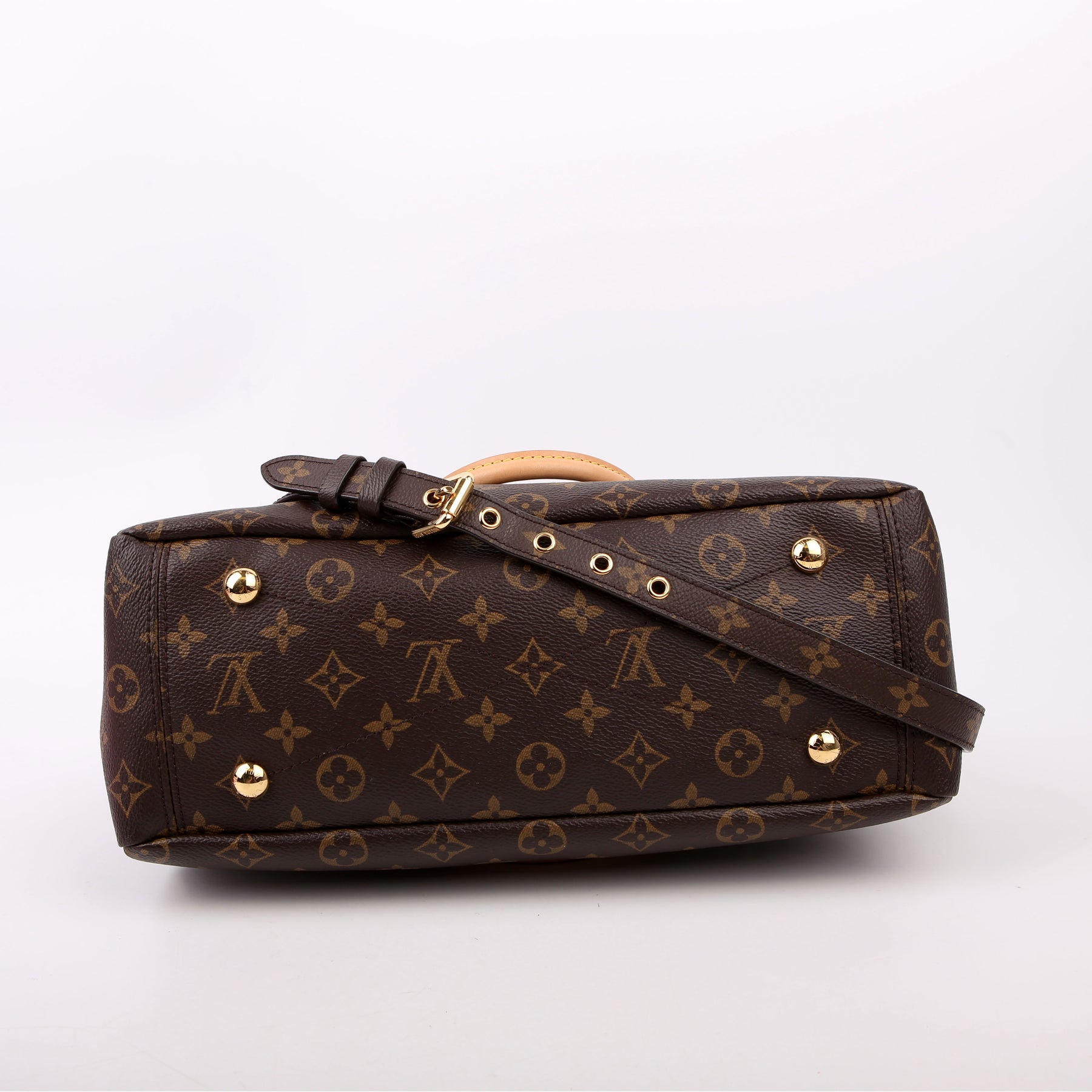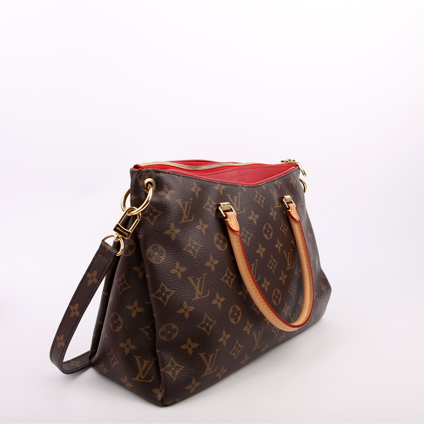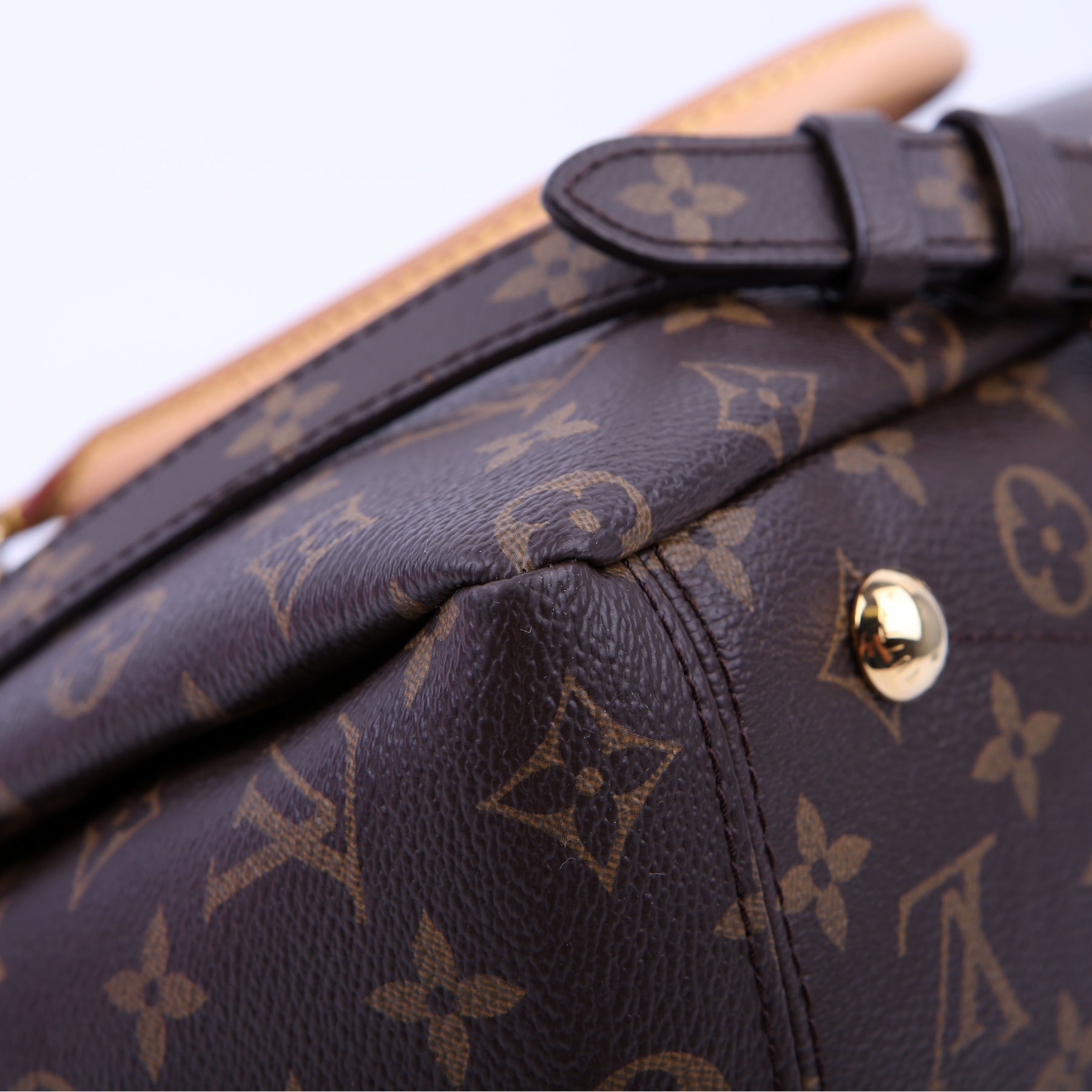 This pre-owned Louis Vuitton Pallas Tote Leather Side is guaranteed 100% authentic. The exterior is in the classic Louis Vuitton Monogram coated canvas.