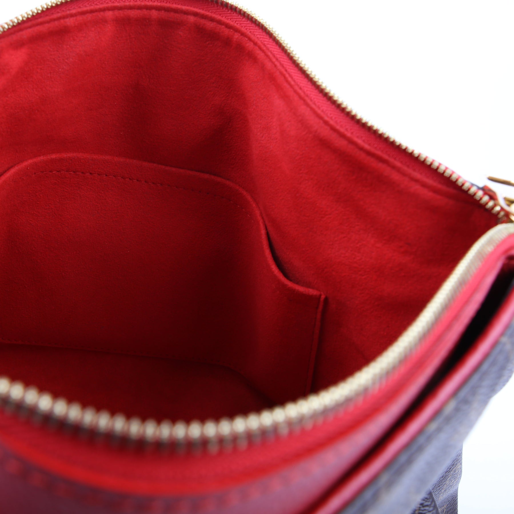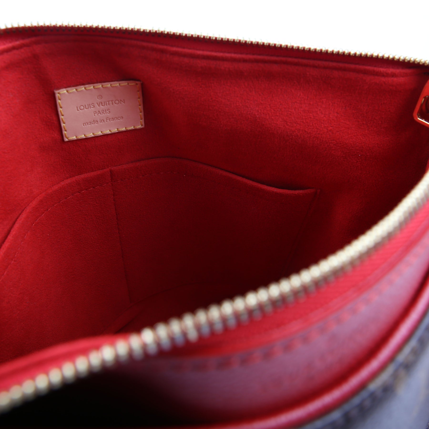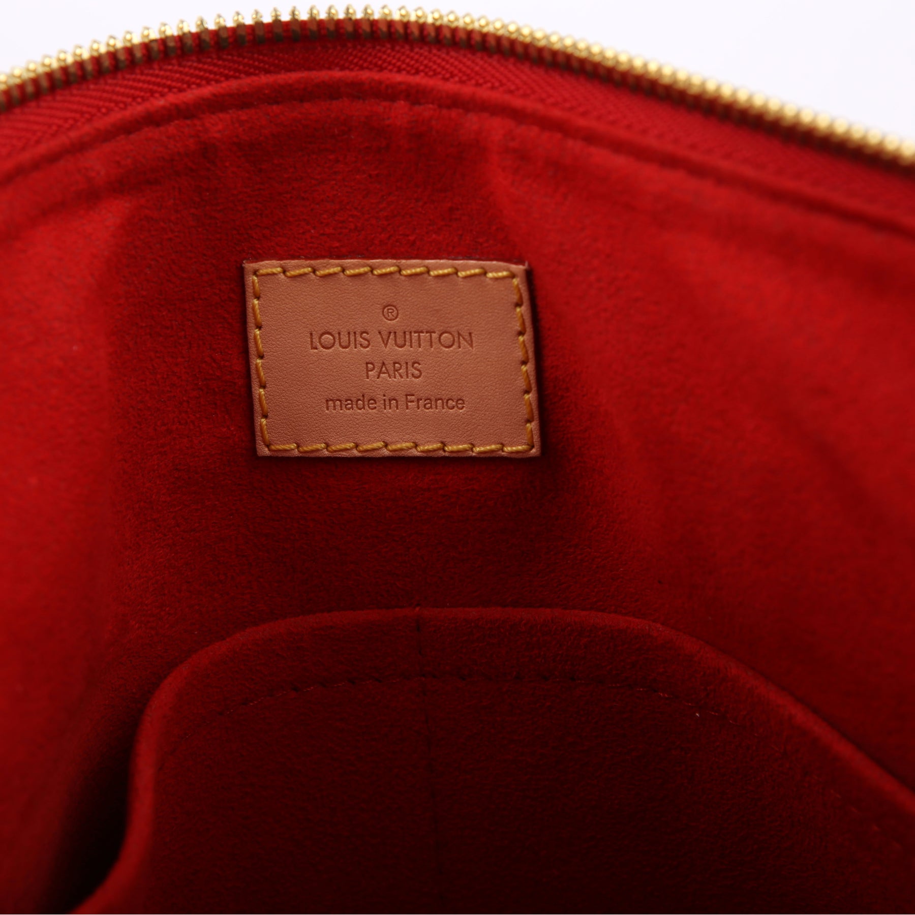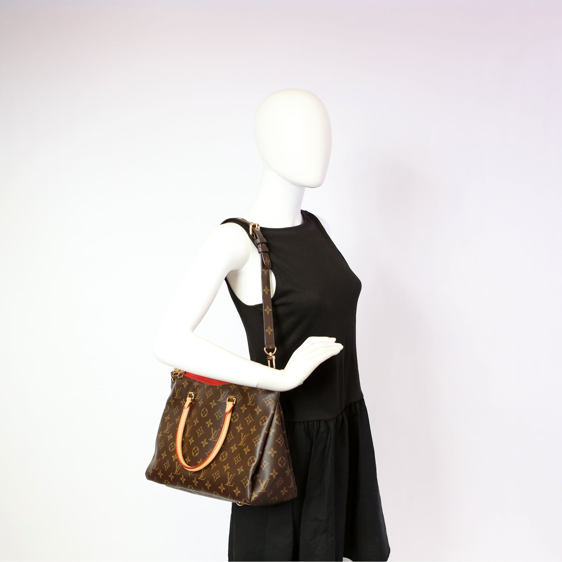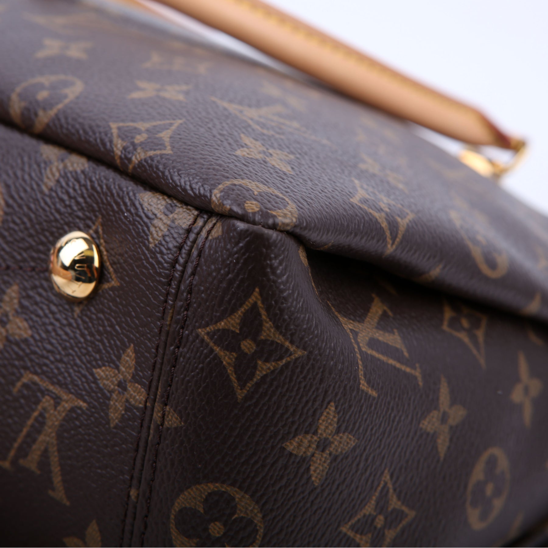 This pre-owned Louis Vuitton Pallas Tote Leather Side is guaranteed 100% authentic. The exterior is in the classic Louis Vuitton Monogram coated canvas.