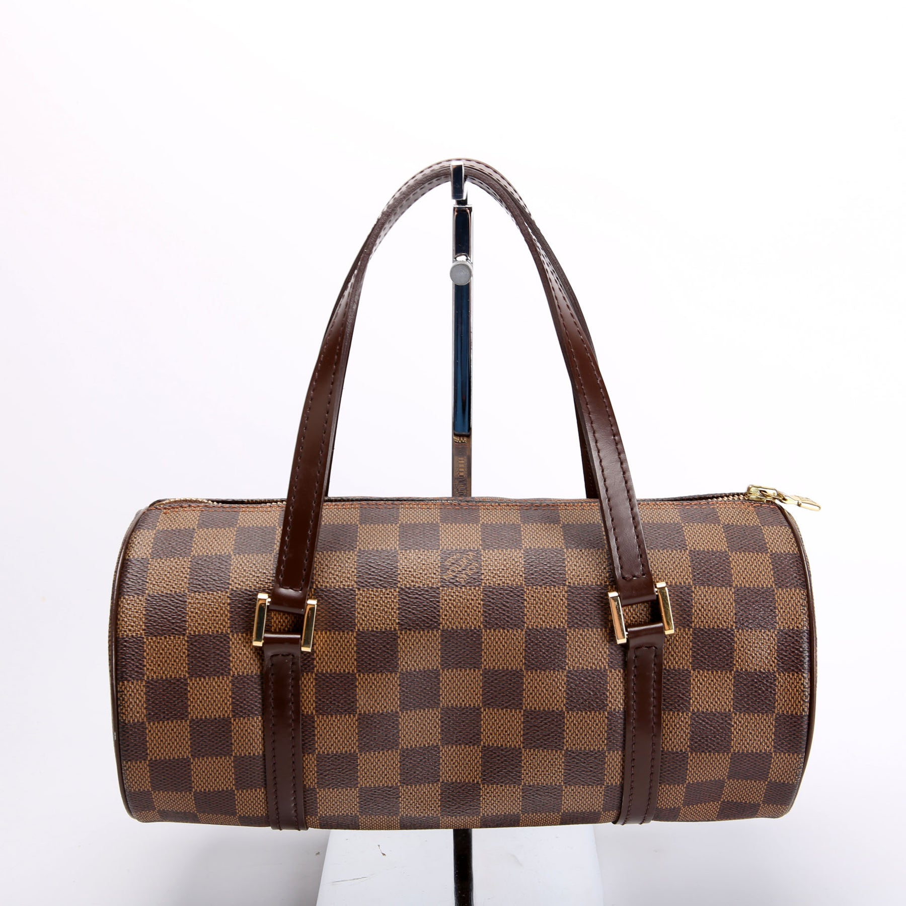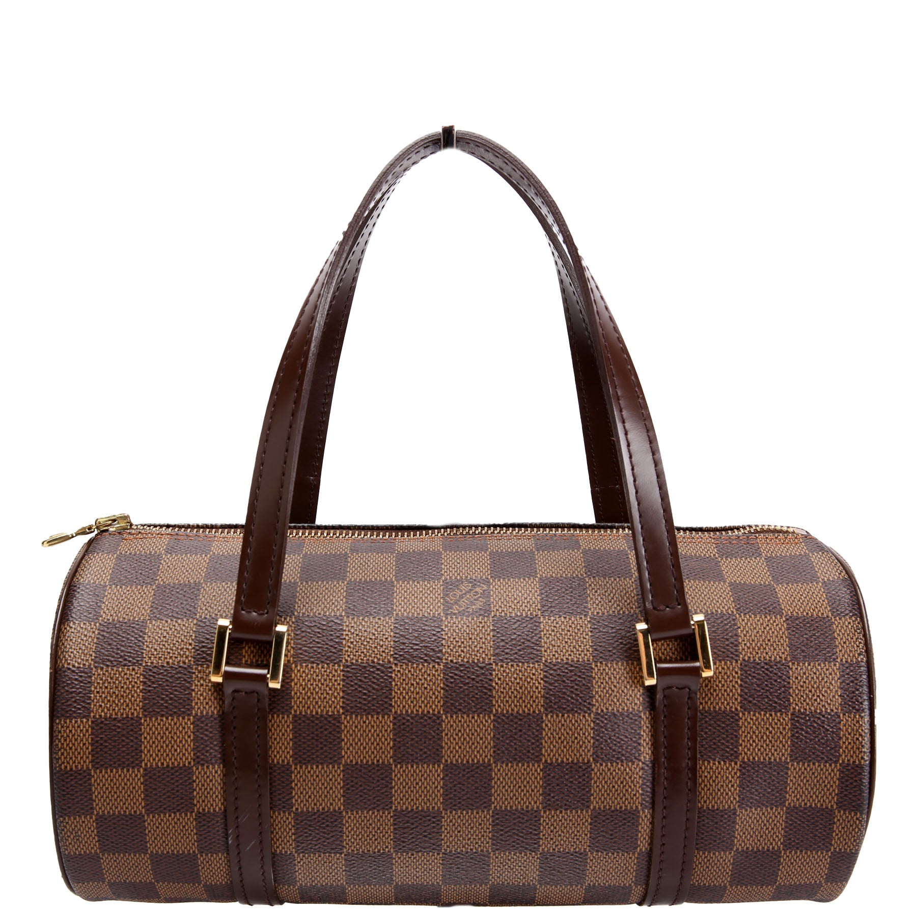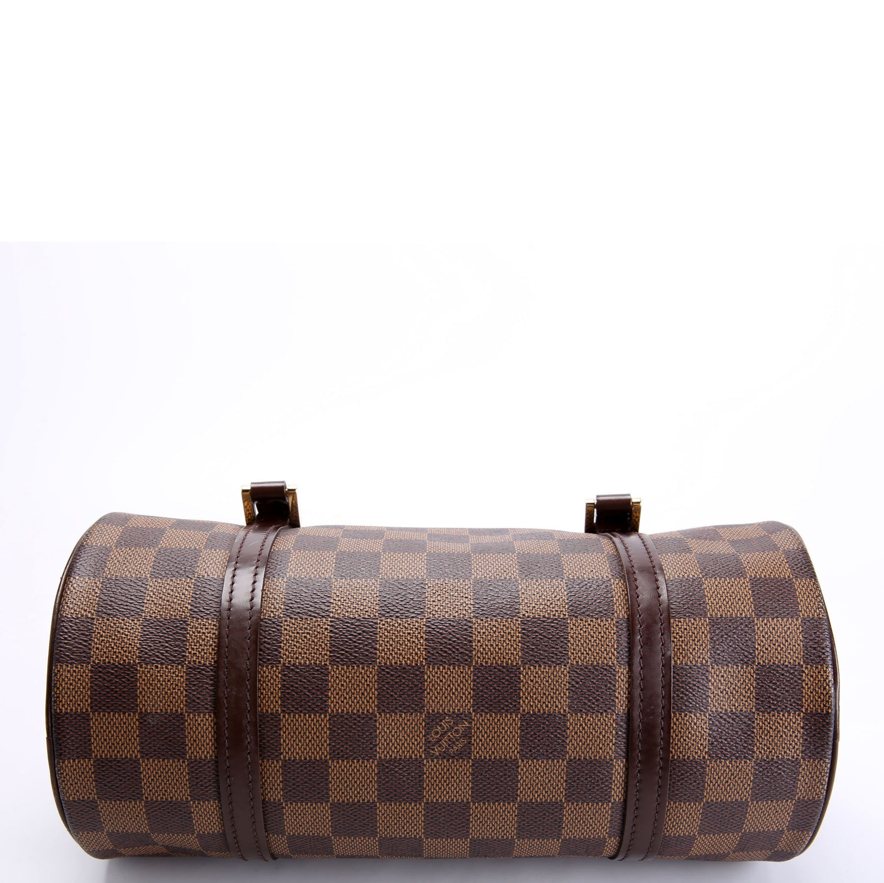 This pre-owned Louis Vuitton Papillon 26 10.5 is guaranteed 100% authentic. The exterior is in the classic Louis Vuitton Damier Ebene coated canvas.