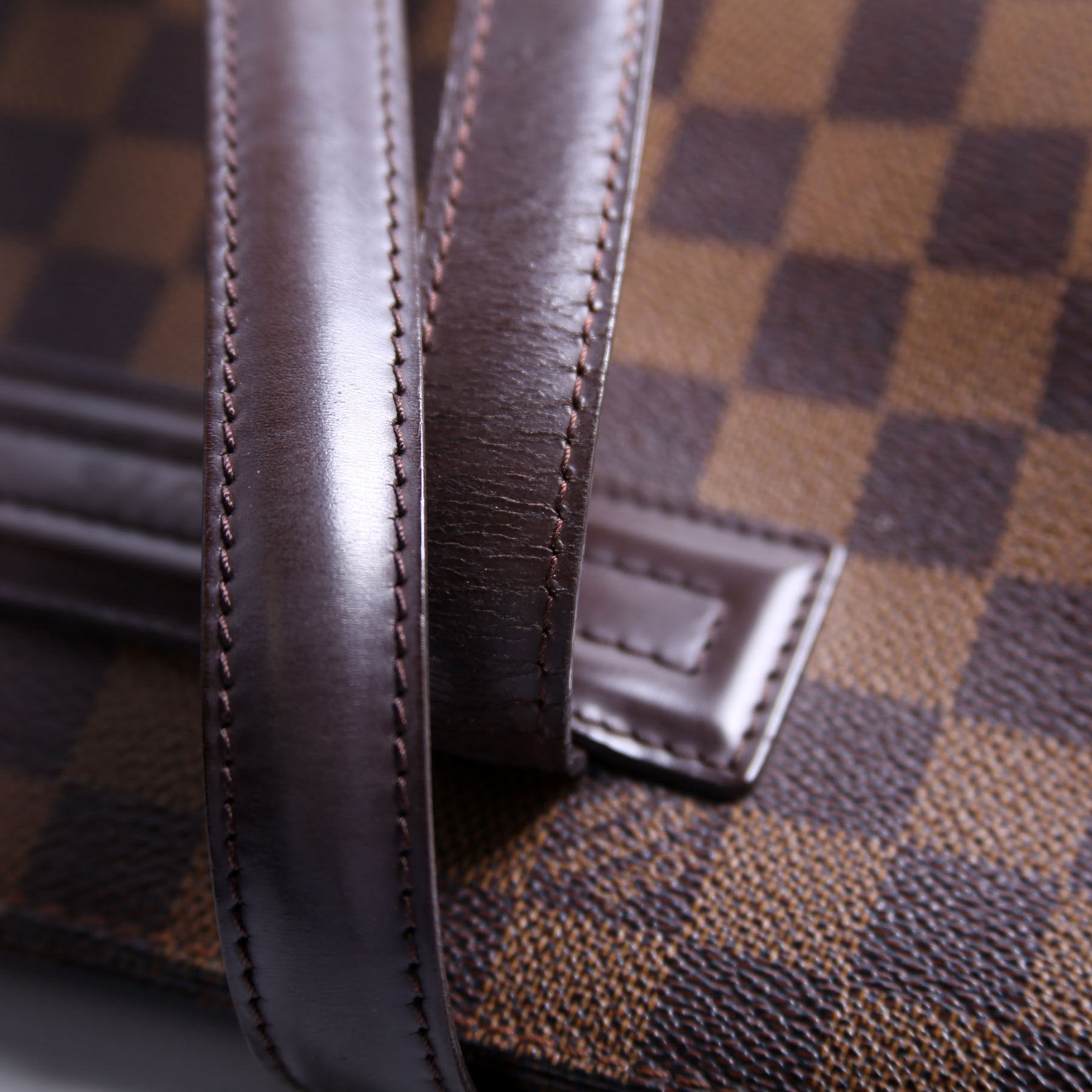 This pre-owned Louis Vuitton Parioli PM is guaranteed 100% authentic. The exterior is in the classic Louis Vuitton Damier Ebene coated canvas.