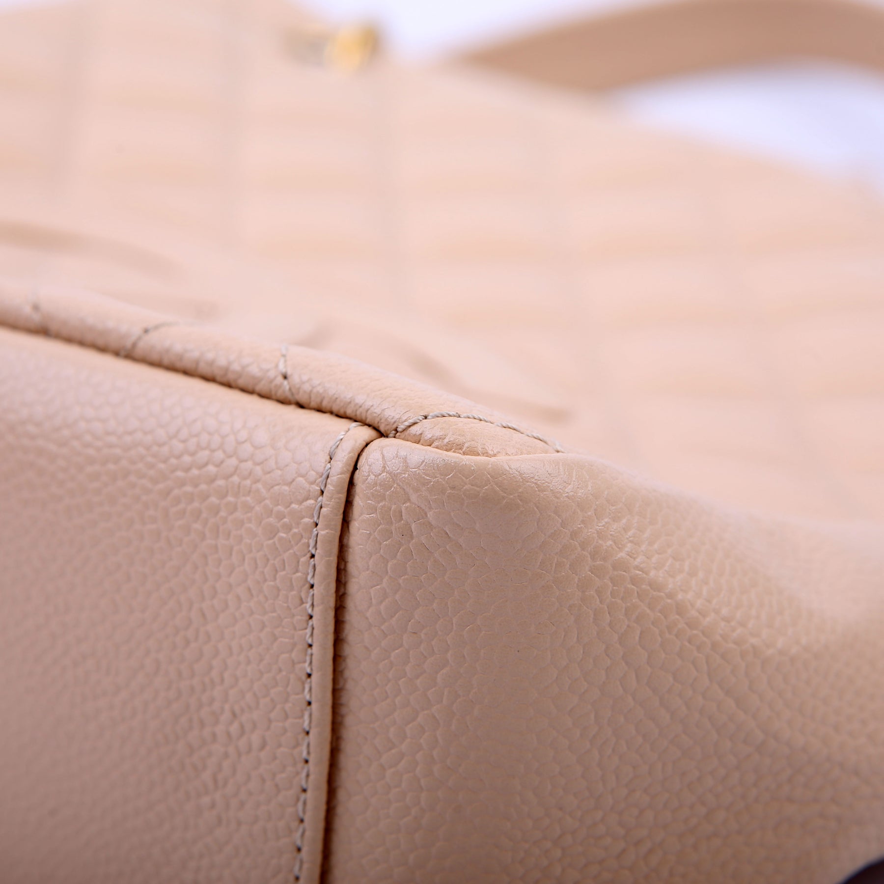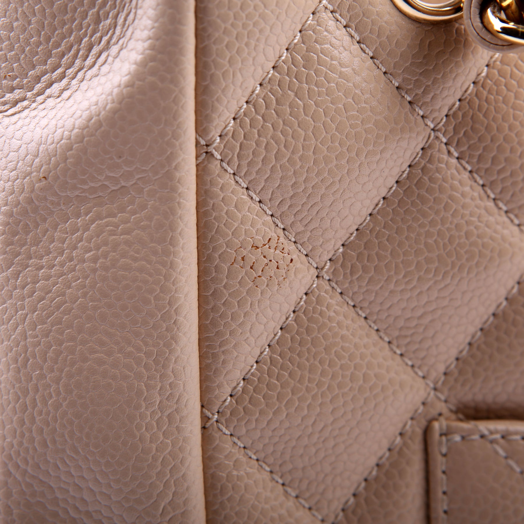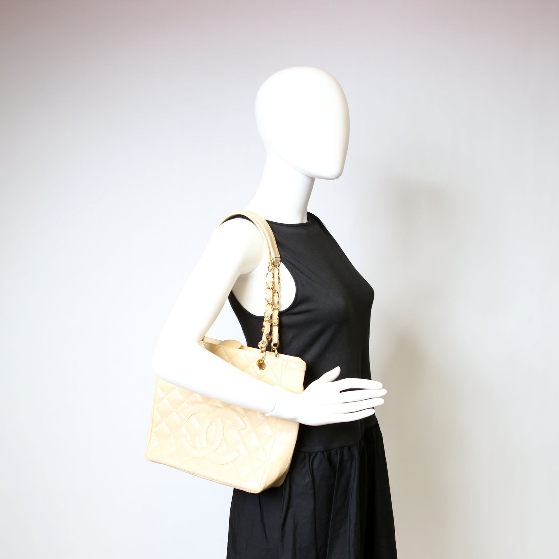 This pre-owned Chanel Petite Shopping Tote is guaranteed 100% authentic. The exterior is in the classic Caviar Leather.