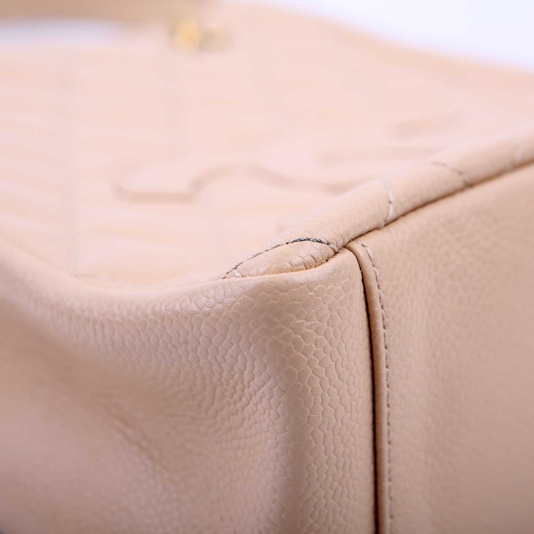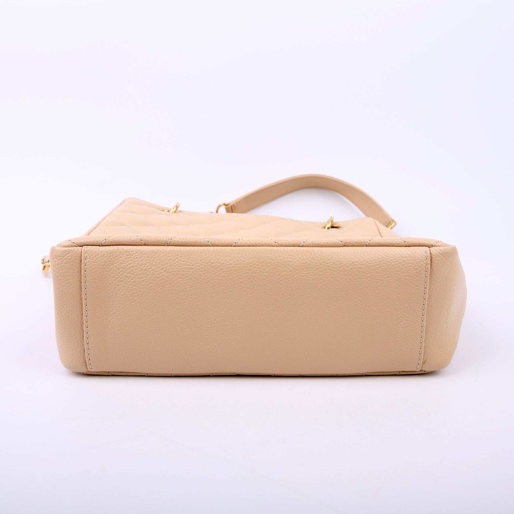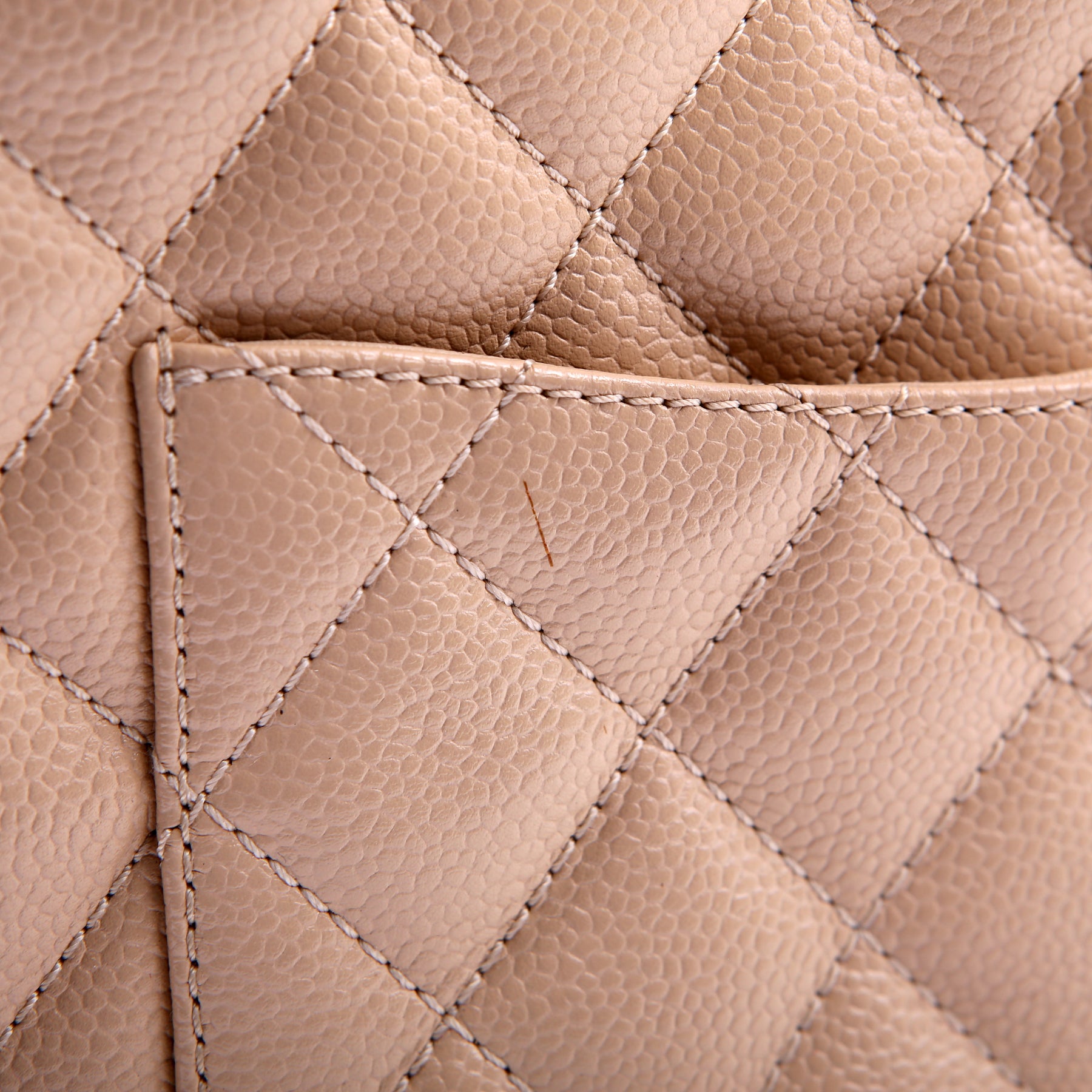 This pre-owned Chanel Petite Shopping Tote is guaranteed 100% authentic. The exterior is in the classic Caviar Leather.