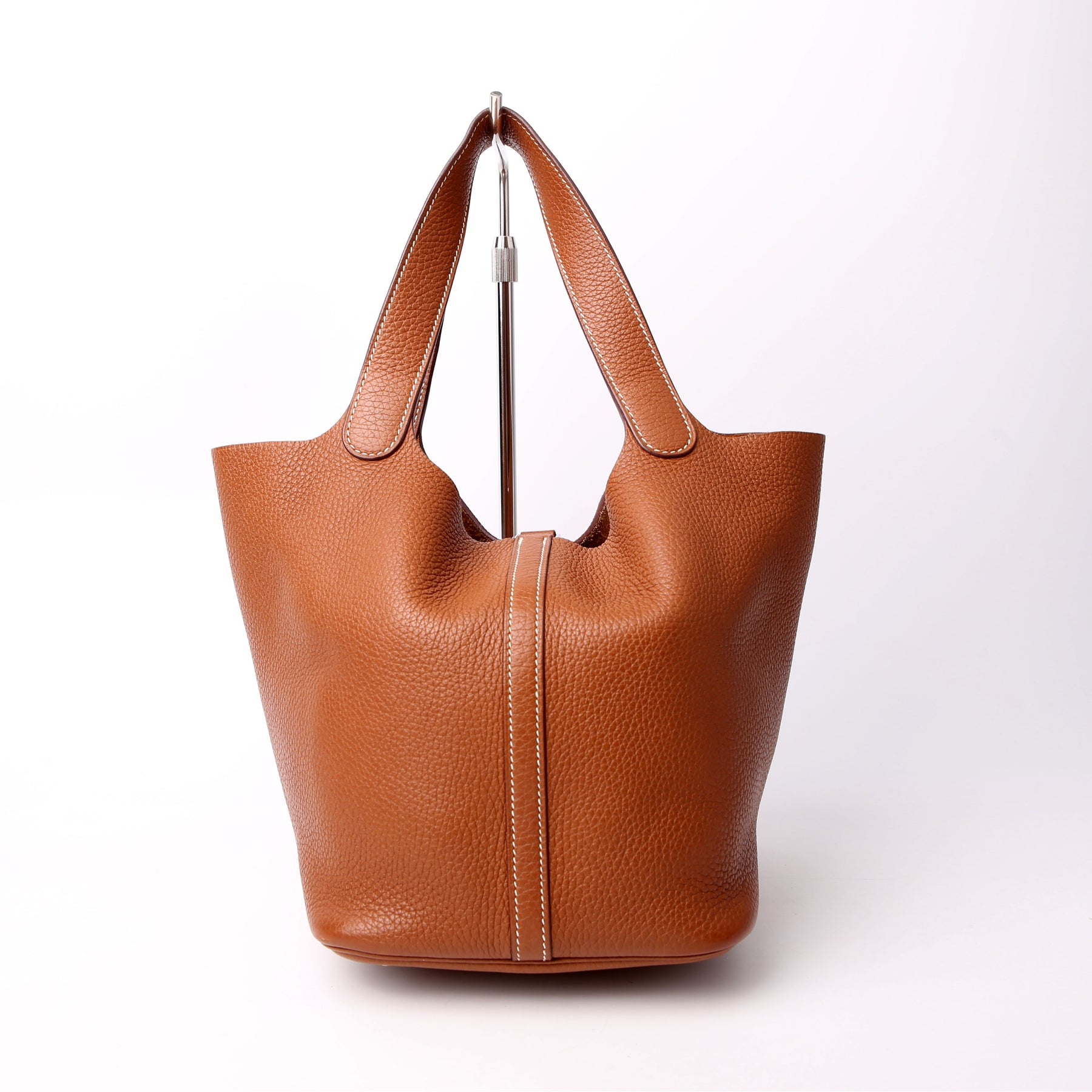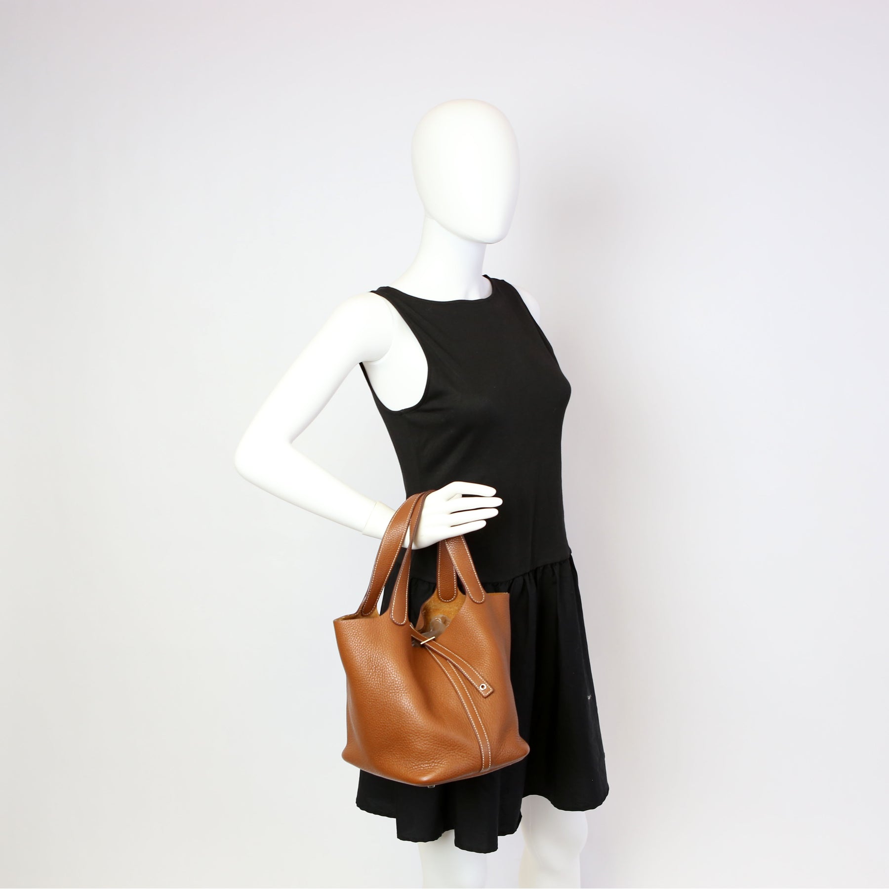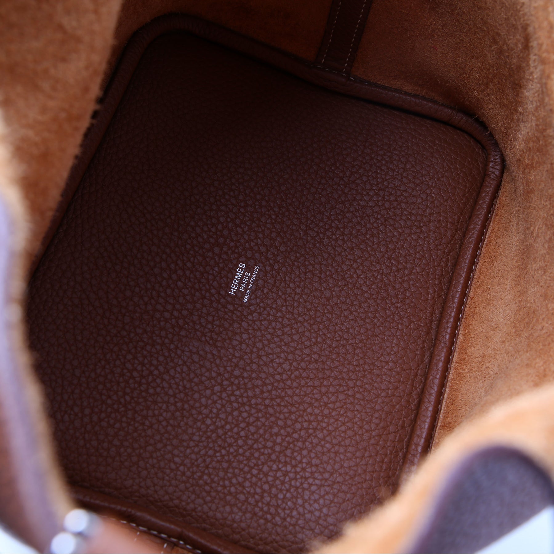 This pre-owned Hermes Picotin 18 is guaranteed 100% authentic. The exterior is in the classic Hermes Clemence leather.