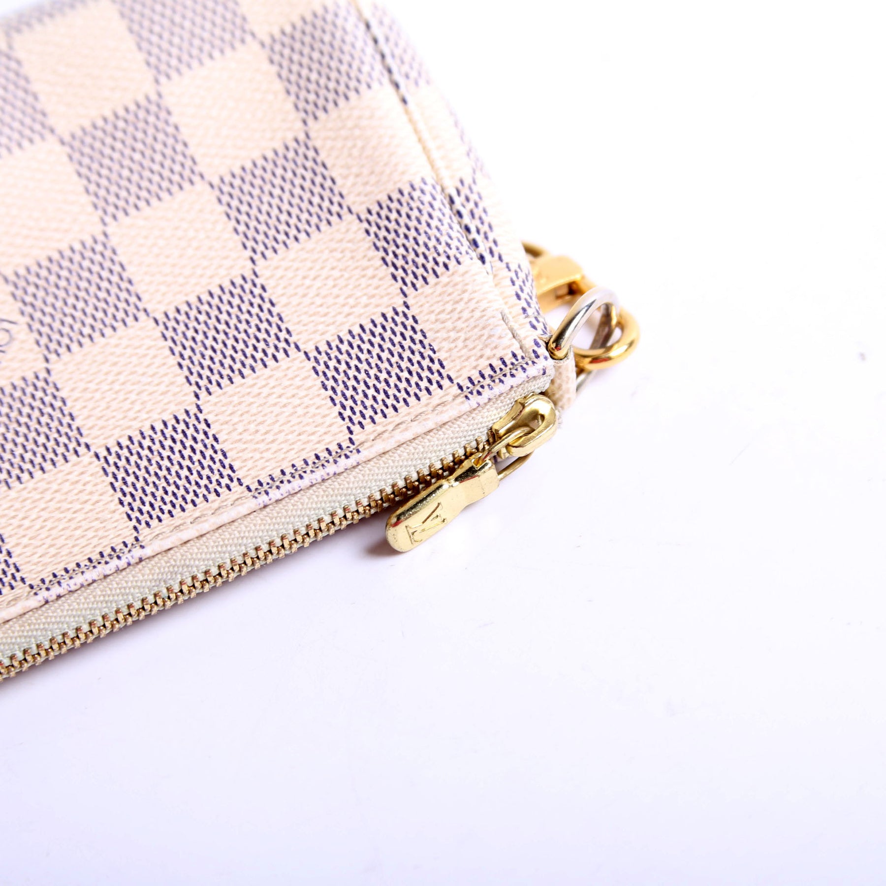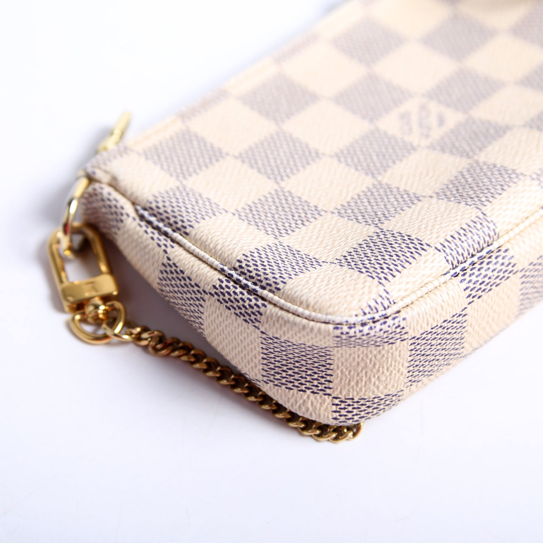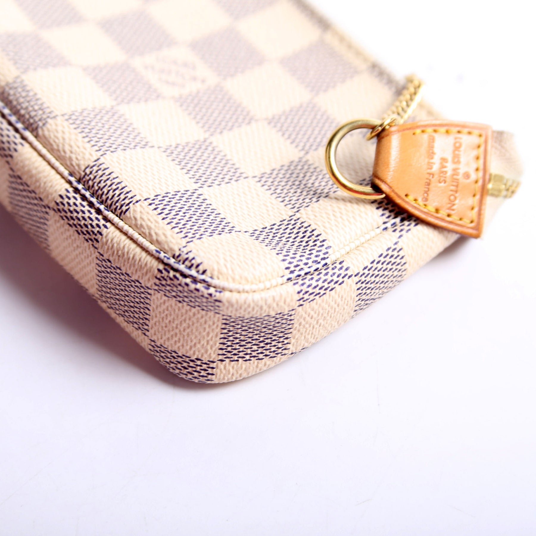 This pre-owned Louis Vuitton Pochette Accessories Mini is guaranteed 100% authentic. The exterior is in the classic Louis Vuitton Damier Azur coated canvas.